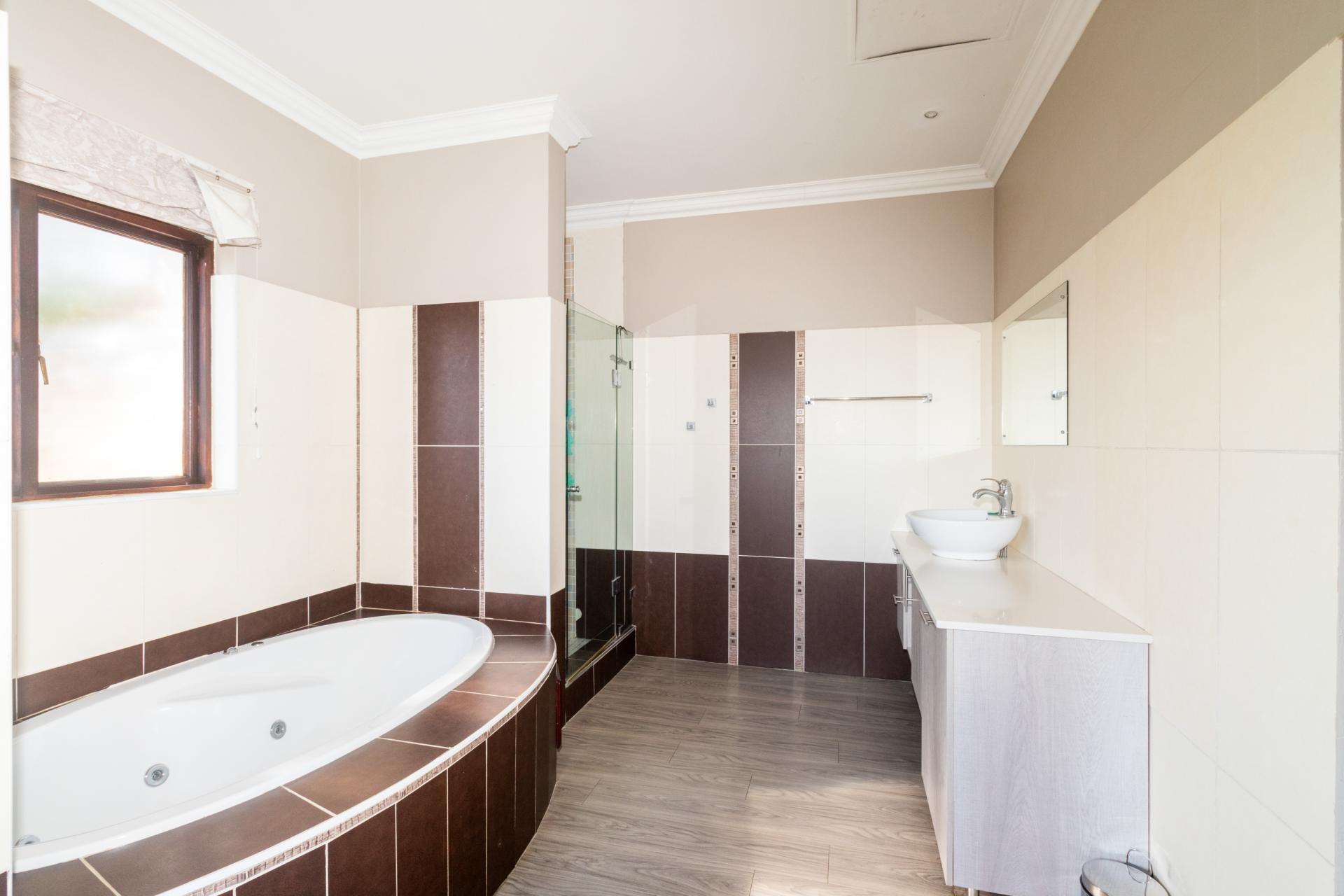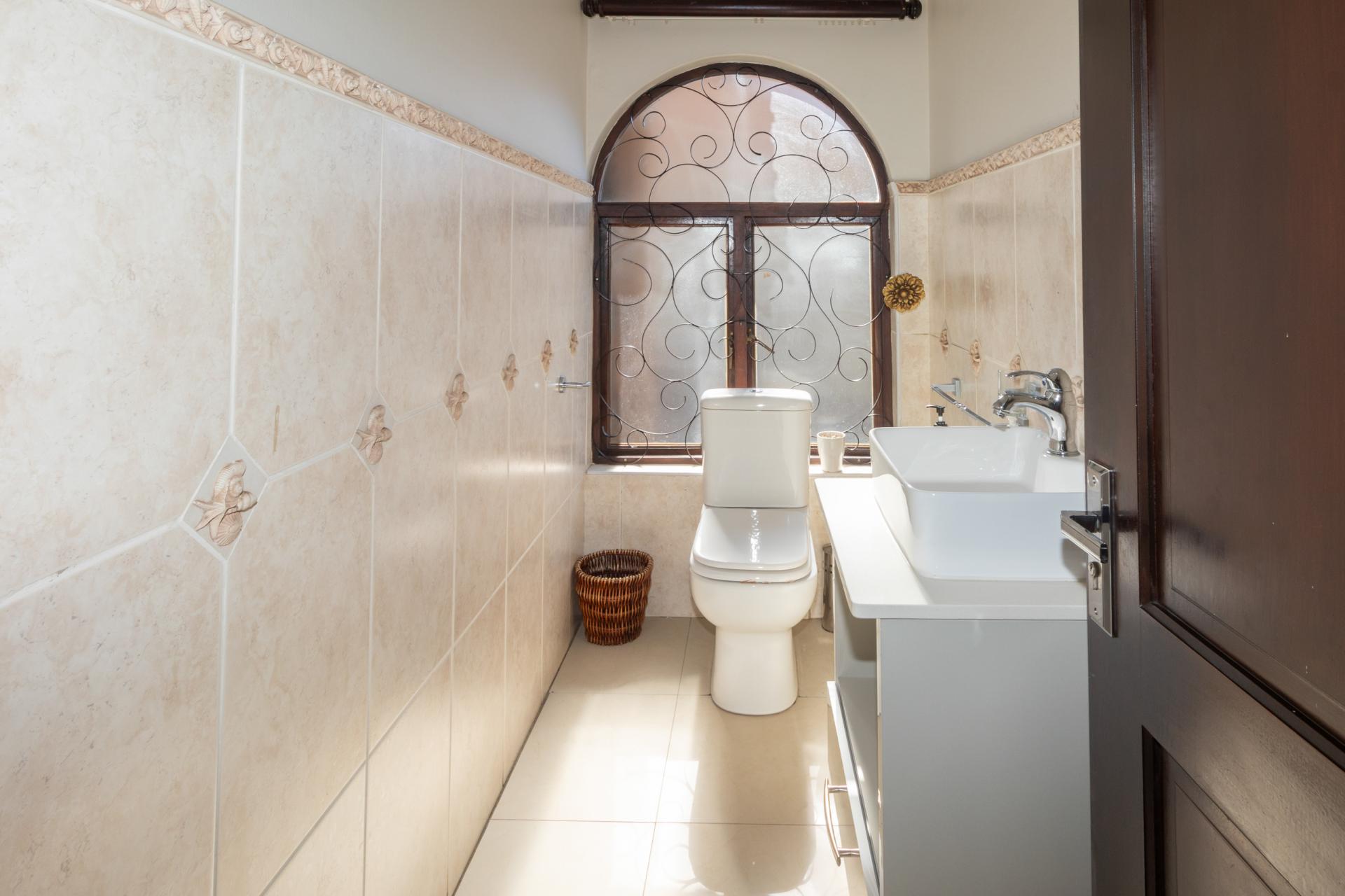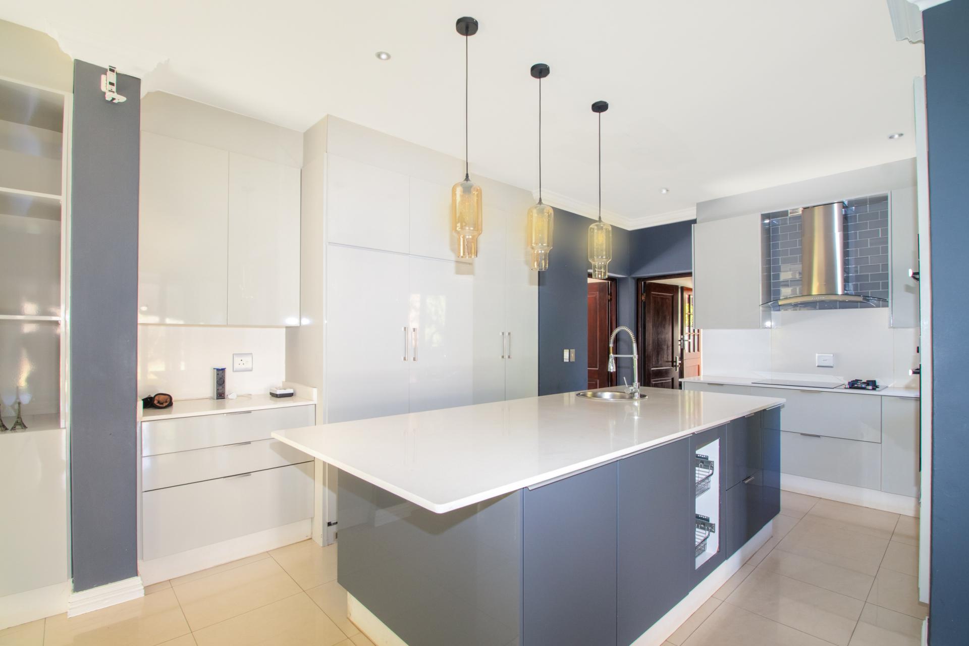 The heart of the home is a sleek, modern kitchen featuring a generous breakfast counter, ample cupboard space, and a separate scullery with room for two appliances. It effortlessly connects to a spacious dining area that opens out to the large, manicured garden — an idyllic space for kids, pets, and al fresco dining.