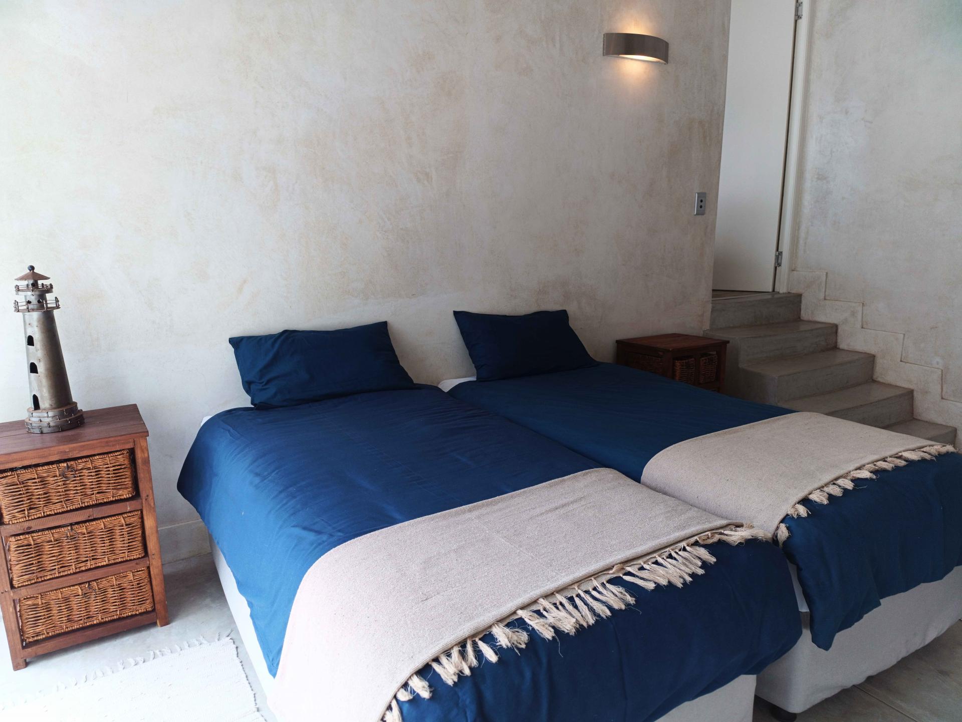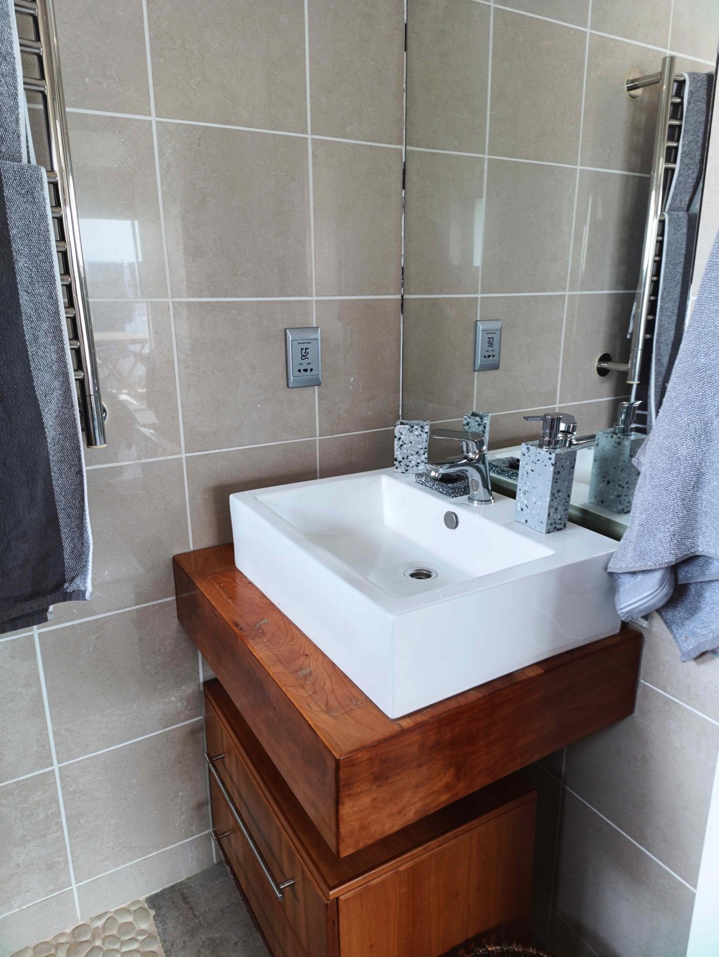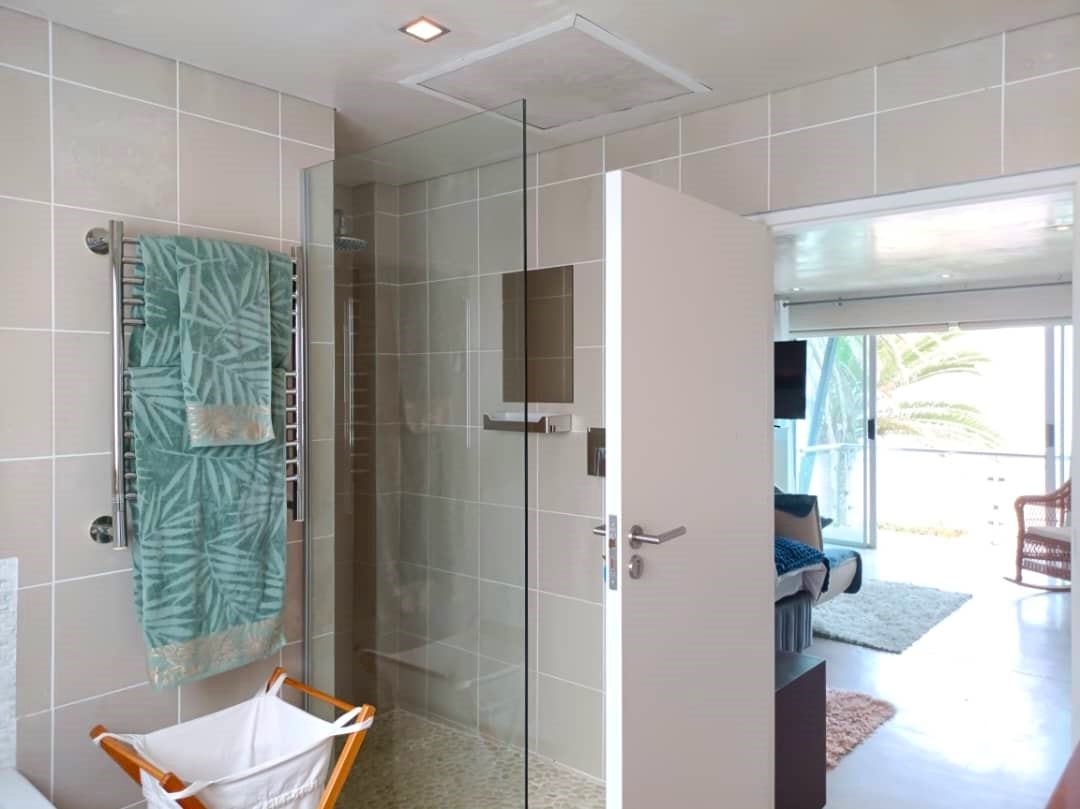 The private courtyard area at the back of the property has an outdoor shower which is perfect to rinse off after a sunny beach day, a basin, and easy access to the reception area of the main home, as well as the stairs to the flat.