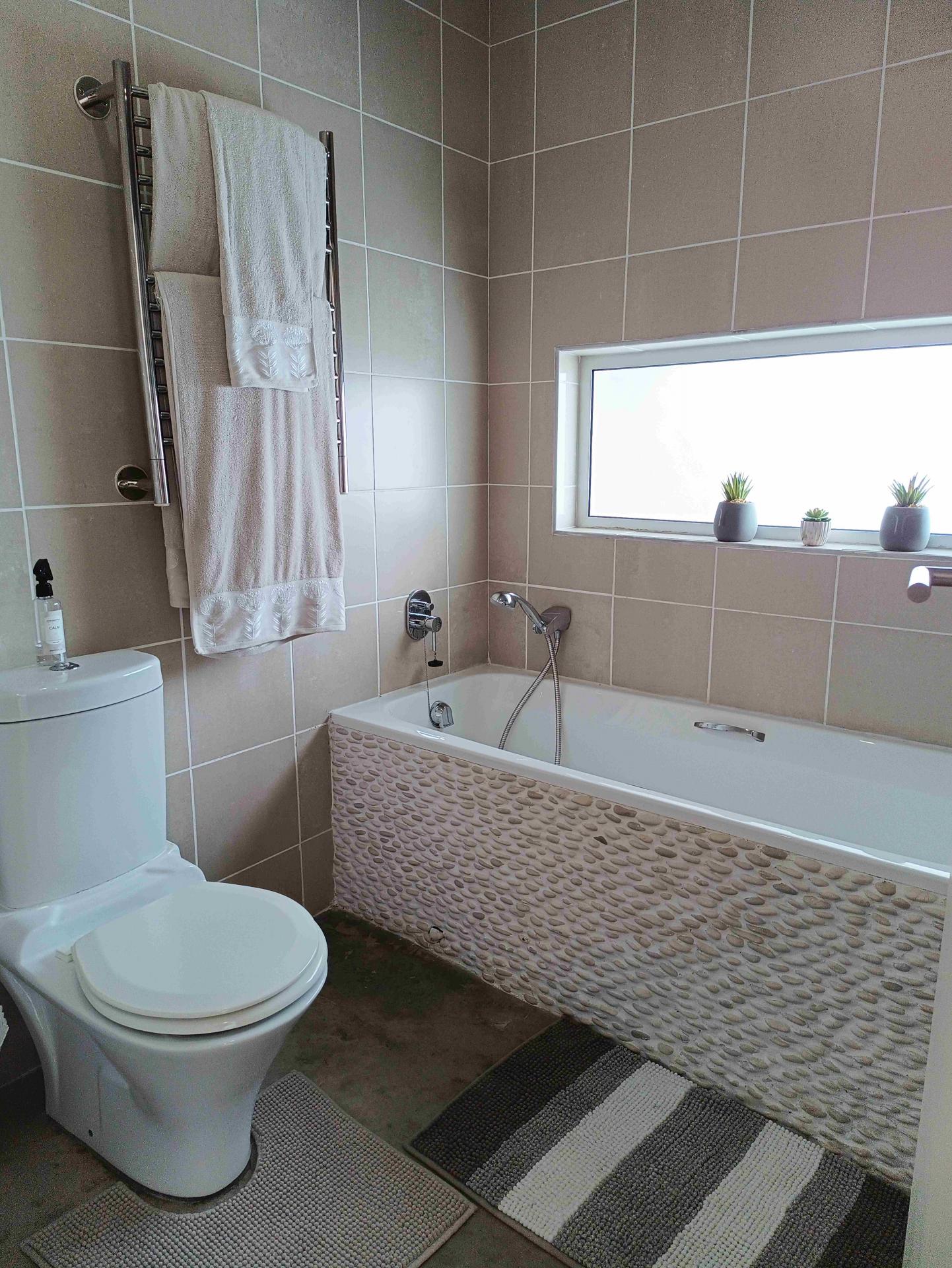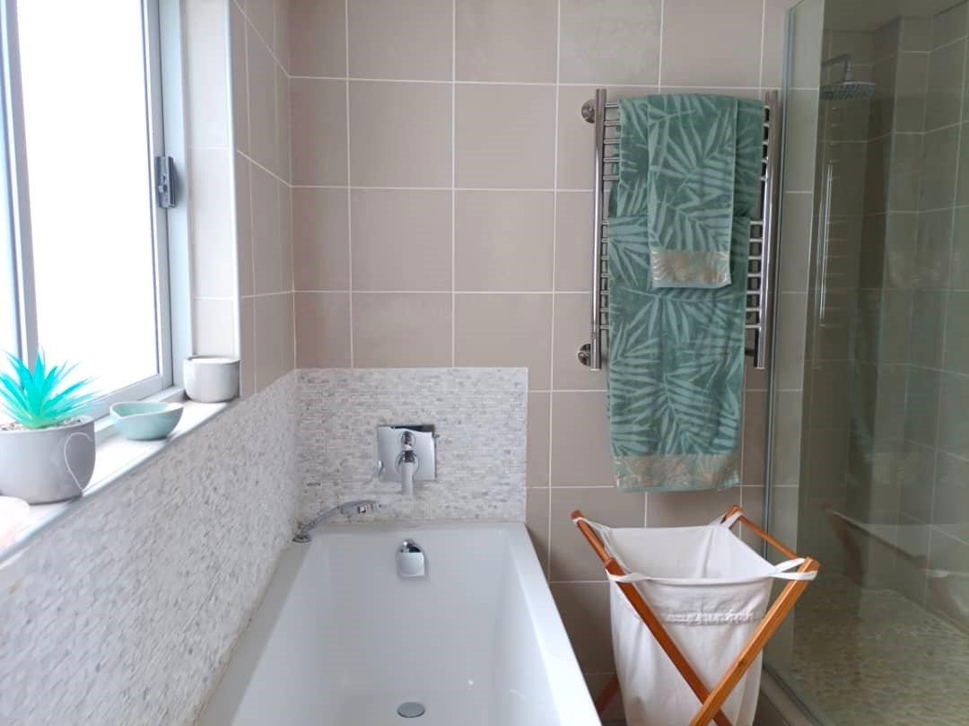 Two bathrooms, one with a bath, shower, basin, and toilet, and the second with a shower, basin, and toilet