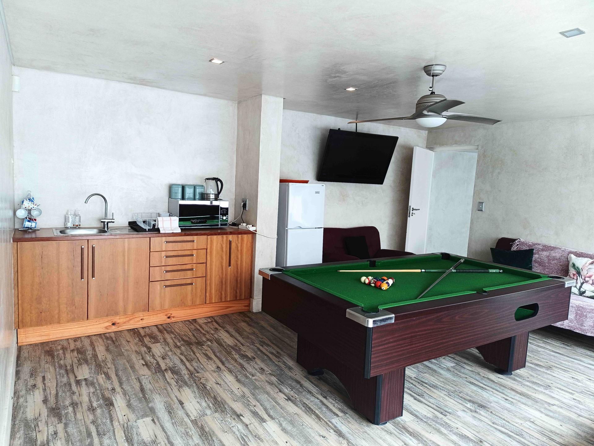 Positioned above the garage, the flat includes a kitchenette and open-plan living area with a spacious entertainment patio and outdoor BBQ