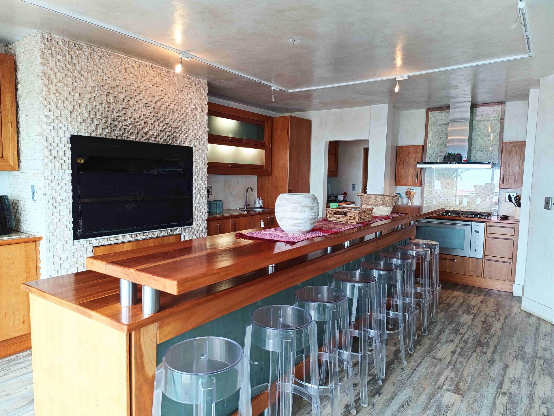 The home boasts uninterrupted ocean views from every room in the main house, except the TV room, where the sound of the waves beckons.