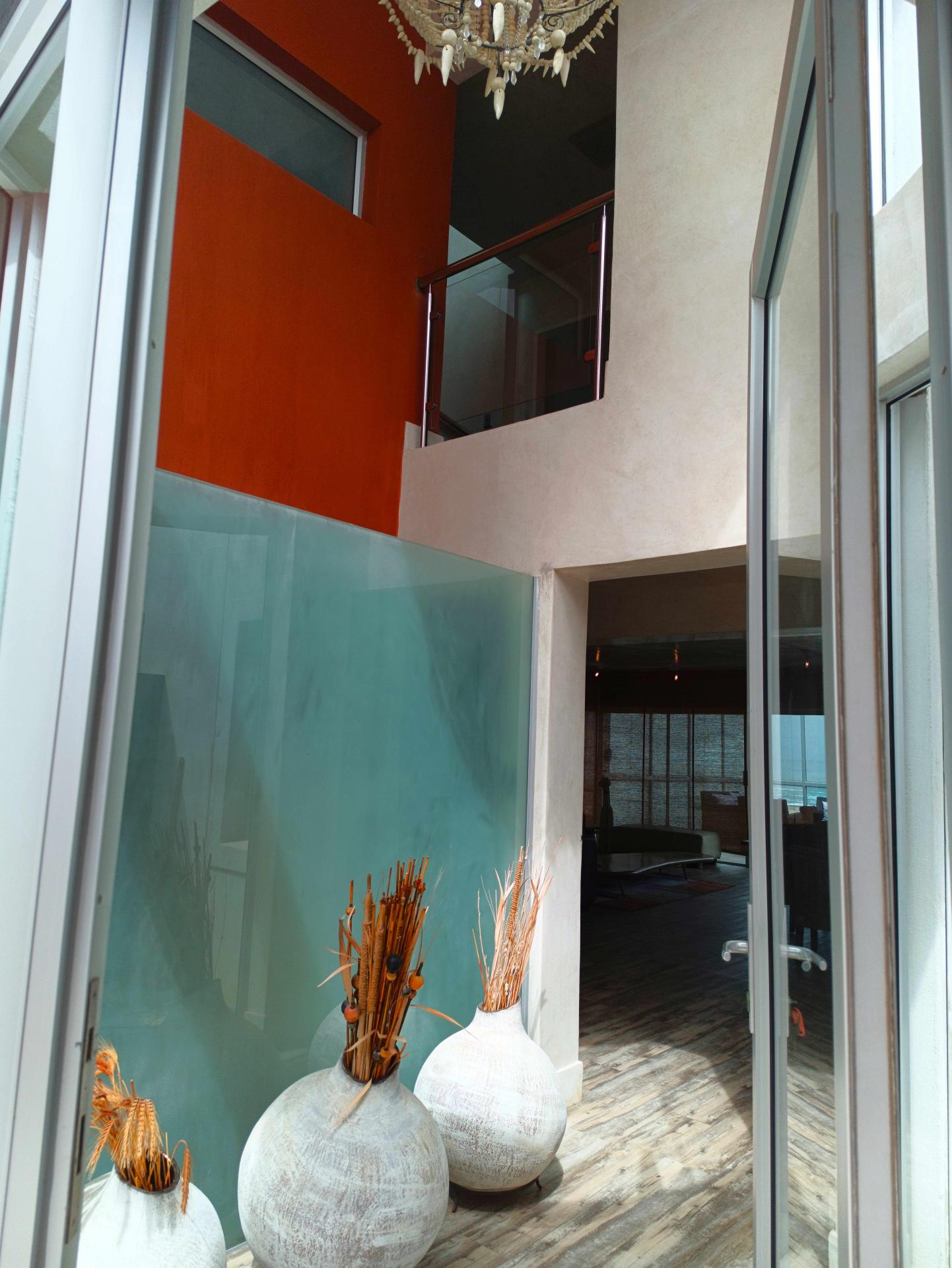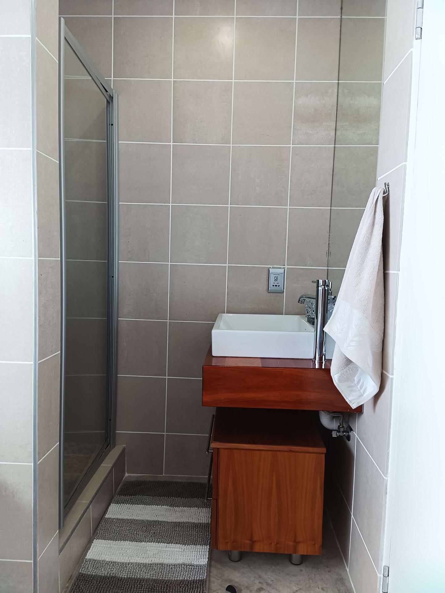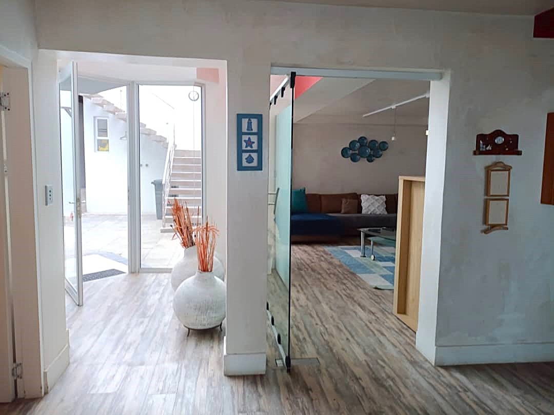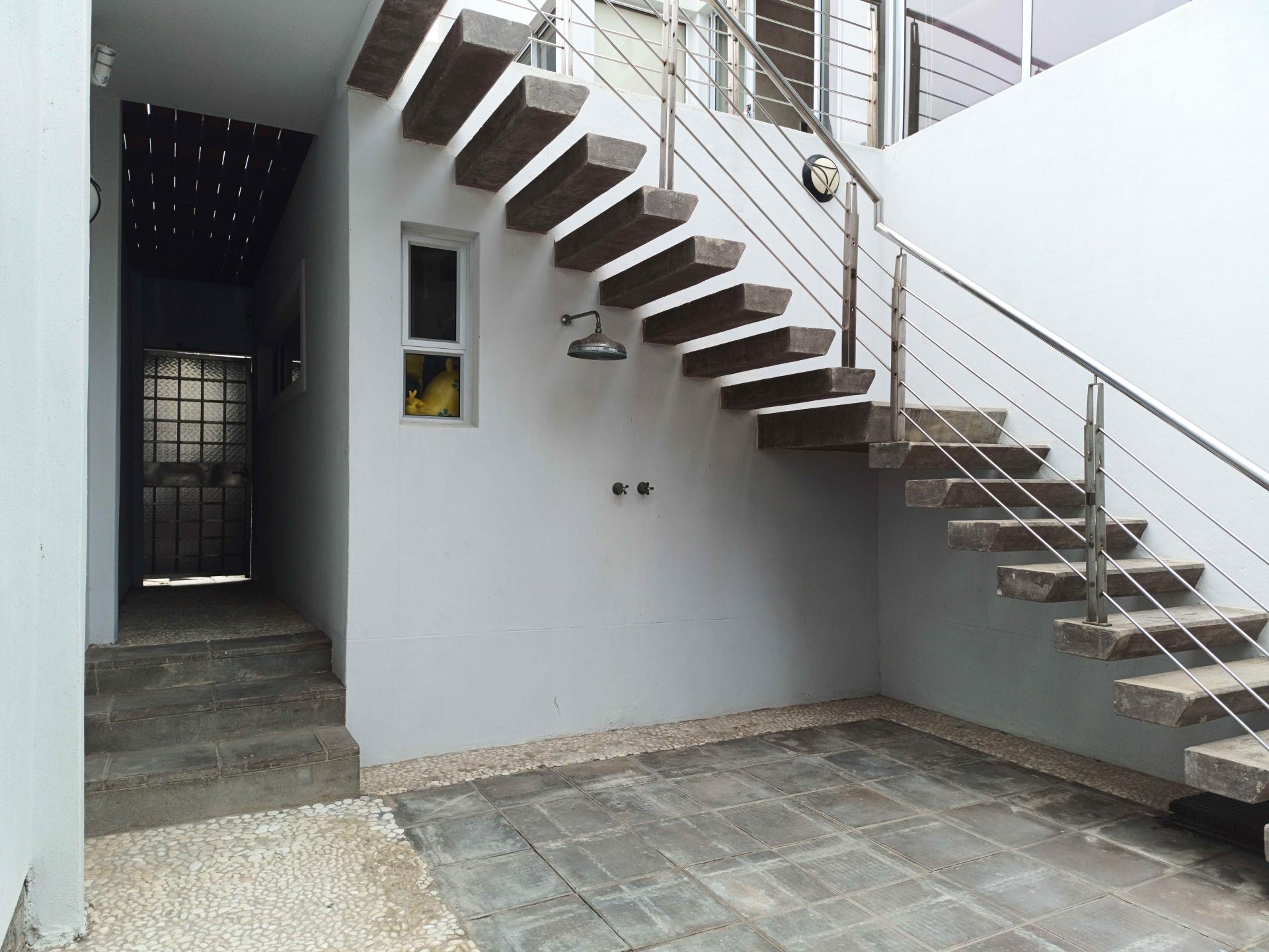 Private courtyard area at the back of the property with an outdoor shower, a basin, and easy access to the reception area of the main home and stairs to the flat