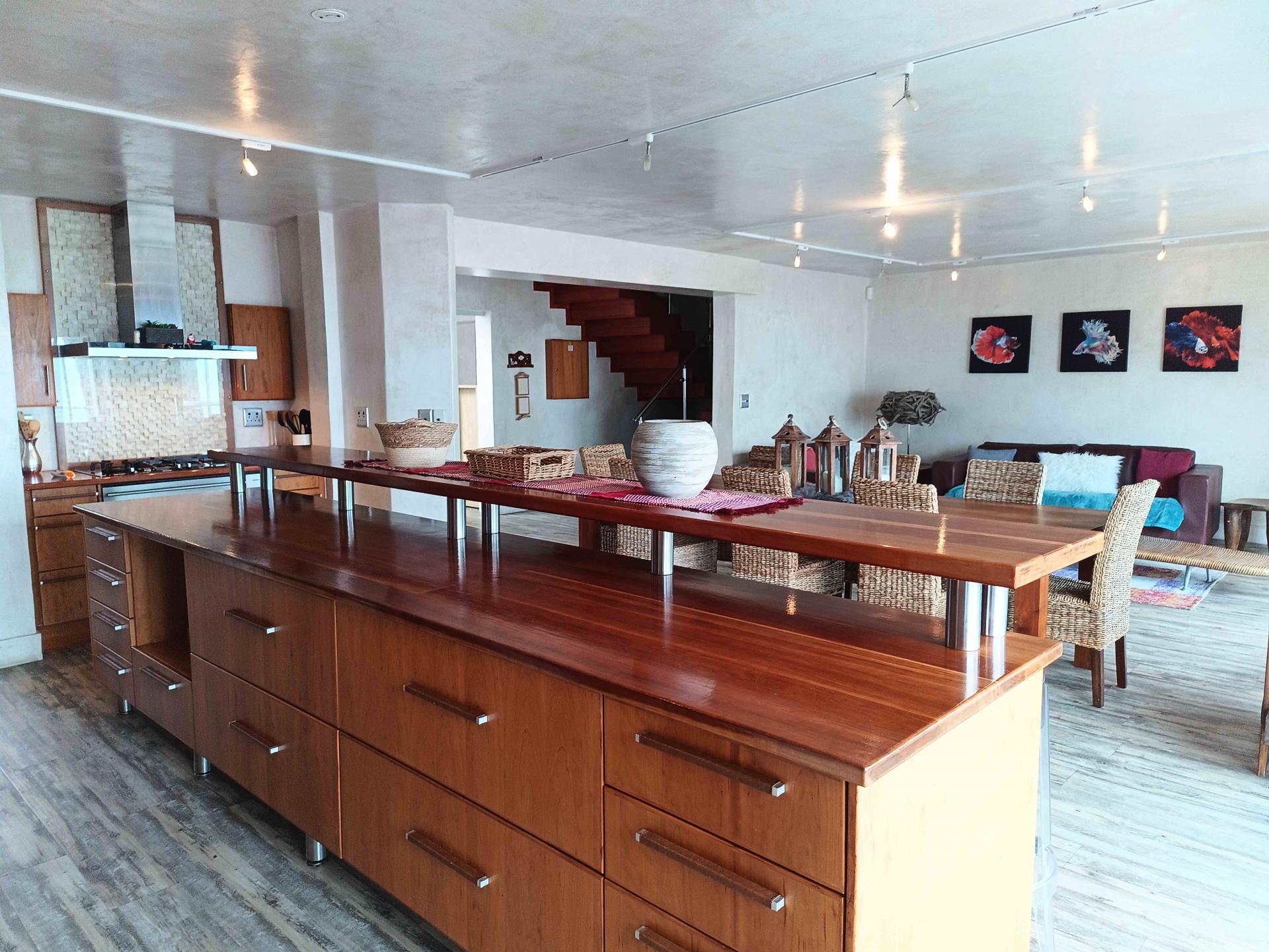 This exceptional beachside residence offers an eclectic blend of contemporary sophistication and rustic charm, nestled right on the coastline.