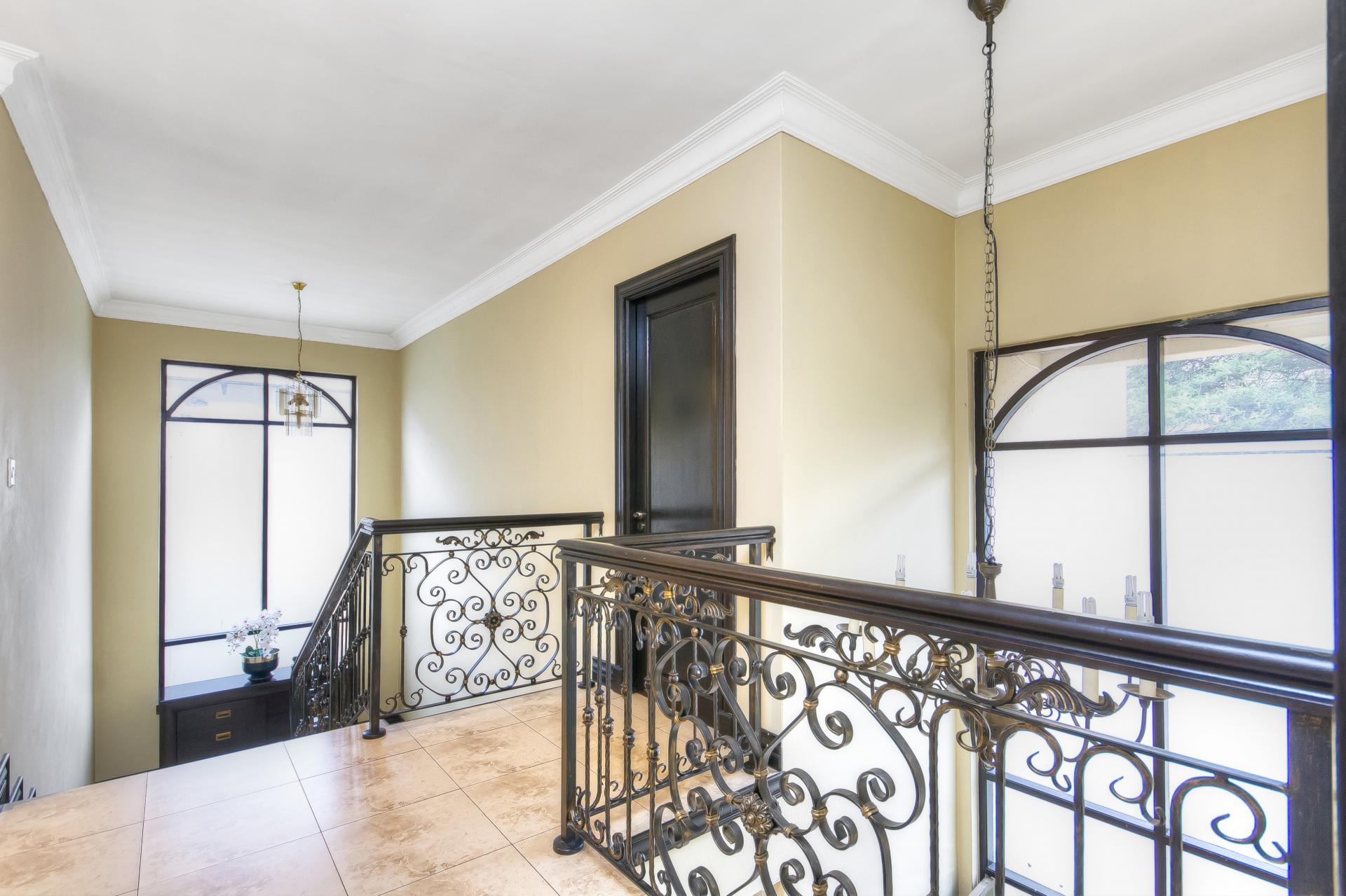 Upstairs, a beautiful travertine-tiled staircase leads to the spacious landing, continuing the elegant design throughout. The upper level features four well-appointed bedrooms, each designed for comfort and privacy: