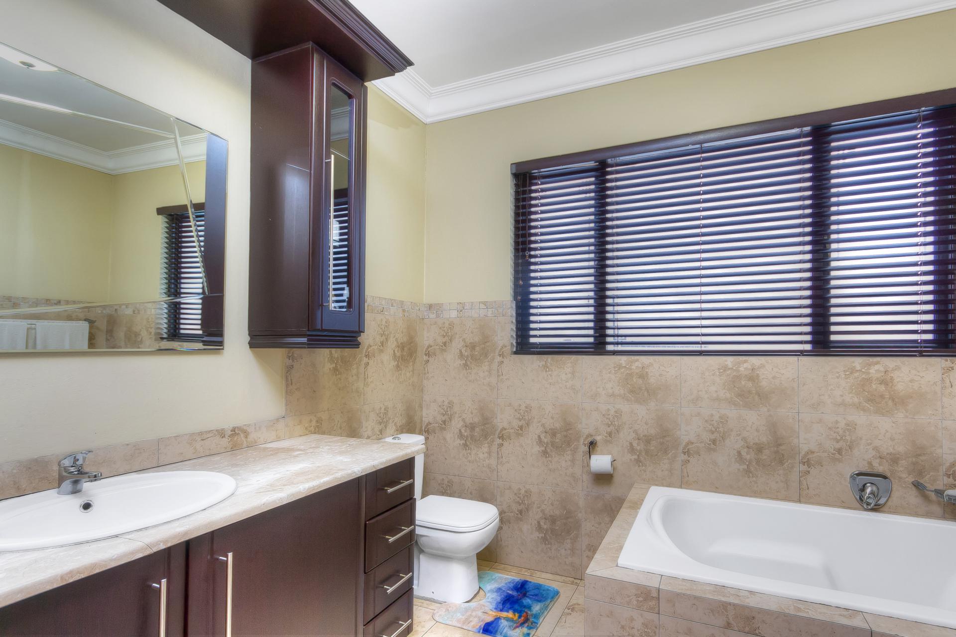 The second and third bedrooms share a separate full bathroom featuring travertine tiles throughout, a luxurious countertop, a shower, and a large bath, providing a spa-like retreat.