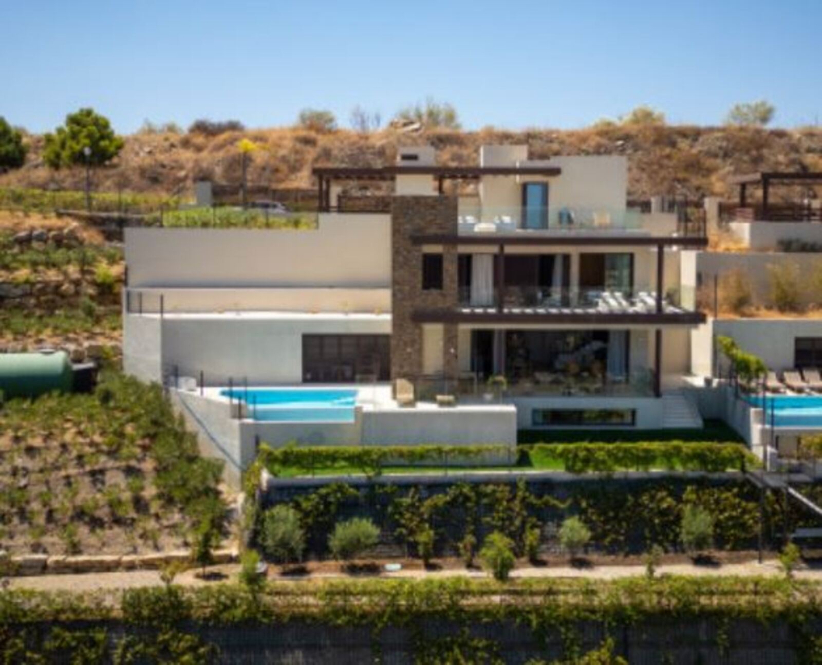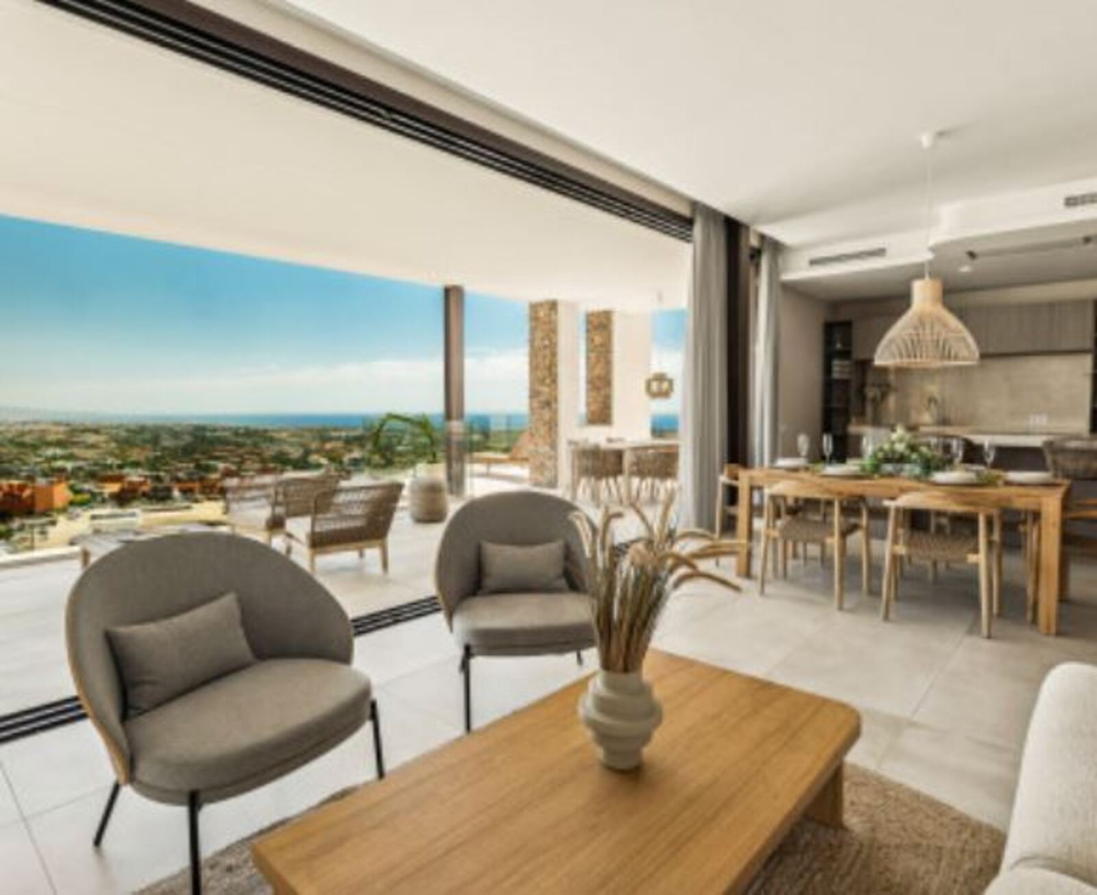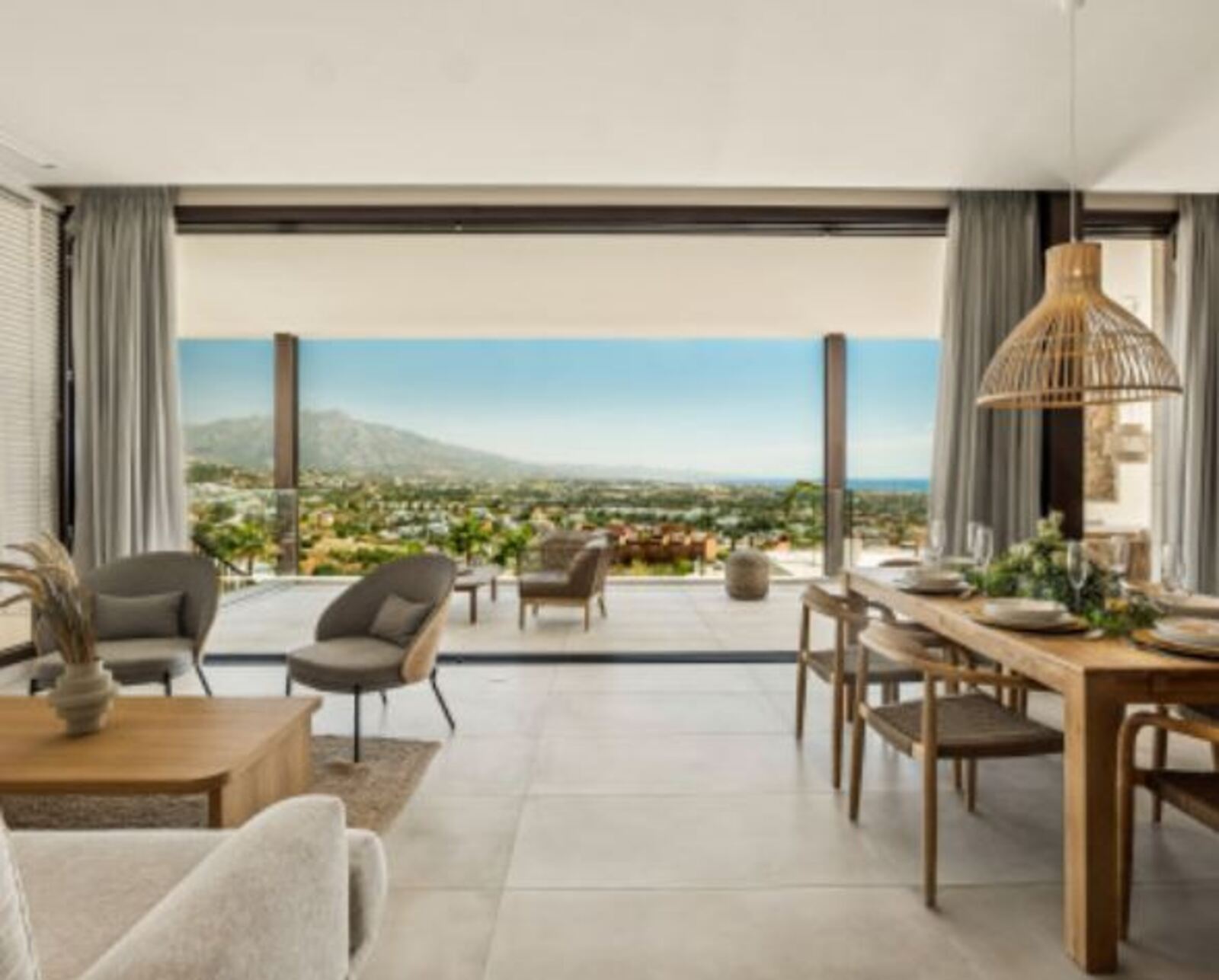 - Floor to ceiling glass doors expansive terraces infinity pool panoramic Mediterranean views