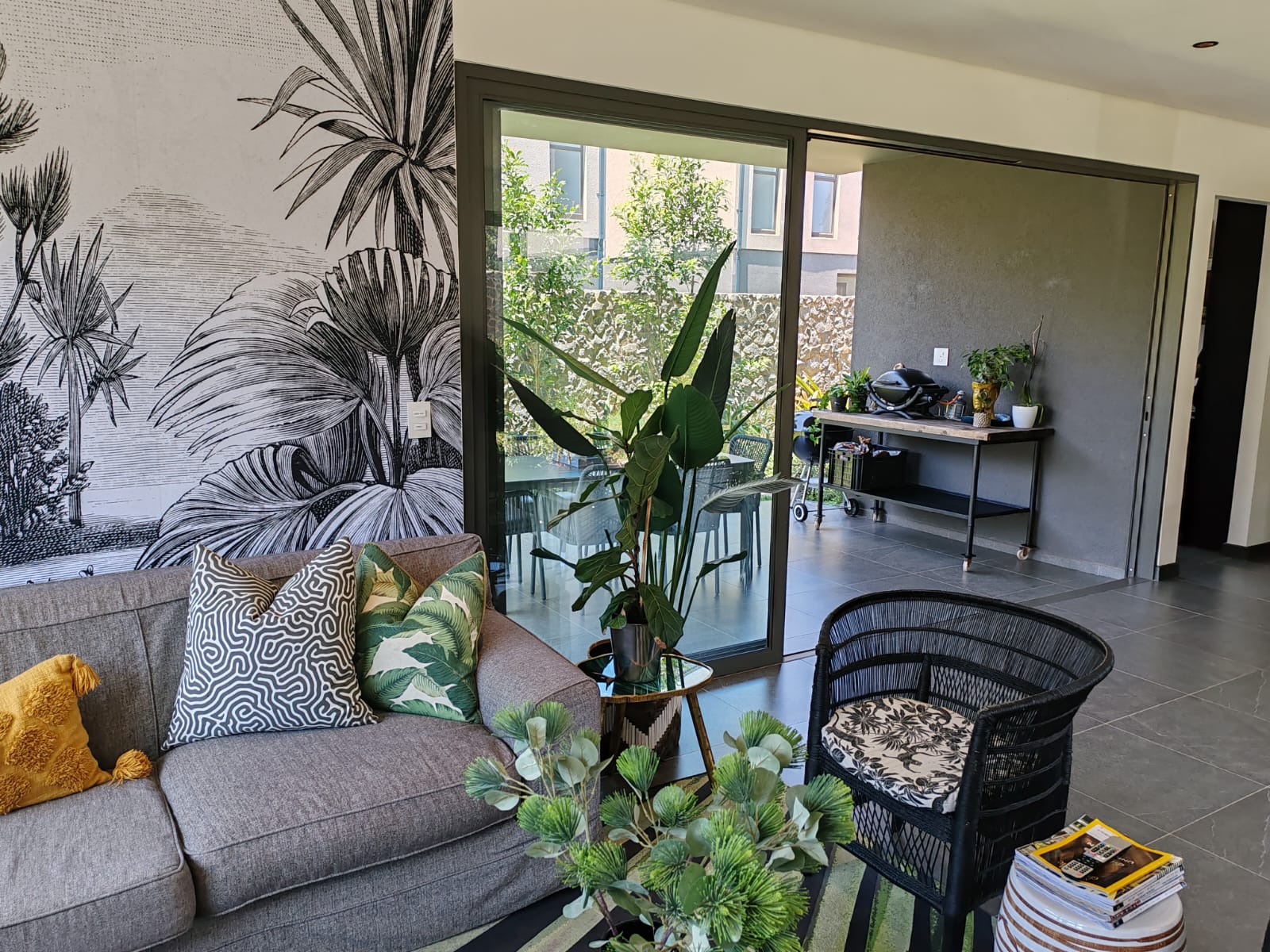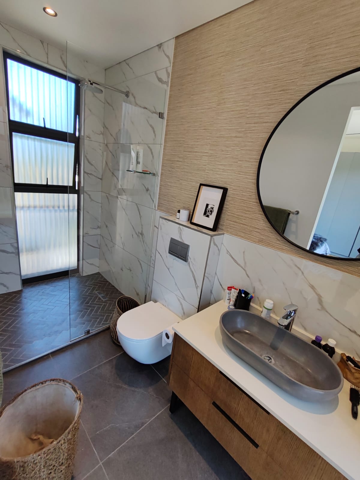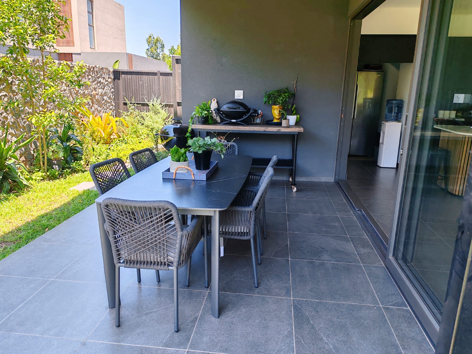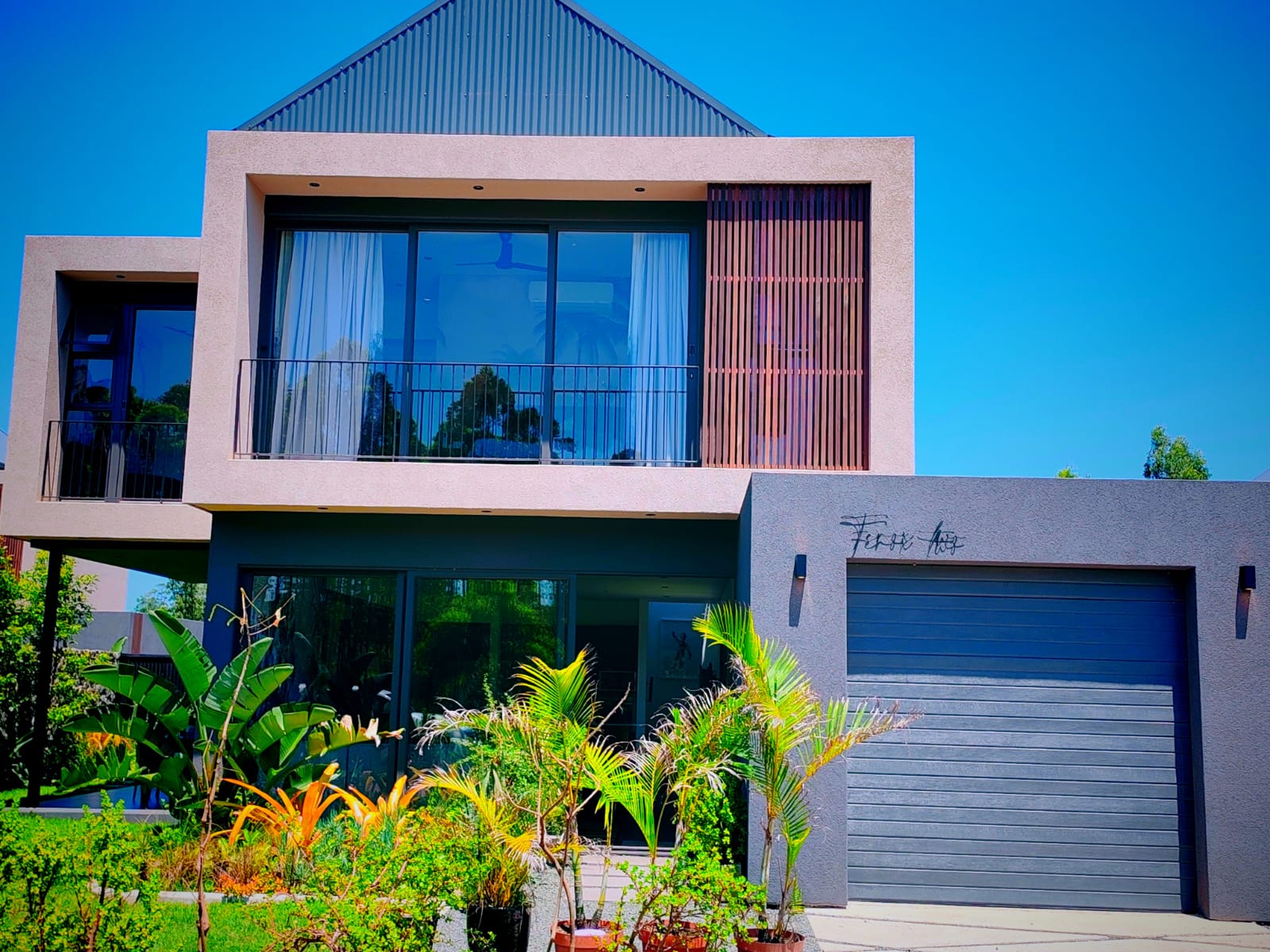 A beautiful 4-bedroom home nestled in in Elaleni estate. This stunning home is part of the holistic Elaleni estate, known for its equilibrium with nature, communal gardens where one gathers ones veg and fruit on the way home from work, lovely walking trails through the green belts, Fig forest Leisure Centre with 25m sized training pool, splash pool ,water slide, pizza oven and entertainment braai area, jungle gyms and club house with restaurant, yoga areas and relaxation areas to work in or just relax. The home has 4 bedrooms, 2 bathrooms with one en-suite, a spacious lounge dining area with a well-equipped kitchen complete with high end appliances. The covered outside patio allows for entertainment. A garage with electric doors and wooden deck platform