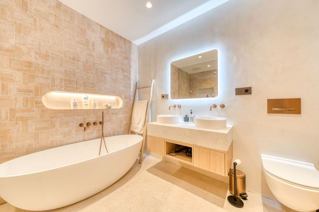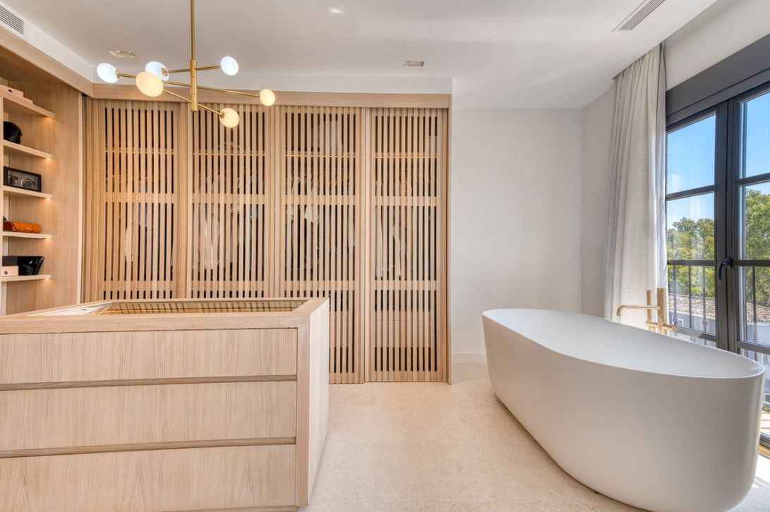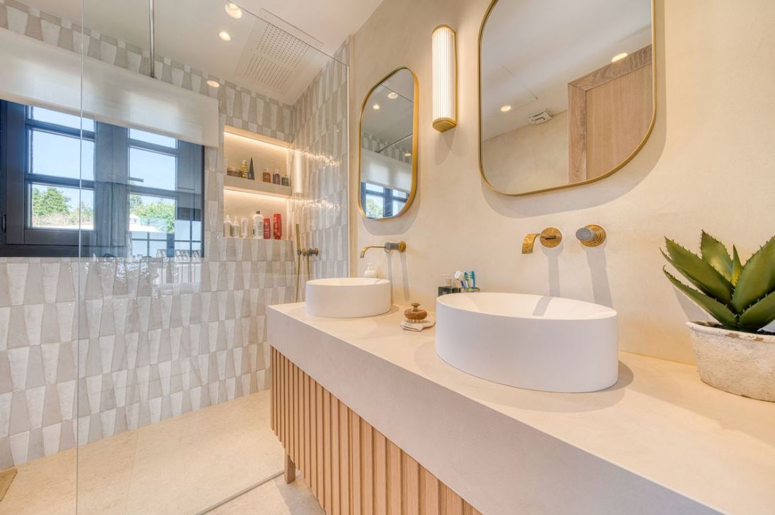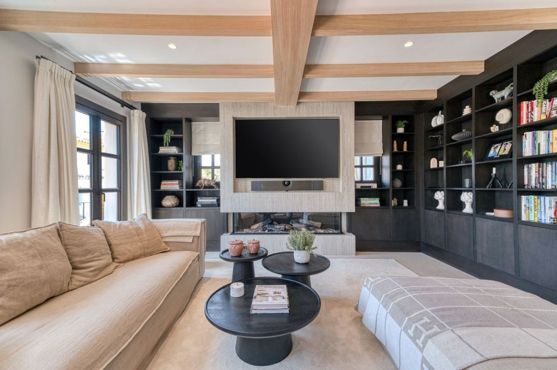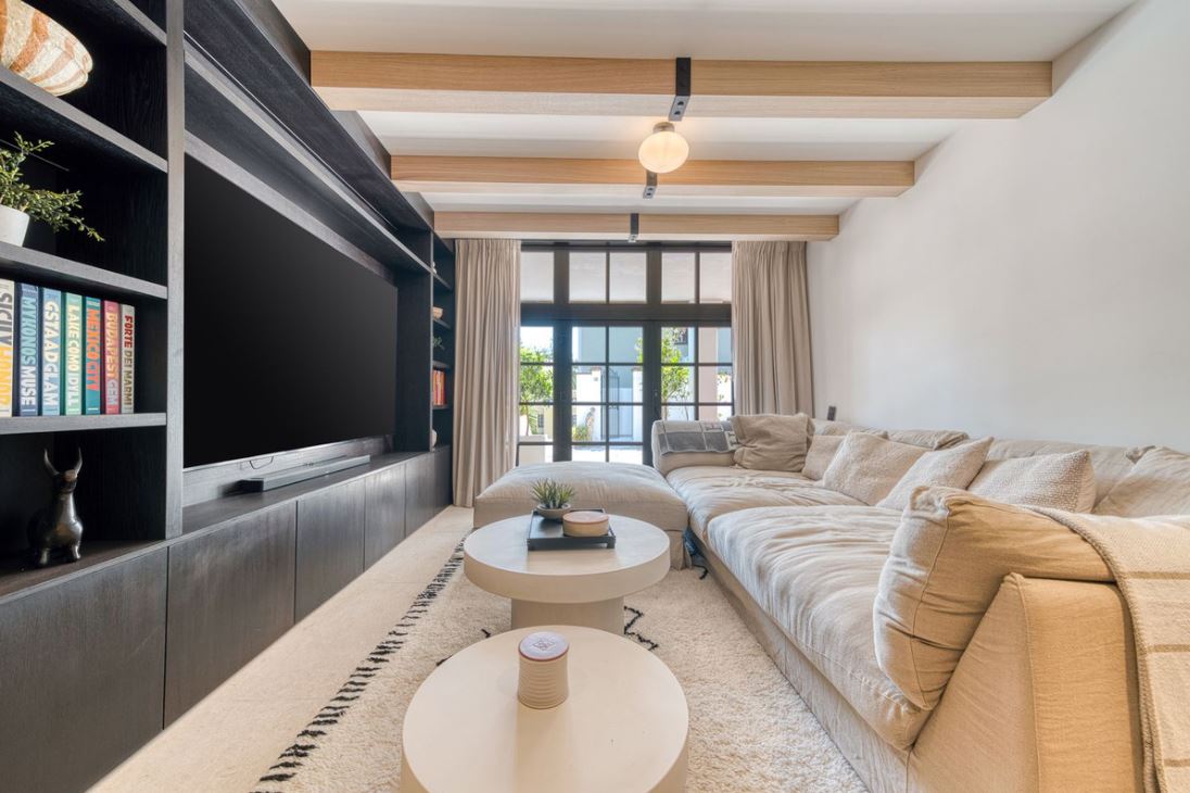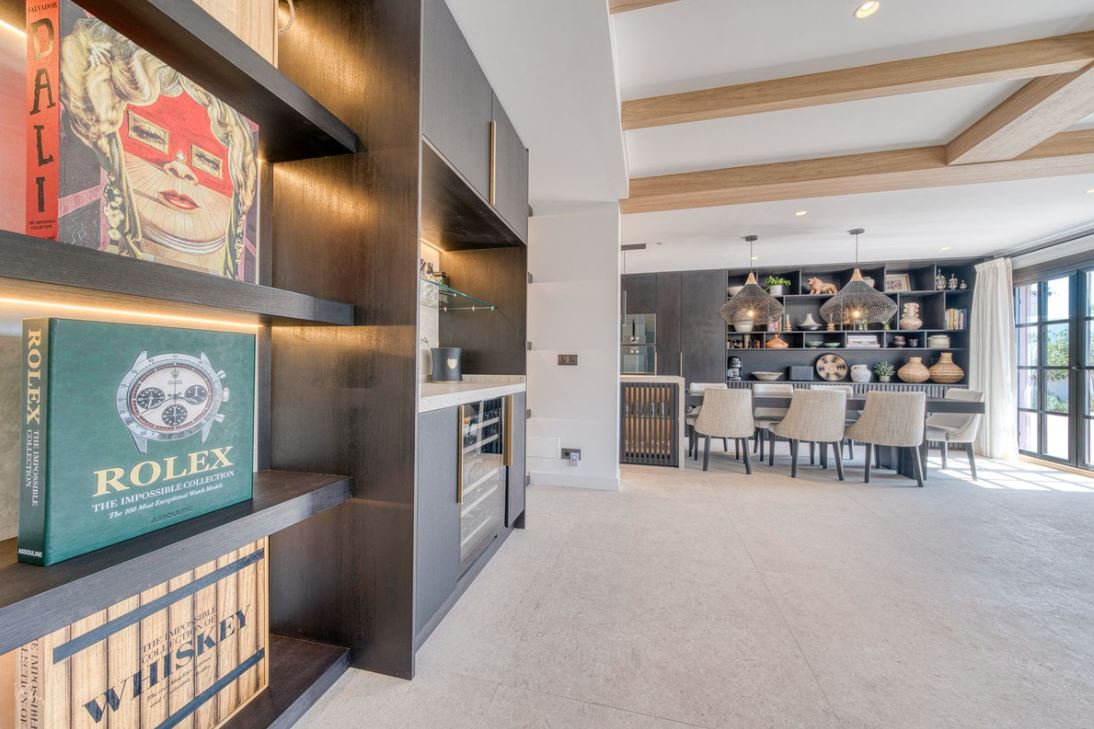 You enter this stunning home via a sun-drenched courtyard, ideal for alfresco dining, and step into a home where every detail has been carefully curated. The main floor flows beautifully, featuring a designer kitchen with Gaggenau fitted appliances, a central island, and a generous dining area. The open-plan living room is framed by limed oak ceiling beams and oversized sliding doors that lead onto a spacious terrace, flooding the space with light and connecting indoor and outdoor living. Downstairs, the lower level is all about comfort and entertainment, offering a private cinema lounge with an oversized sofa, a secondary kitchen and bar, wine display, and two beautifully appointed guest suites, each with its own bathroom and access to a covered terrace. Upstairs, the master suite is a tranquil escape with a dressing room, full en-suite bathroom, and a beautiful free standing bathtub. A fourth bedroom completes the level, ideal for family or additional guests.