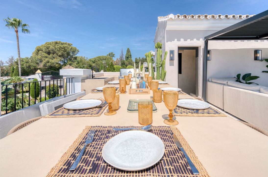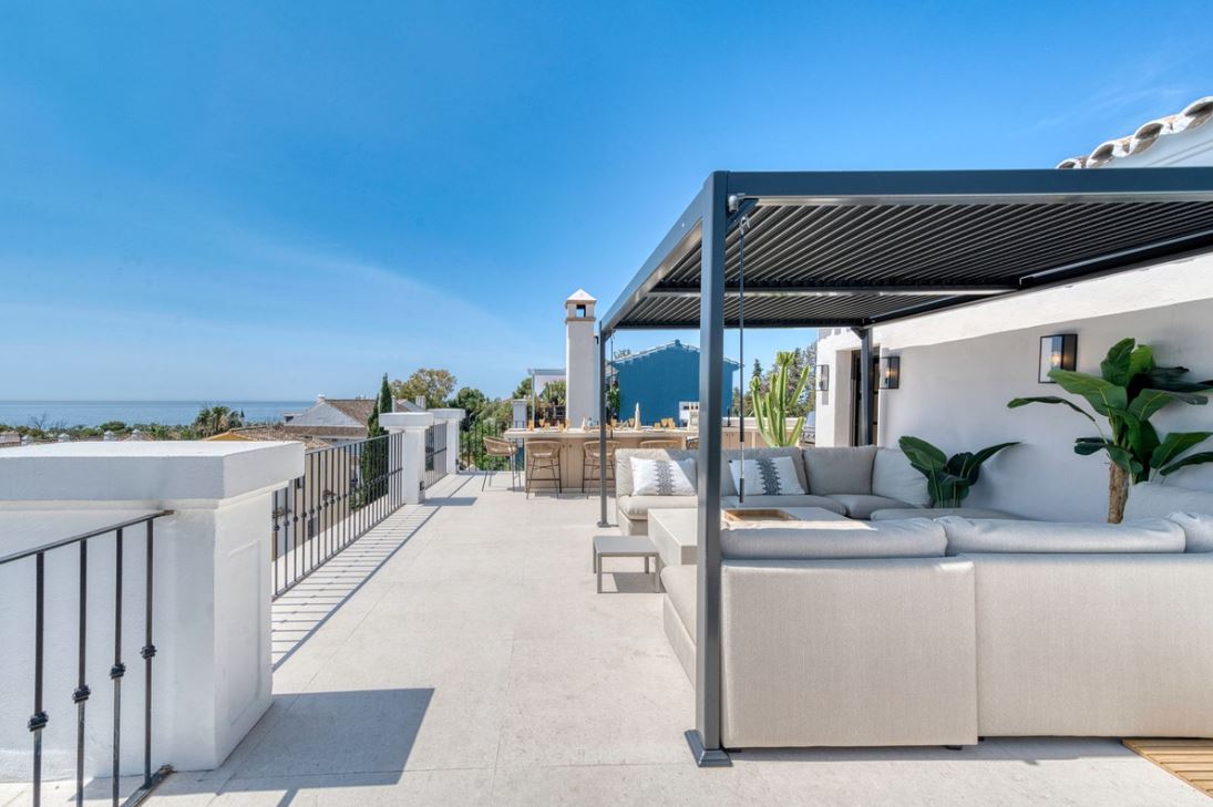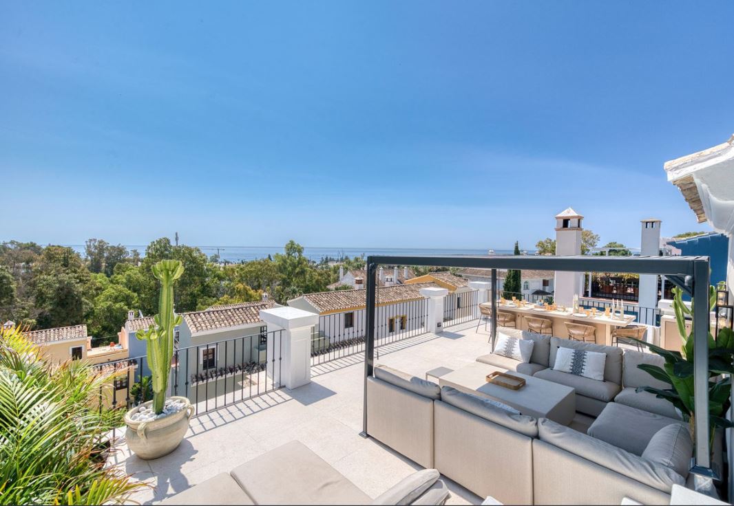 Exquisite Andalusian-style townhouse on Marbella’s Golden Mile, offering total privacy, sea views, and luxury features including a rooftop plunge pool, cinema lounge, designer Gaggenau kitchen, and 24-hour security. All this and just steps from iconic beach clubs, fine dining, and the Mediterranean coastline!