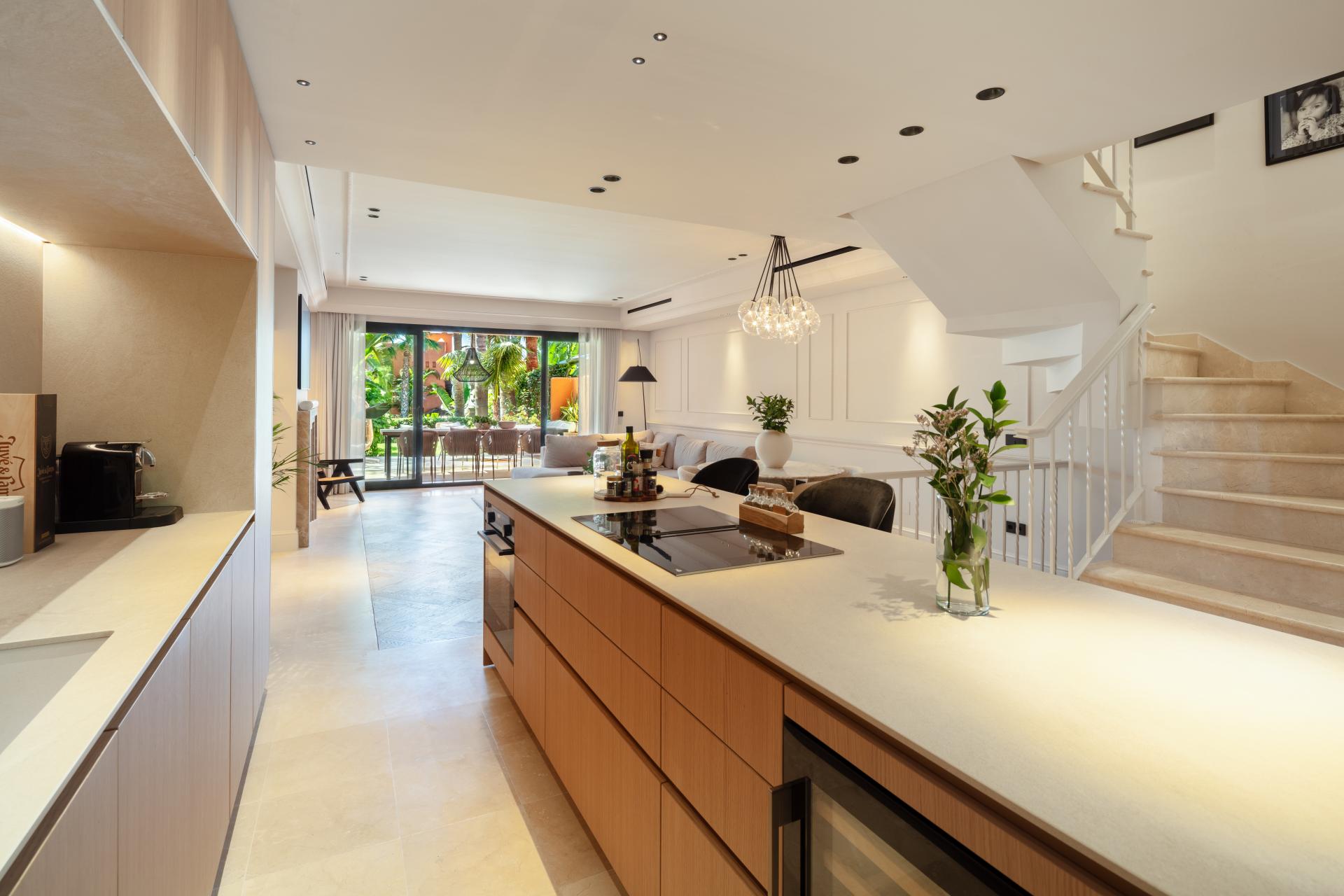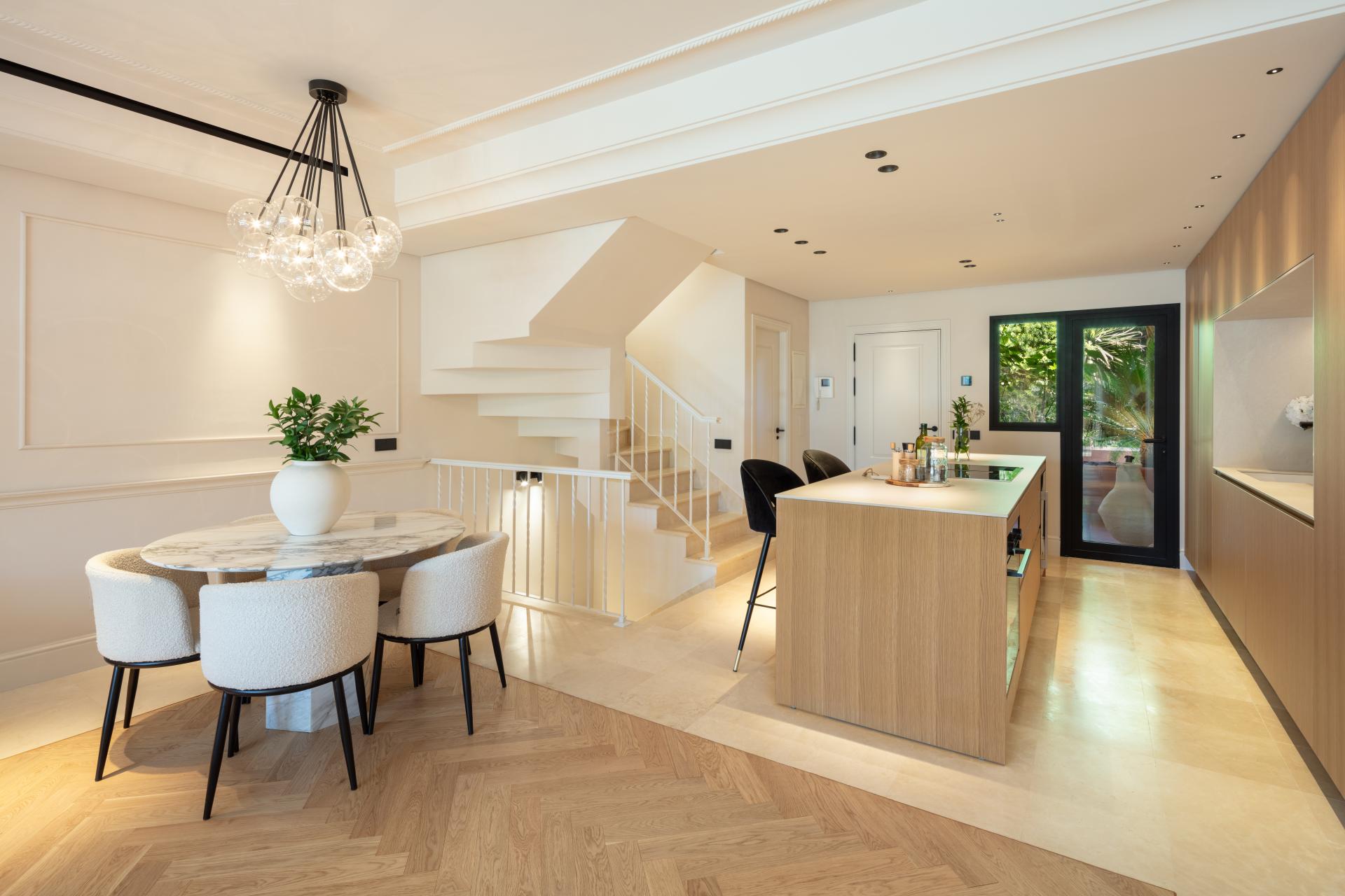 The solarium offers breathtaking views of the surrounding area, providing a serene retreat to enjoy the stunning surrounding views. Inside, the interior is beautifully designed with refined furniture and meticulous attention to detail. The open-plan layout on the ground floor features a fully-equipped modern kitchen with state-of-the-art appliances and exquisite finishes. The ample living space offers a haven for relaxation, adorned with a subtle neutral colour palette. The townhouse comprises 4 stunning bedrooms, each meticulously designed with utmost care. Situated within a secure gated community, privacy and security are guaranteed. Residents can also enjoy the communal pool set amidst a meticulously manicured garden. Conveniently located on the Golden Mile, this property offers easy access to a range of amenities and is just a short walk from the pristine beaches of Marbella.