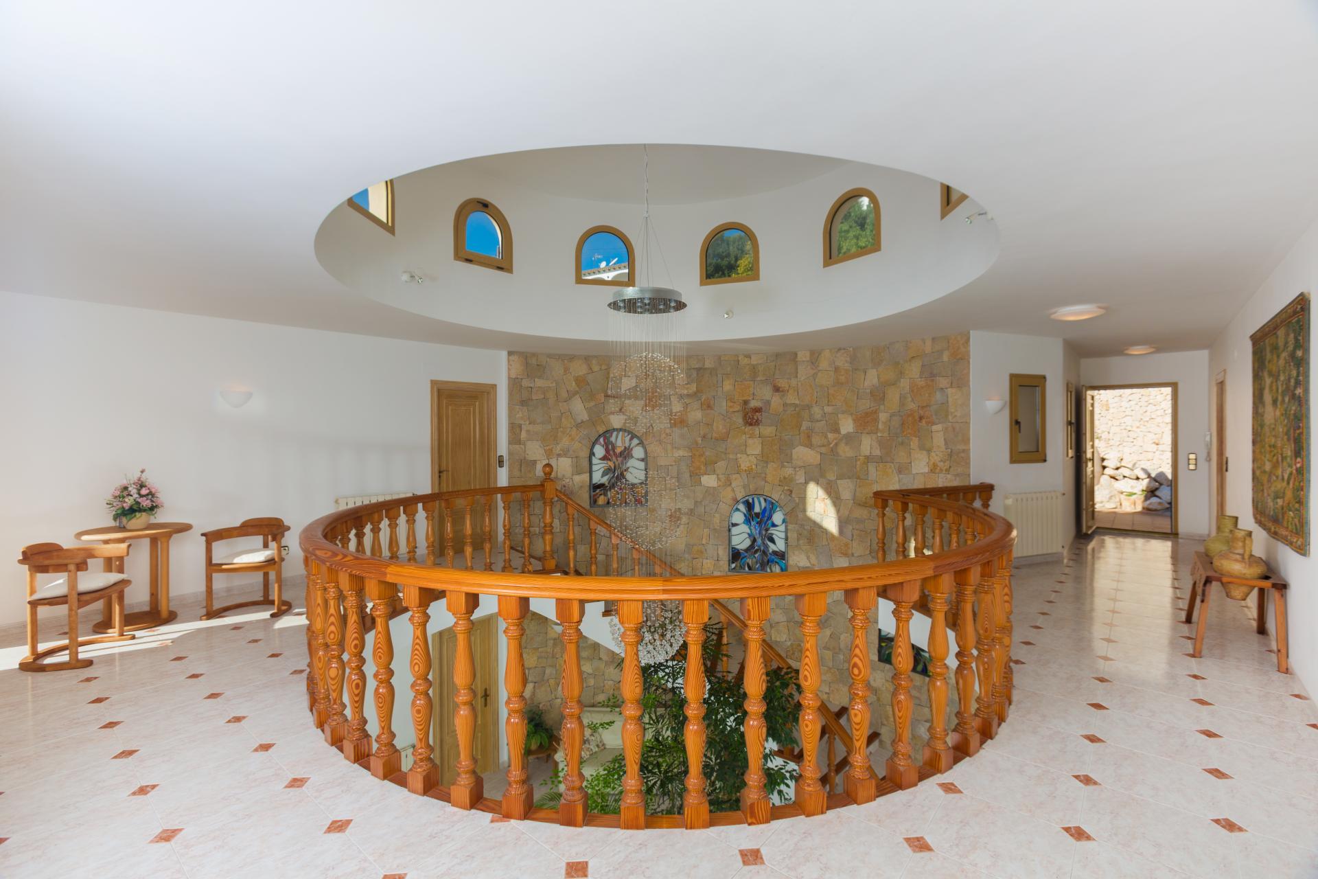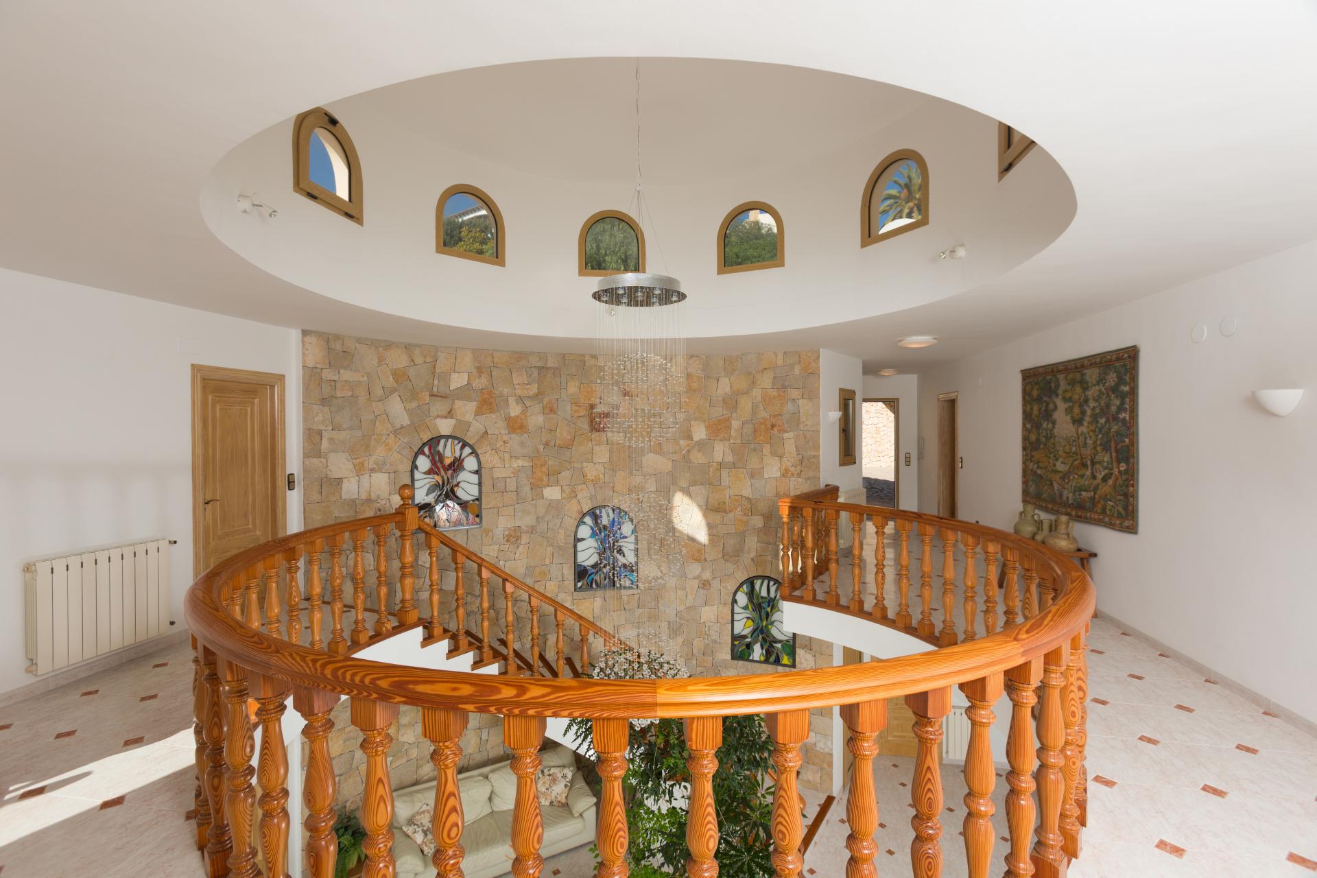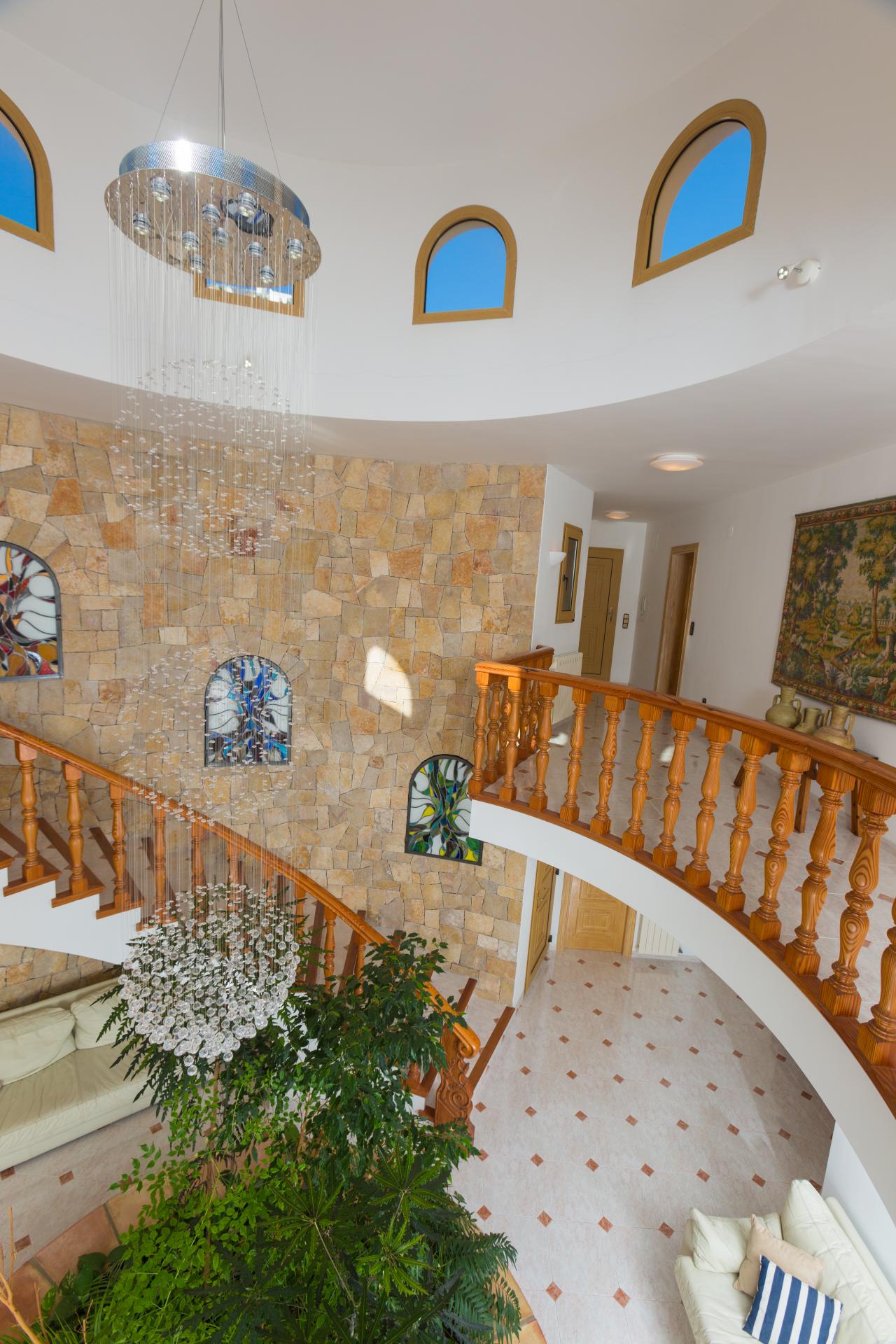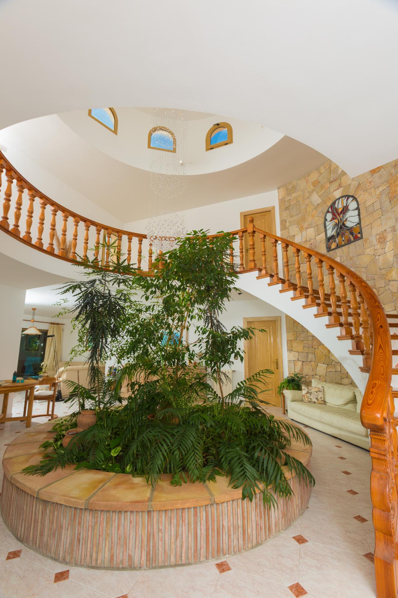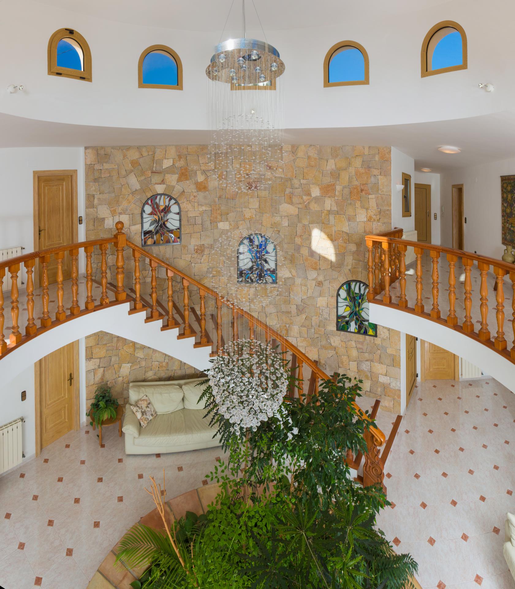 The property is accessed via a remote-control gated access with open parking, a car port and a garage. Entrance into the property from the upper level where you are met with a unique and bespoke internal staircase that is not merely functional but an eye-catching and impressive design focal point from the handcrafted wooden banister, the custom-made stained-glass windows embedded into the feature stone wall to the beautiful cascading chandelier which is as much a work of art as a lighting fixture. On this level there are 3 ensuite bedrooms all with built in wardrobes all of which have access to a top terrace to enjoy the sea views, the staircase leads down onto the ground floor level with a huge central living space with indoor plant area, a vast area with many different functions for lounge, dining, relaxing and entertaining, perfect for hosting the most amazing parties, another feature of this area is the duel fireplace benefitting one of the lounge areas on one side and a dining area on the other, in addition to the bespoke fully fitted kitchen with island and breakfast bar/casual dining there is a separate large utility room and also on this level a guest toilet plus a 4th ensuite bedroom with fitted wardrobes. The living areas and 4th bedroom open onto the huge outdoor terrace and naya with stunning unobstructed view. In the basement area there is a fitness area with sauna and gym, an area that is also used a separate guest studio but could be adapted into a home office, cinema/games room etc.