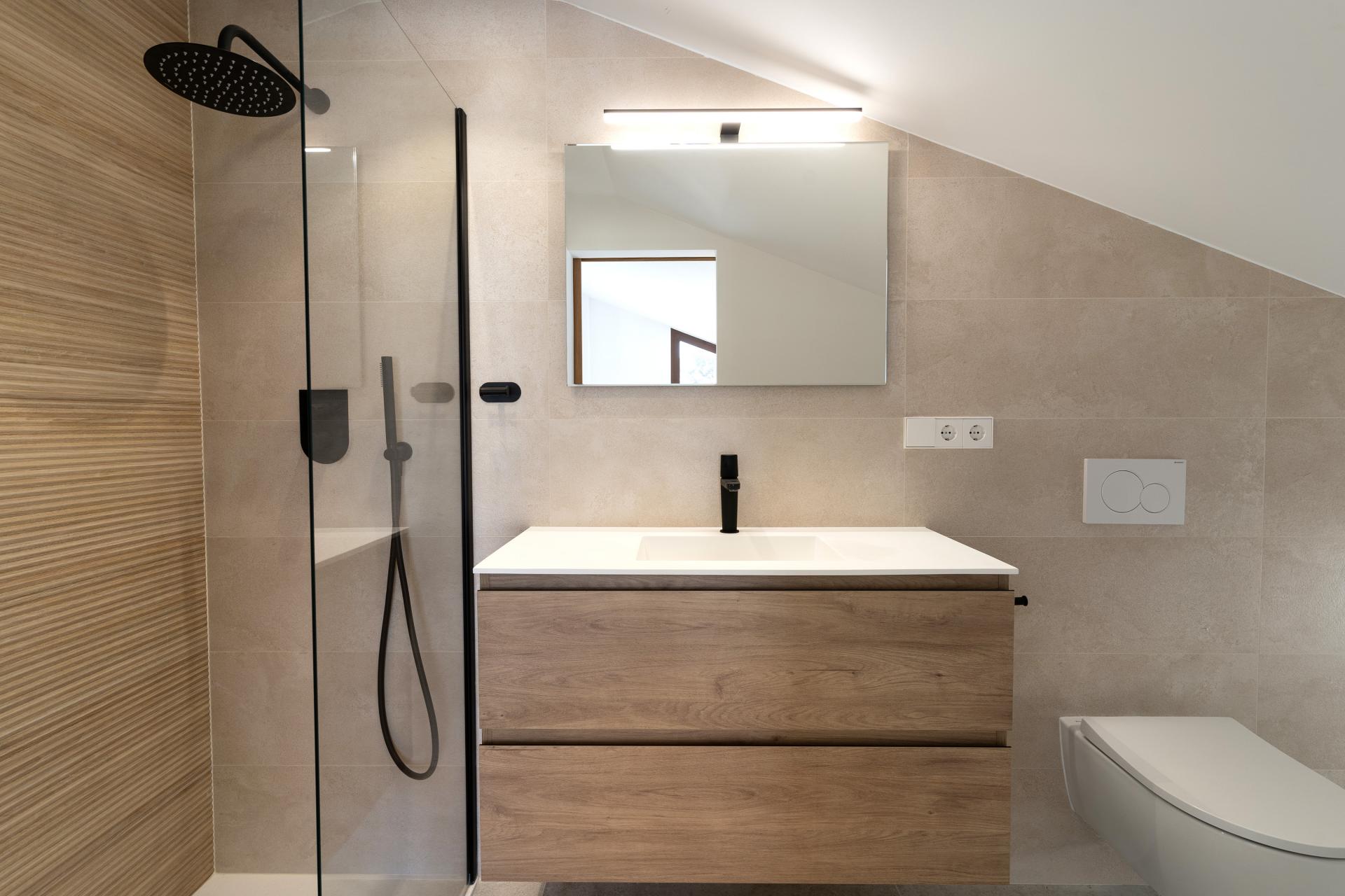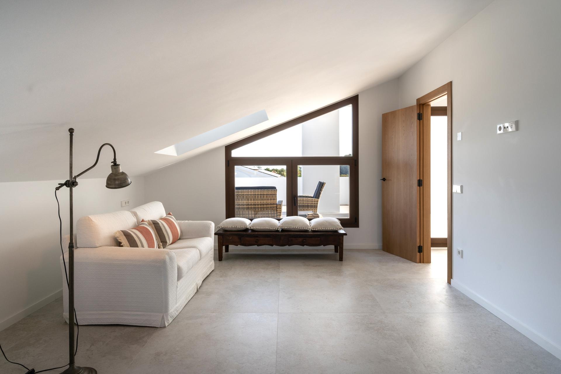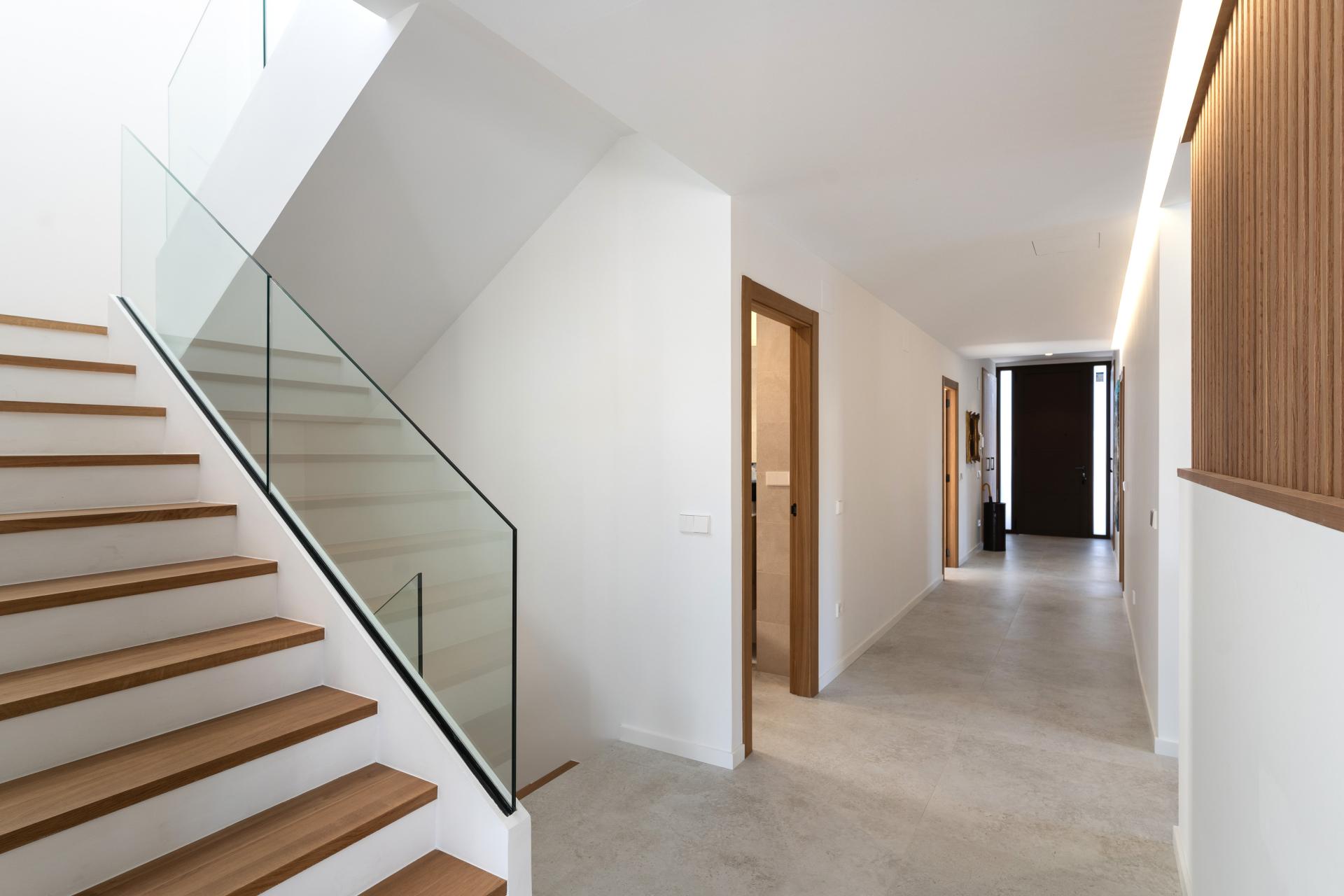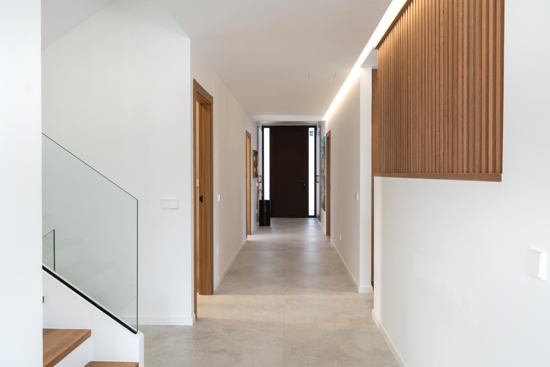 Stylish interiors featuring large-format porcelain stoneware flooring and smooth, high-quality wall finishes.