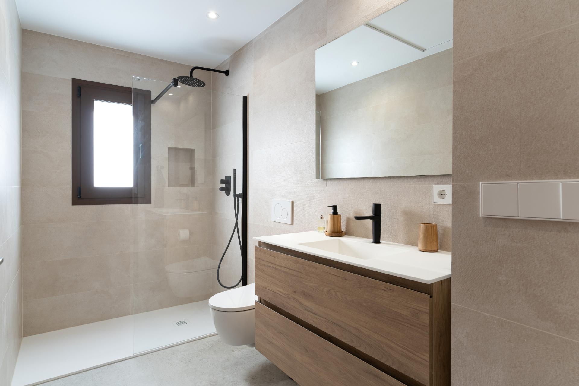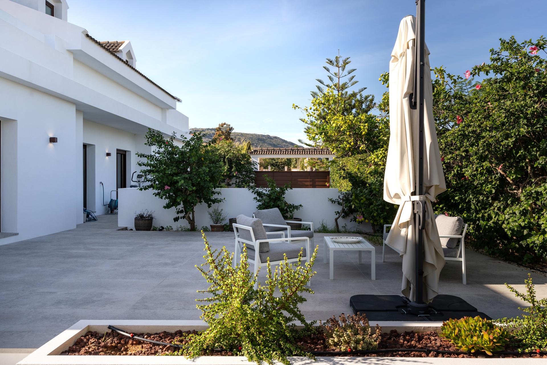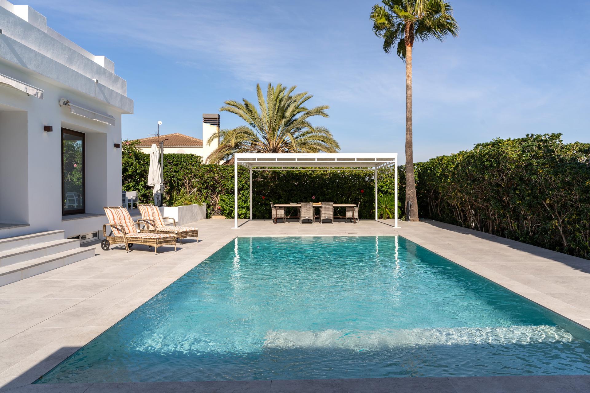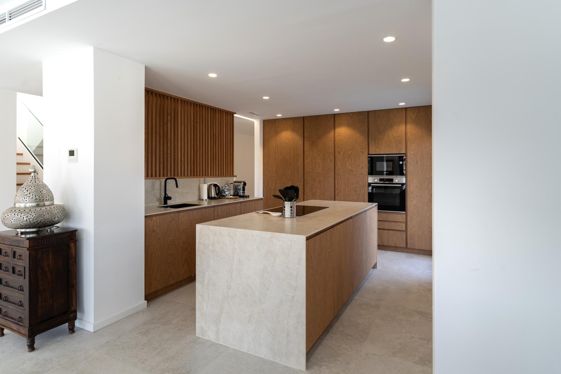 An additional guest bathroom with high-end finishes. A modern fully equipped kitchen with a central island and top-of-the-line furniture, perfect for creating and enjoying Mediterranean-inspired dishes. A sophisticated living-dining area with seamless access to a sprawling terrace. The terrace, finished with premium porcelain ceramic flooring, surrounds a newly renovated rectangular swimming pool, creating an outdoor oasis perfect for relaxation or entertaining. The east-facing orientation ensures morning sunlight and a connection to the serene natural surroundings.