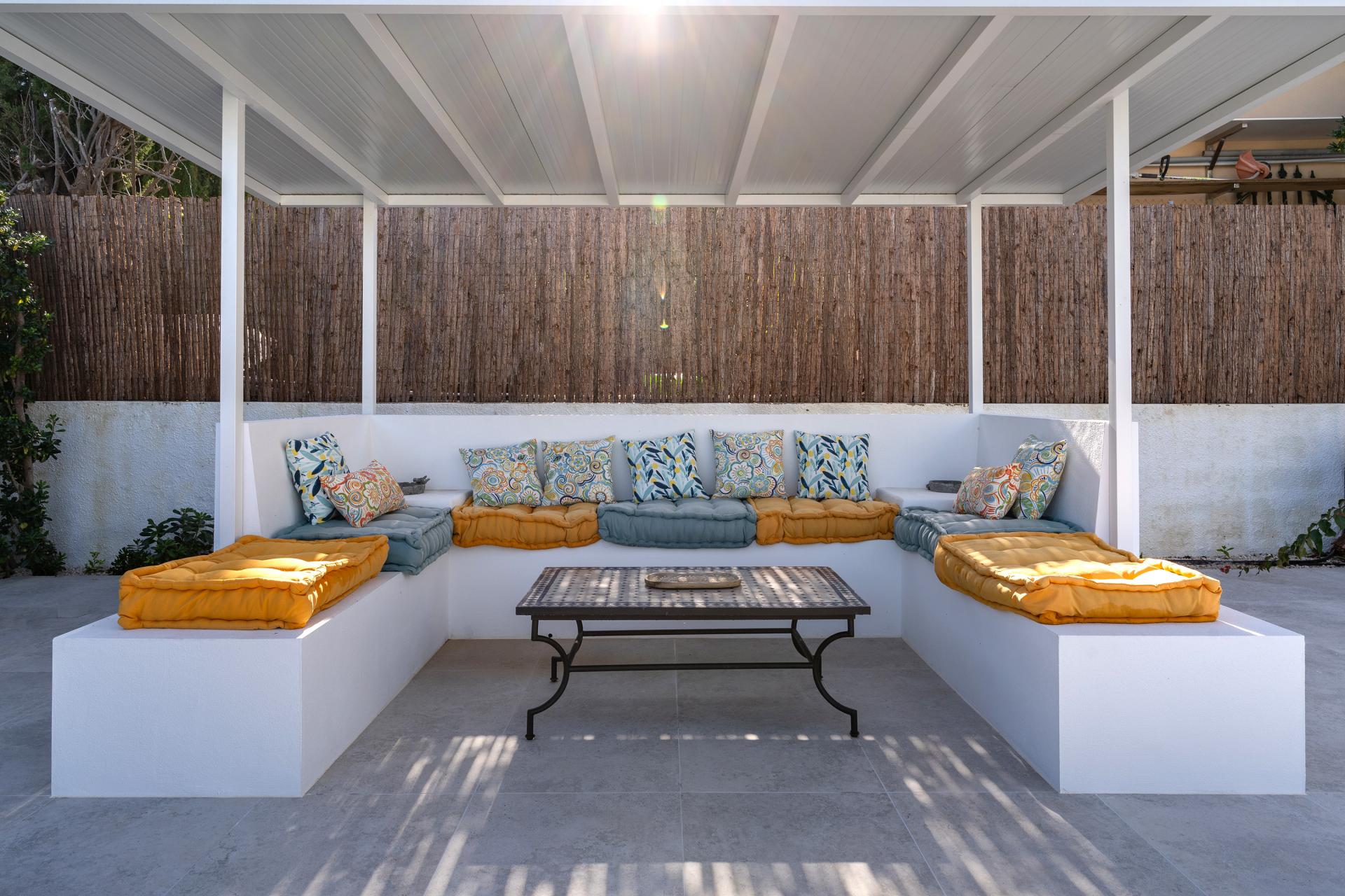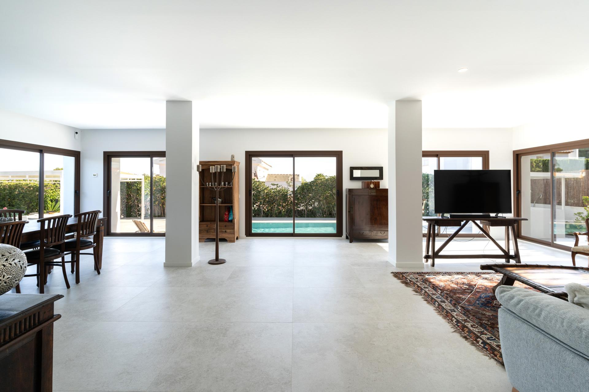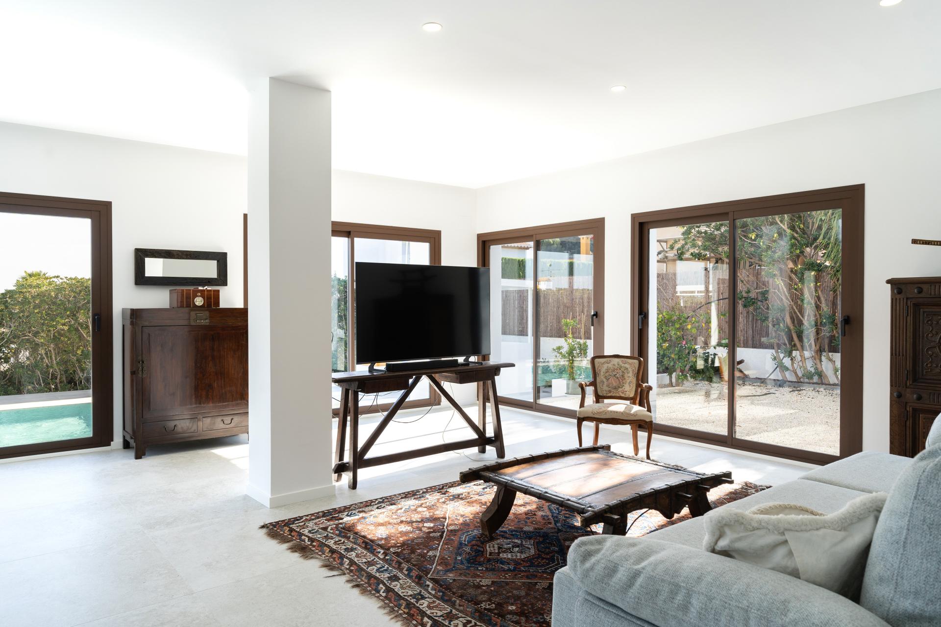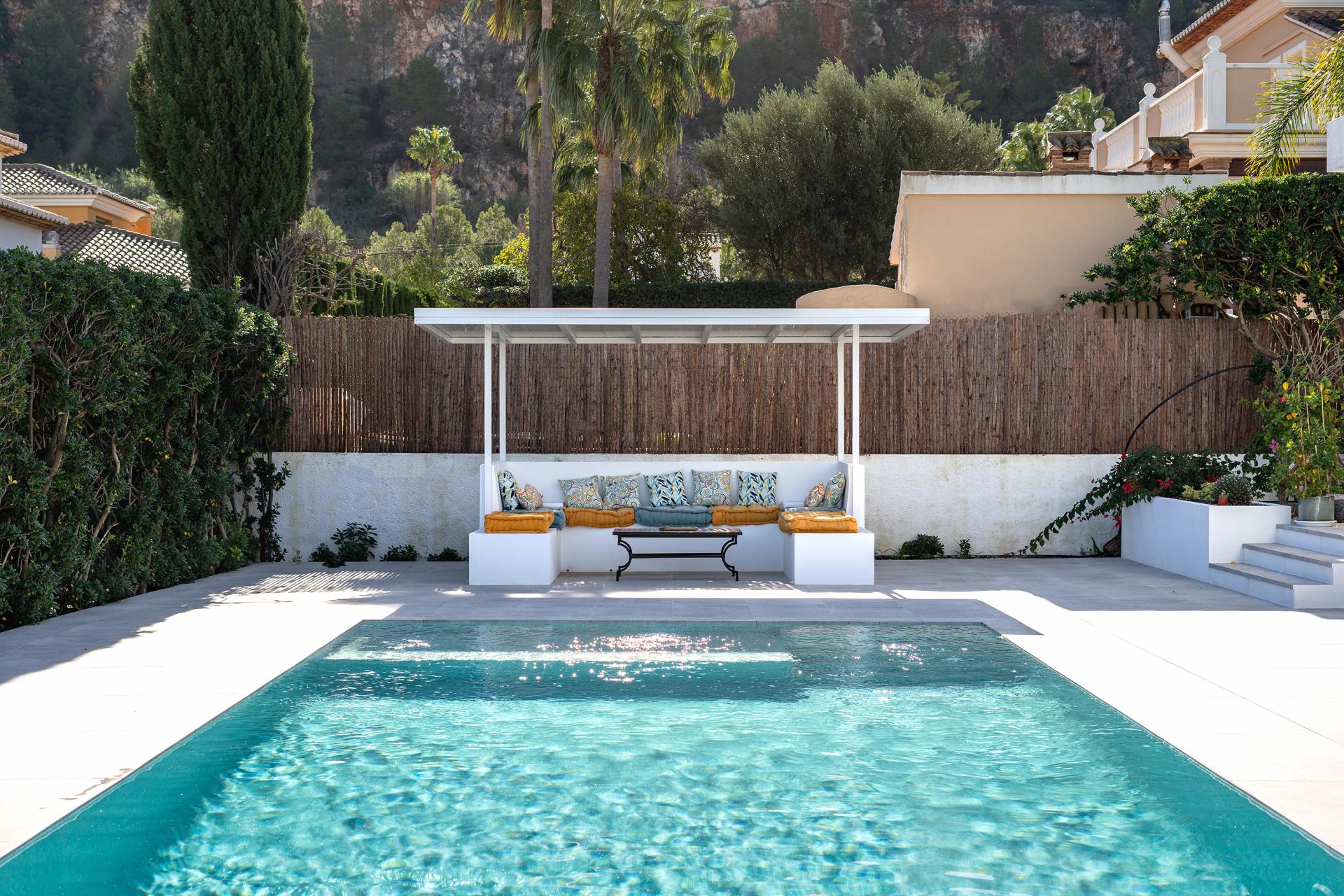 An additional guest bathroom with high-end finishes. A modern fully equipped kitchen with a central island and top-of-the-line furniture, perfect for creating and enjoying Mediterranean-inspired dishes. A sophisticated living-dining area with seamless access to a sprawling terrace. The terrace, finished with premium porcelain ceramic flooring, surrounds a newly renovated rectangular swimming pool, creating an outdoor oasis perfect for relaxation or entertaining. The east-facing orientation ensures morning sunlight and a connection to the serene natural surroundings.