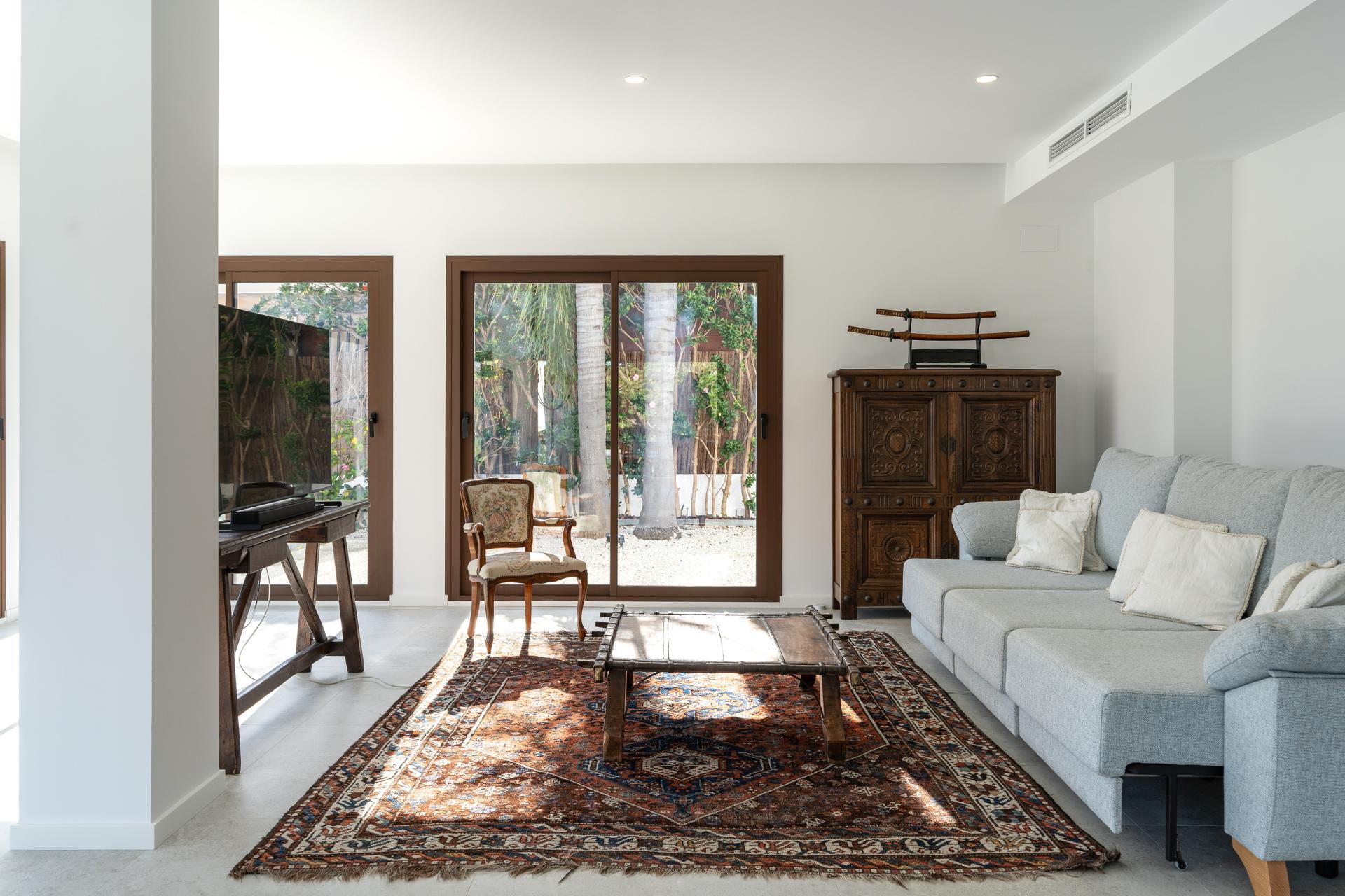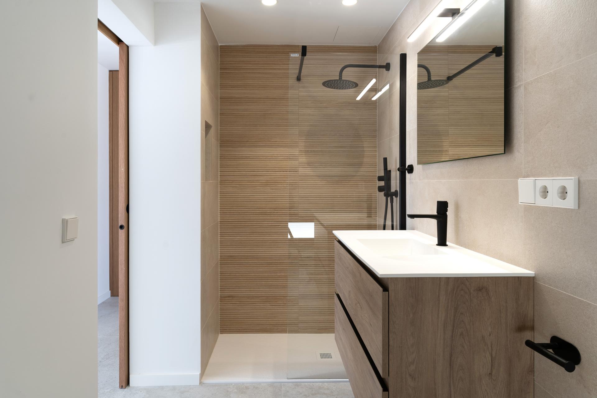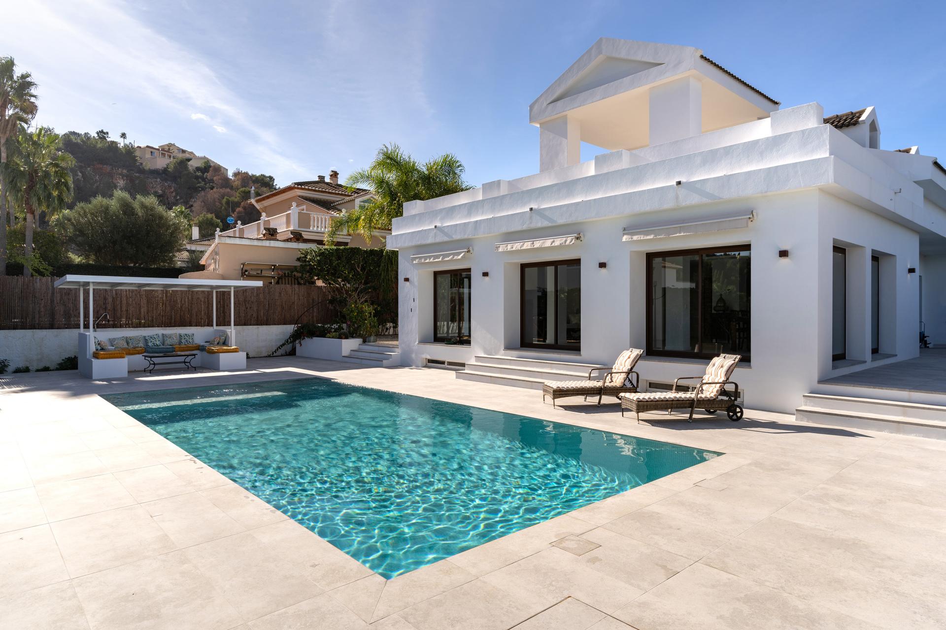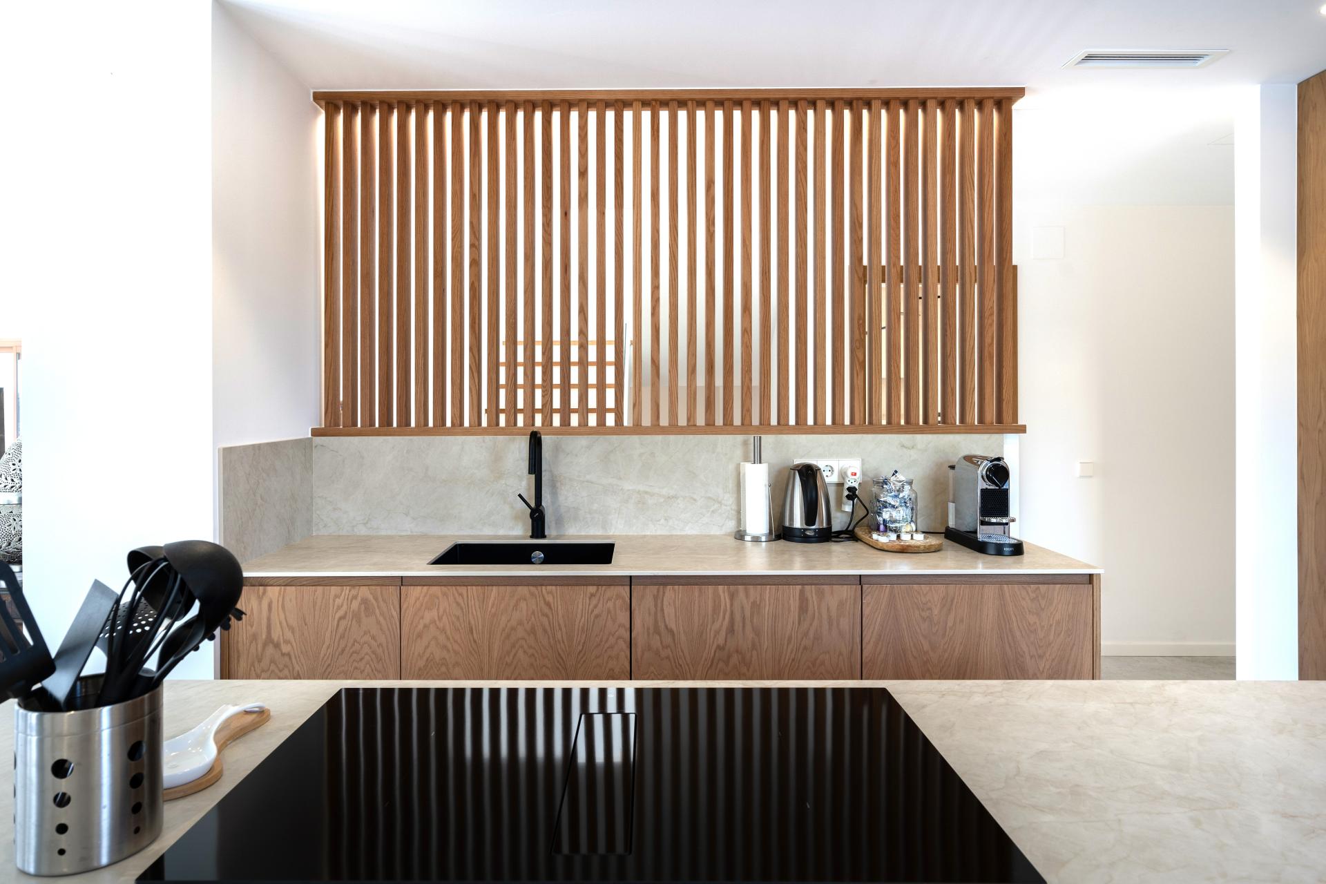 An additional guest bathroom with high-end finishes. A modern fully equipped kitchen with a central island and top-of-the-line furniture, perfect for creating and enjoying Mediterranean-inspired dishes. A sophisticated living-dining area with seamless access to a sprawling terrace. The terrace, finished with premium porcelain ceramic flooring, surrounds a newly renovated rectangular swimming pool, creating an outdoor oasis perfect for relaxation or entertaining. The east-facing orientation ensures morning sunlight and a connection to the serene natural surroundings.