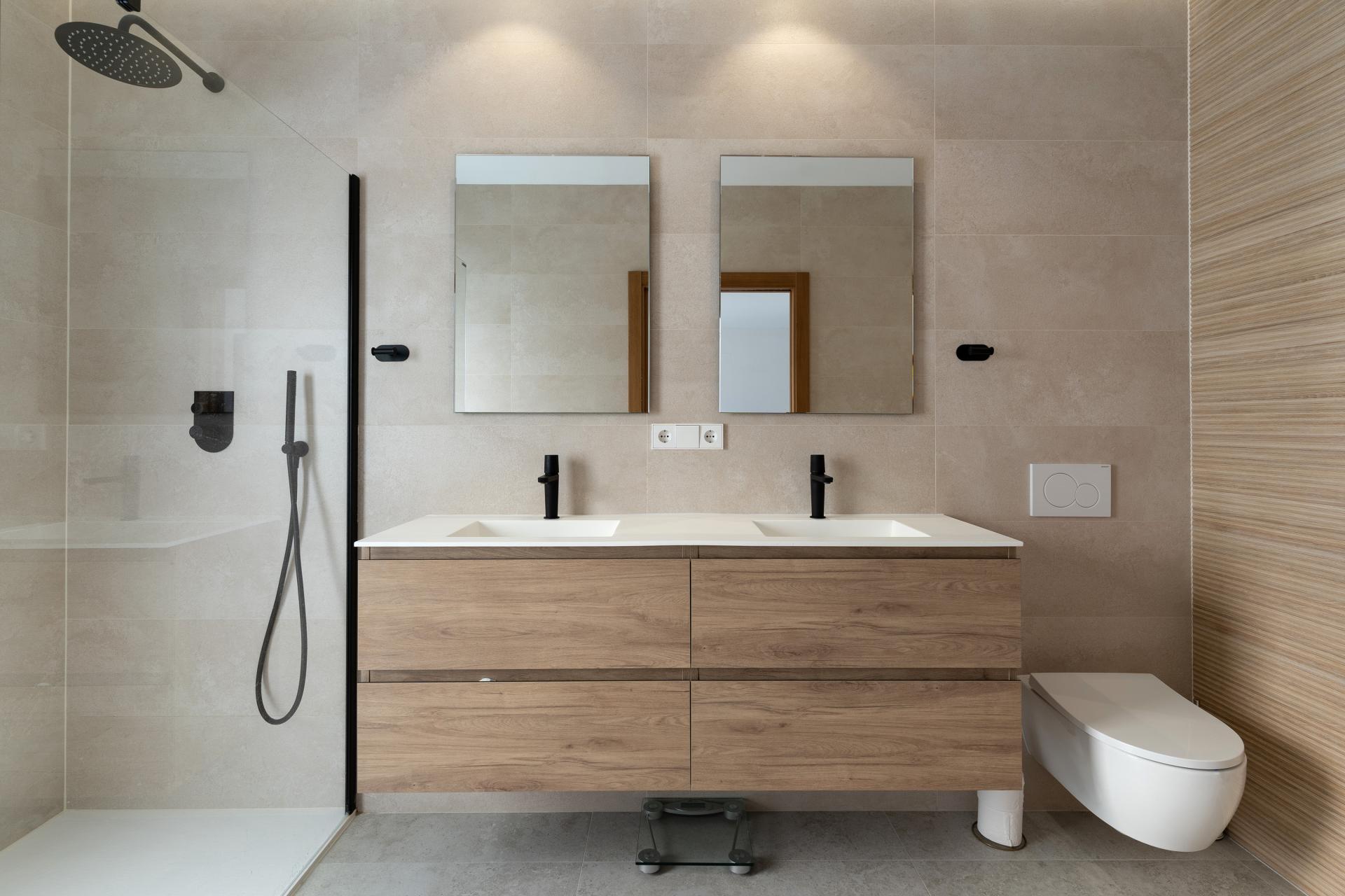 Bathrooms with luxurious sanitary porcelain sinks and modern fixtures.