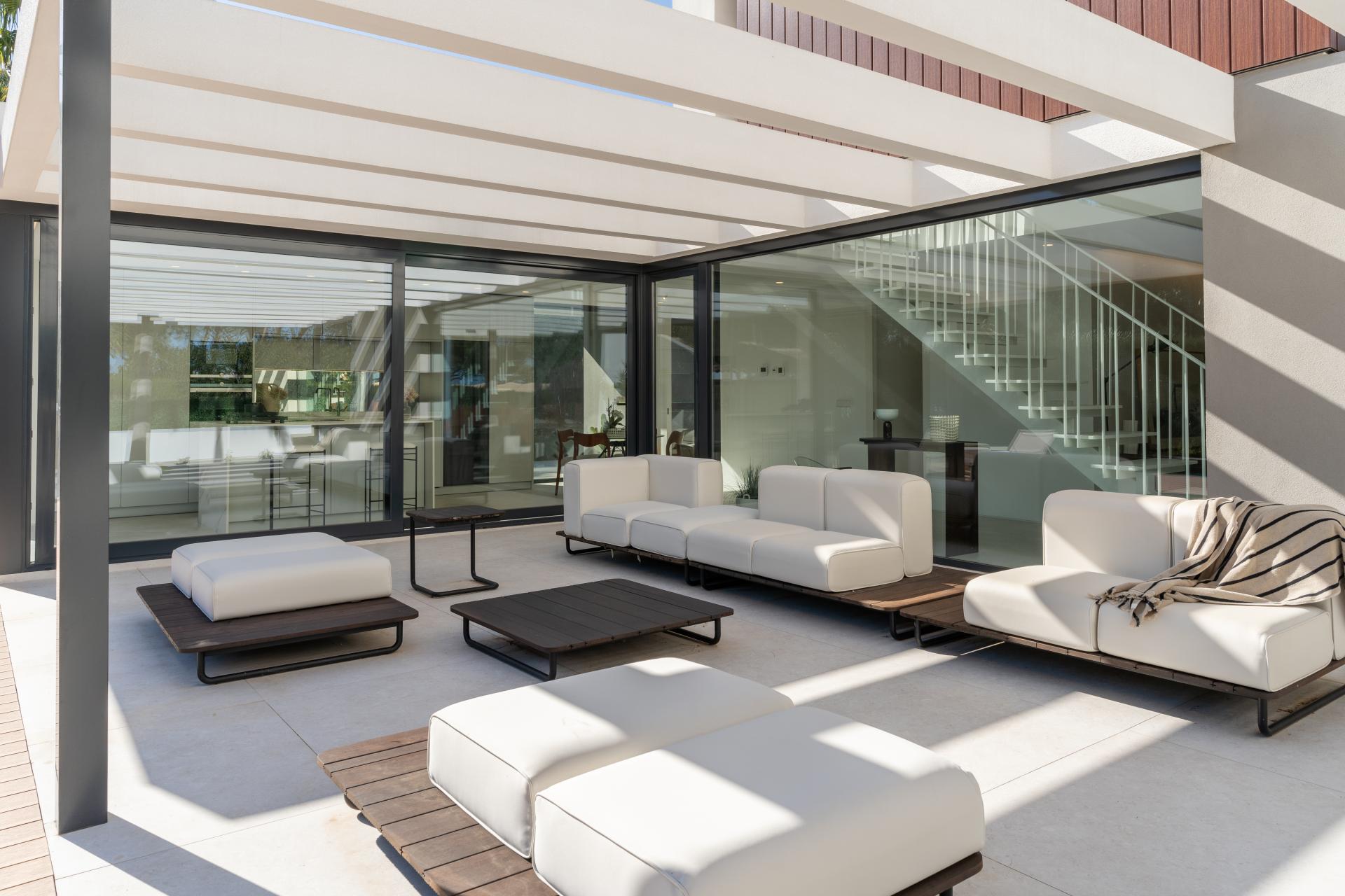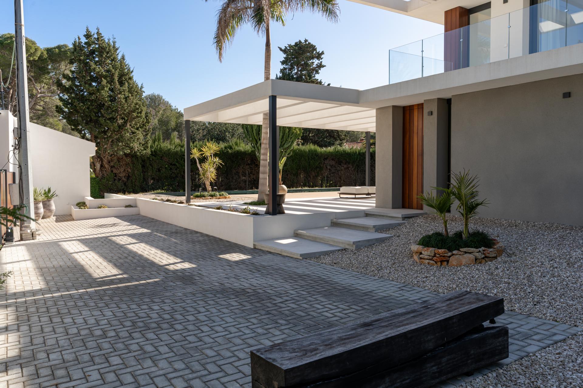 Expansive semi-covered terraces offer a perfect blend of sun and shade, ideal for alfresco dining, lounging, or entertaining guests. The landscaped, low-maintenance garden, framed by mature pine trees and tropical plants, enhances the villa’s sense of serenity and privacy.