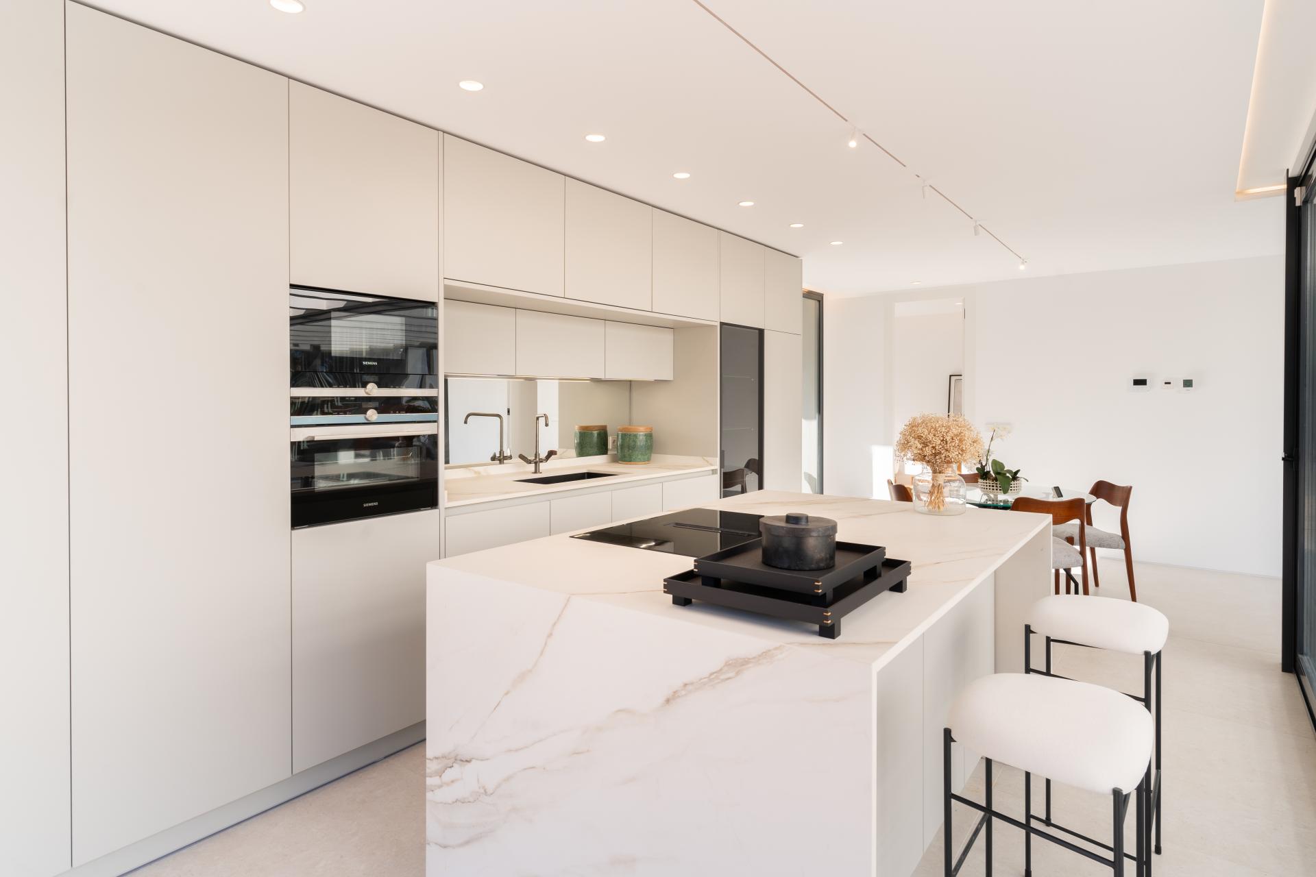 Ground Floor: Open-Concept Luxury A designer kitchen with a sleek, minimalist island, crafted from marble-effect stone, blends aesthetic appeal with practicality. Equipped with high-end Siemens appliances, it is complemented by a cosy dining space featuring a round glass table and mid-century modern chairs. The bright living room, with its neutral-toned plush sofas, a statement coffee table, and carefully selected natural wood furnishings, offers a serene retreat. The indirect LED lighting and integrated shelving create a sense of understated elegance. Two spacious double bedrooms, each with ensuite bathrooms, built-in wardrobes, and private terraces, provide tranquilillity and privacy.
