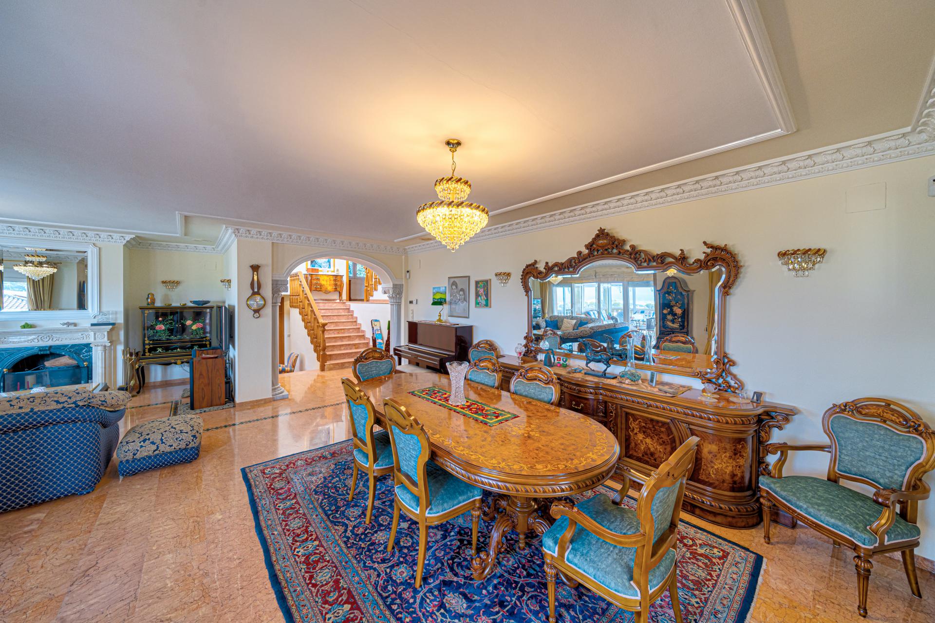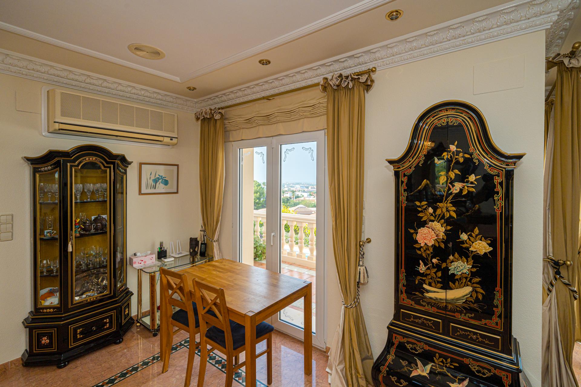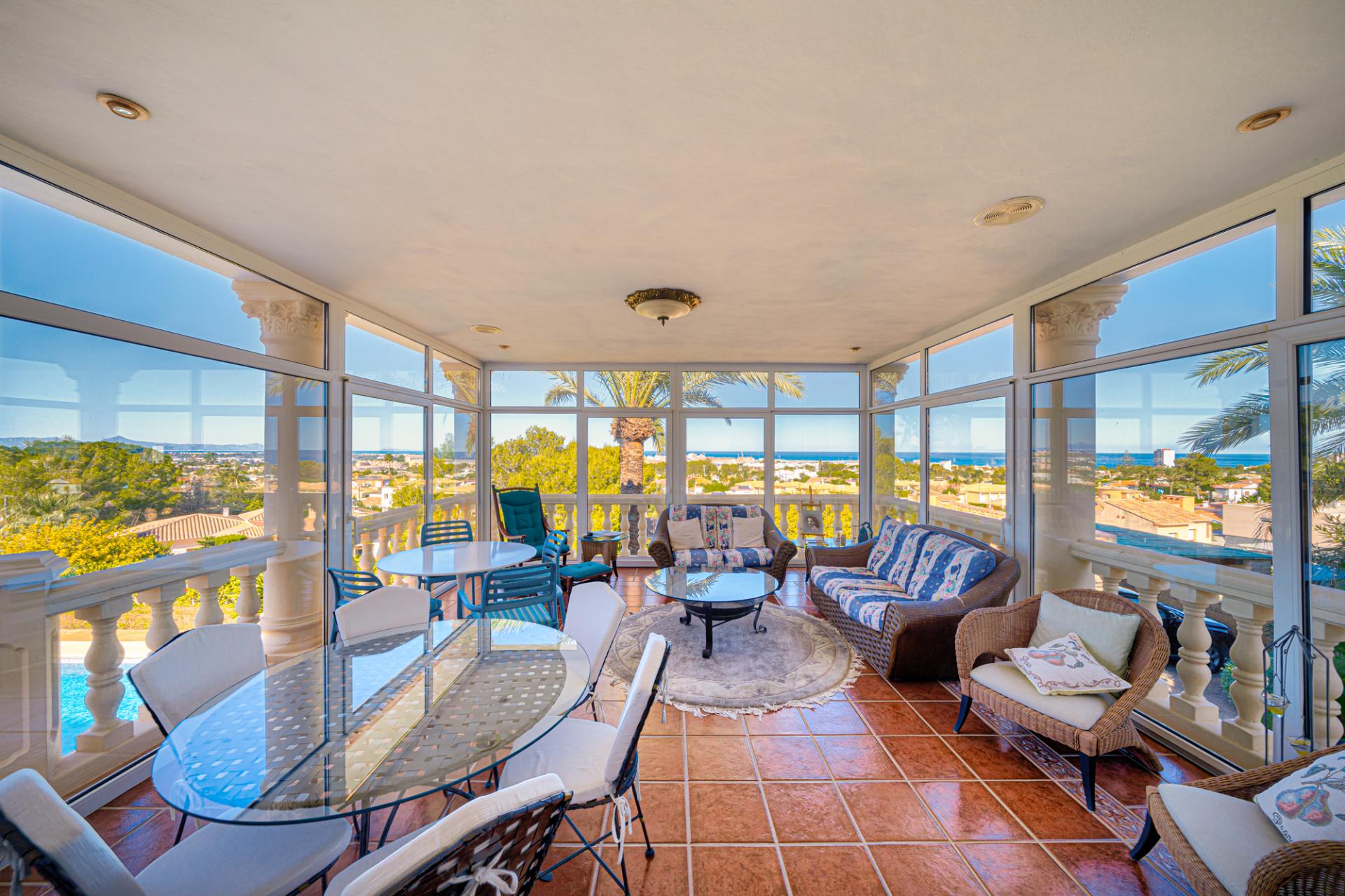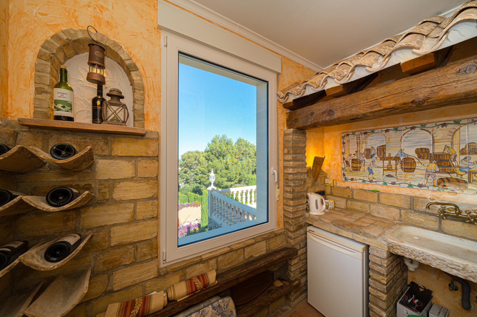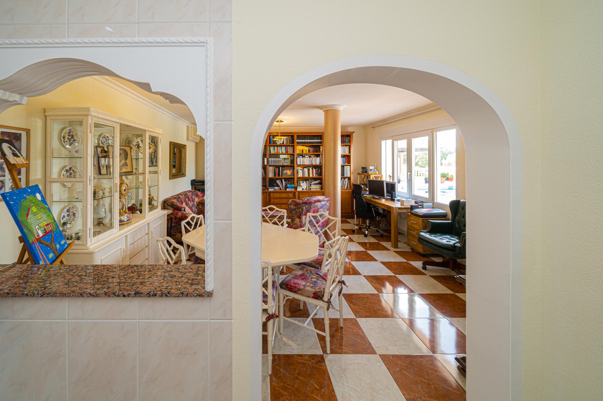 Access to the property is through wonderful double oak entrance doors that lead into an impressive reception hall with a double height atrium and the marble staircase with hand carved oak balustrades, an impressive and welcoming area, with steps that lead up to the main living area with imported pale grey Marble column features as you walk into the exceptionally spacious open plan area with a formal lounge with a marble fireplace and open fire for cosy winter evenings, a formal dining area, an a recess area used as an office where you can work whilst enjoying the sea views, the lounge opens onto a wonderful glazed lounge perfect when entertaining and hosting parties, an area that was once completely open and perhaps the new owners may decide to replace with bi-folding glass doors, a door from this area leads to a balcony terrace and around to the summer kitchen area, so again when entertaining you have a flow from inside to outside, the kitchen area is accessed from the dining area and has a large built in pantry and casual breakfasting area, fully fitted and with sea views, a patio door leads to the summer kitchen and covered summer dining area with open views down to the pool and across to the sea and Denia castle, the new owner may want to merge these two areas into one huge kitchen and casual dining/relax area with bi-folding glass doors. There is also a guest toilet in the entrance hallway and a cloakroom cupboard.