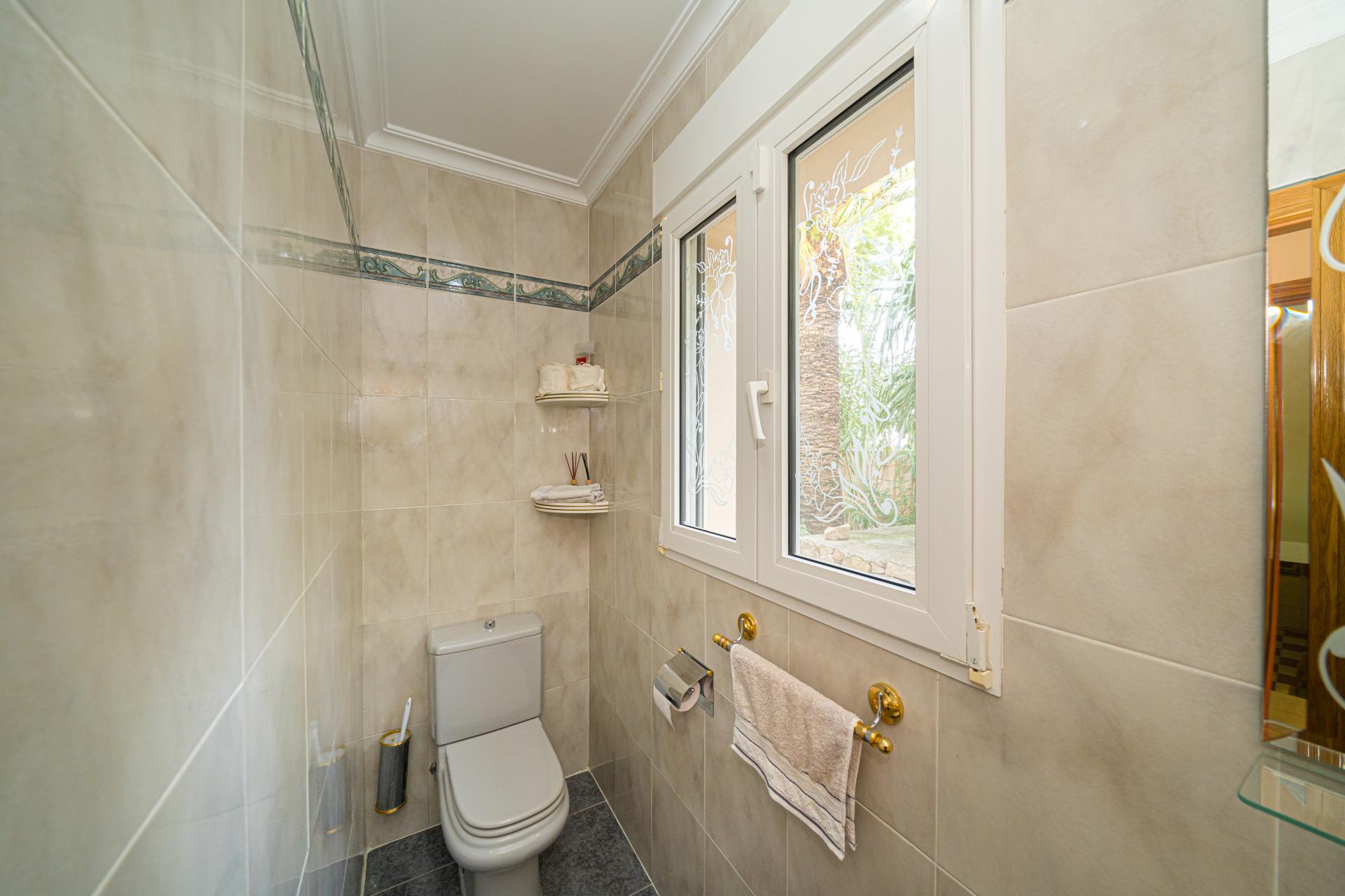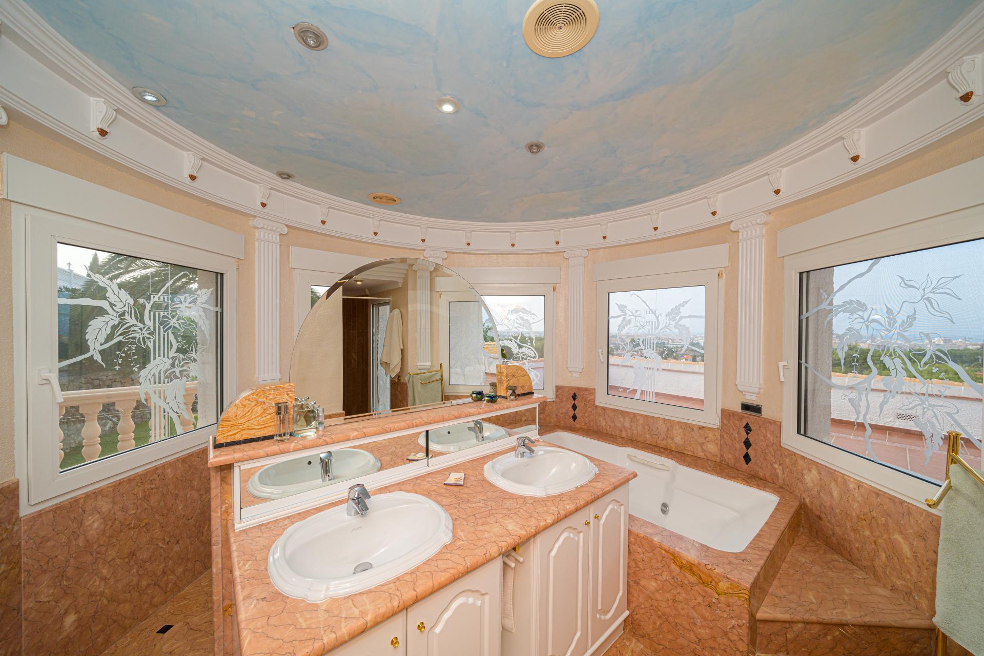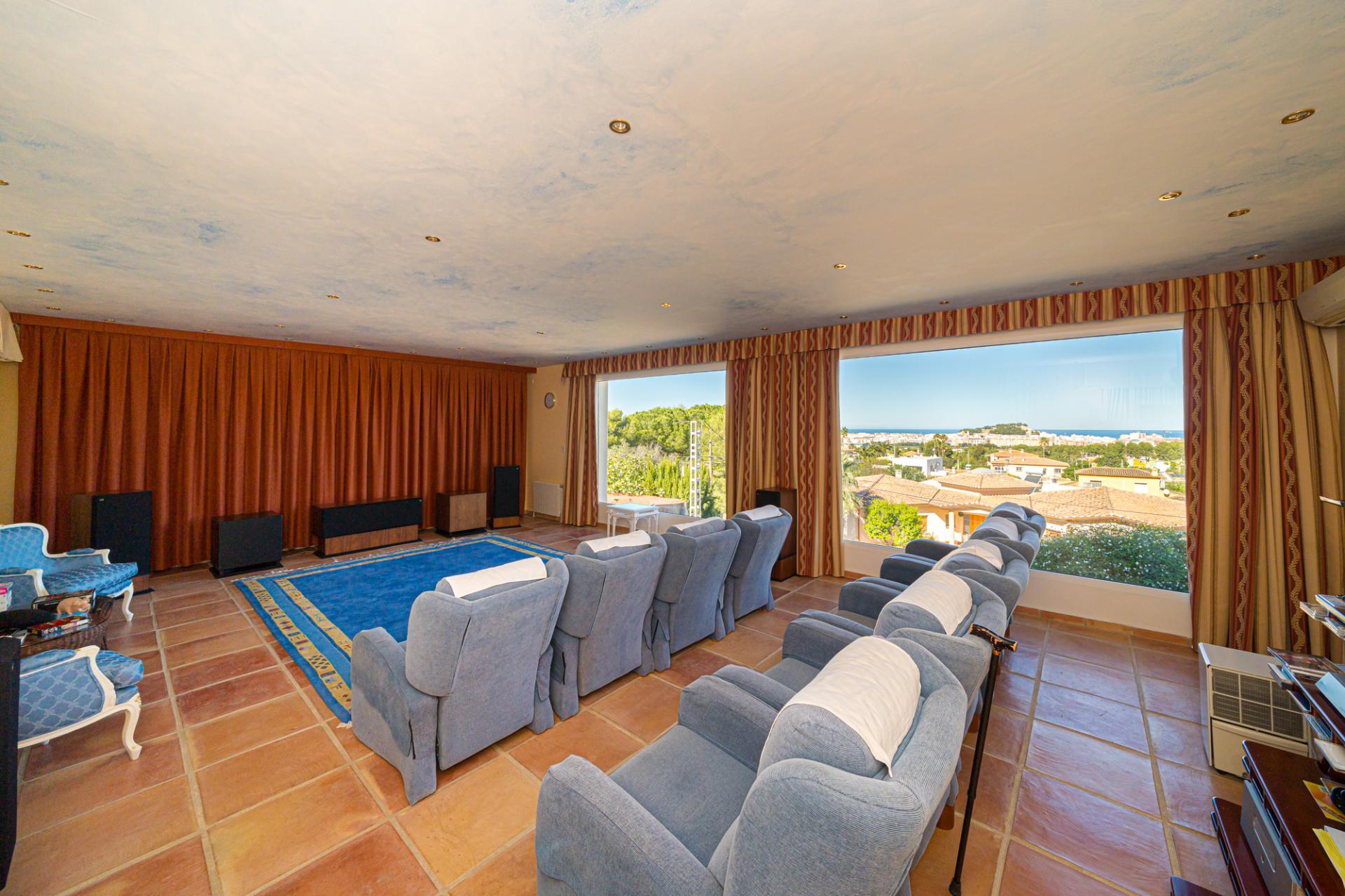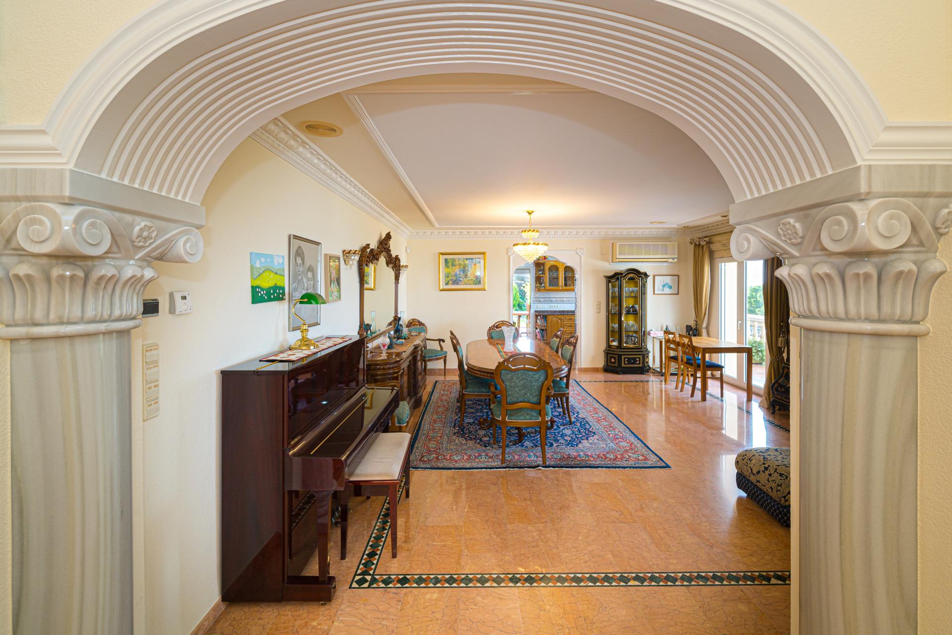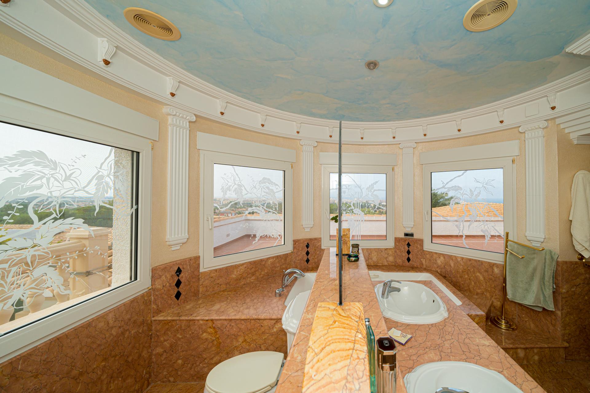 Access to the property is through wonderful double oak entrance doors that lead into an impressive reception hall with a double height atrium and the marble staircase with hand carved oak balustrades, an impressive and welcoming area, with steps that lead up to the main living area with imported pale grey Marble column features as you walk into the exceptionally spacious open plan area with a formal lounge with a marble fireplace and open fire for cosy winter evenings, a formal dining area, an a recess area used as an office where you can work whilst enjoying the sea views, the lounge opens onto a wonderful glazed lounge perfect when entertaining and hosting parties, an area that was once completely open and perhaps the new owners may decide to replace with bi-folding glass doors, a door from this area leads to a balcony terrace and around to the summer kitchen area, so again when entertaining you have a flow from inside to outside, the kitchen area is accessed from the dining area and has a large built in pantry and casual breakfasting area, fully fitted and with sea views, a patio door leads to the summer kitchen and covered summer dining area with open views down to the pool and across to the sea and Denia castle, the new owner may want to merge these two areas into one huge kitchen and casual dining/relax area with bi-folding glass doors. There is also a guest toilet in the entrance hallway and a cloakroom cupboard.