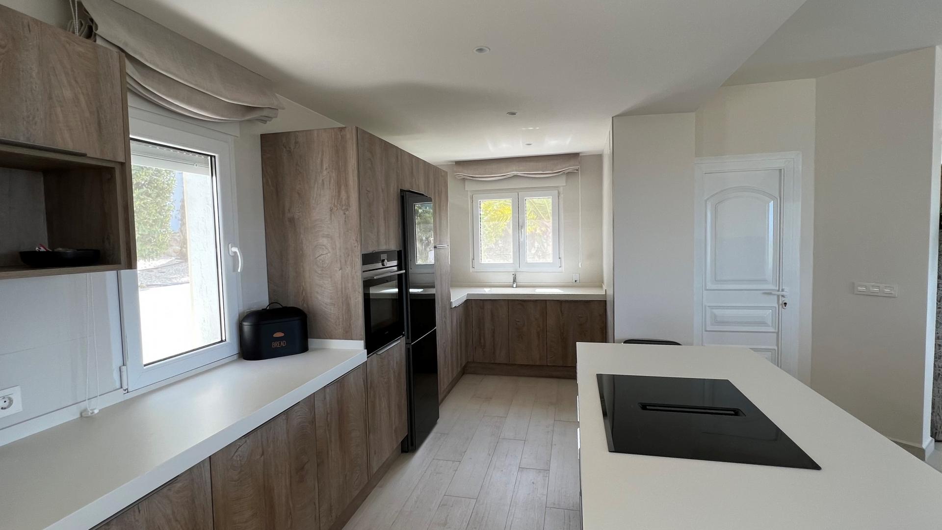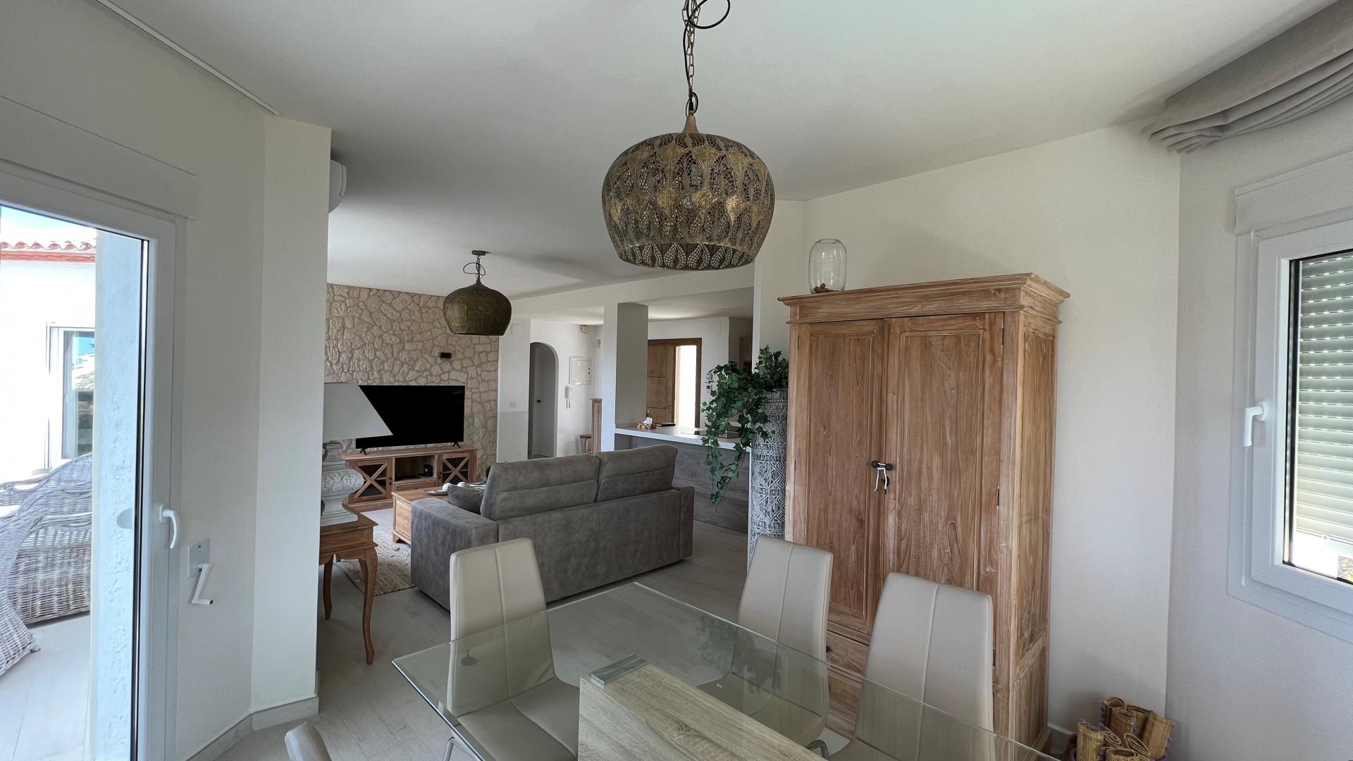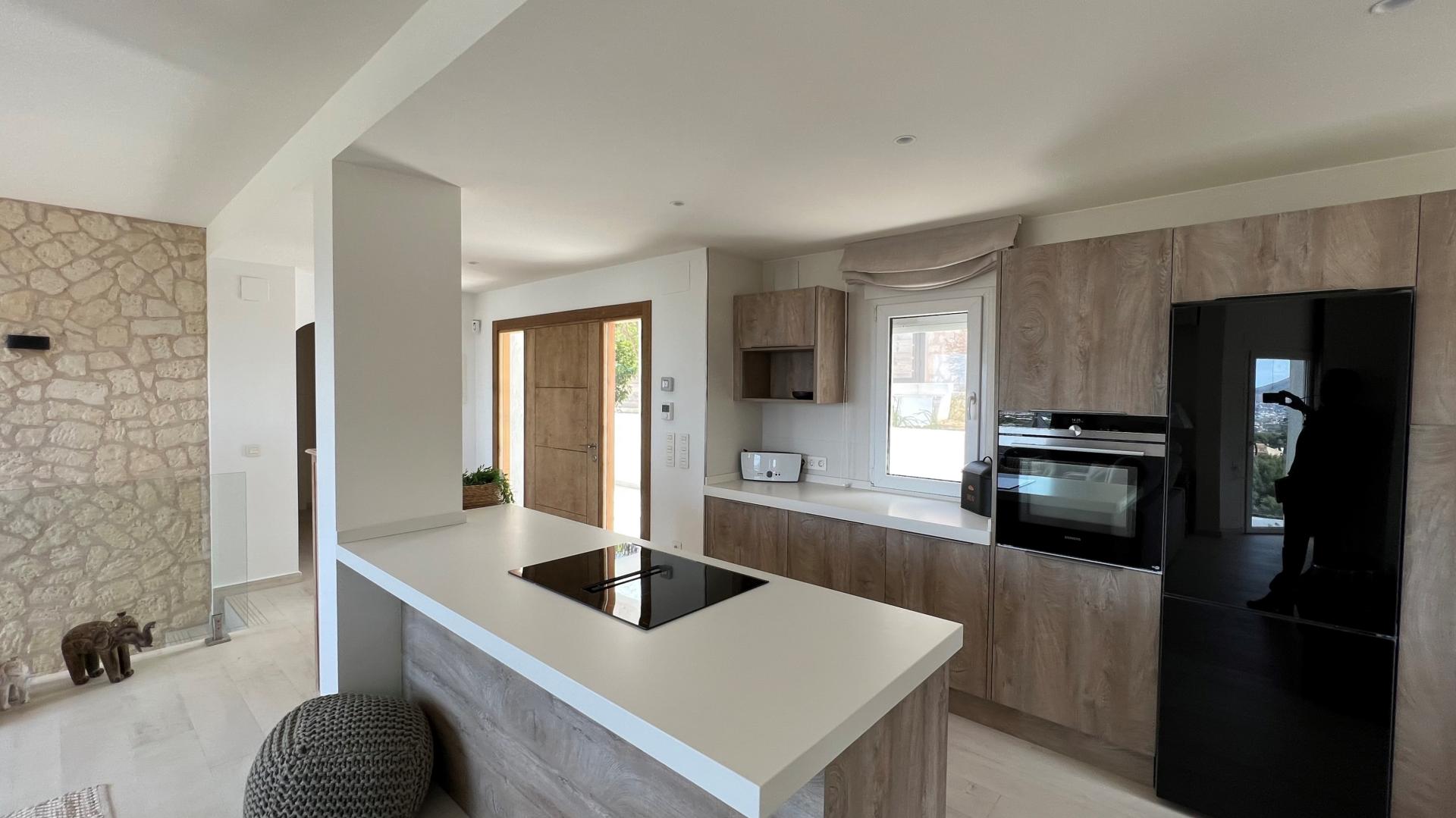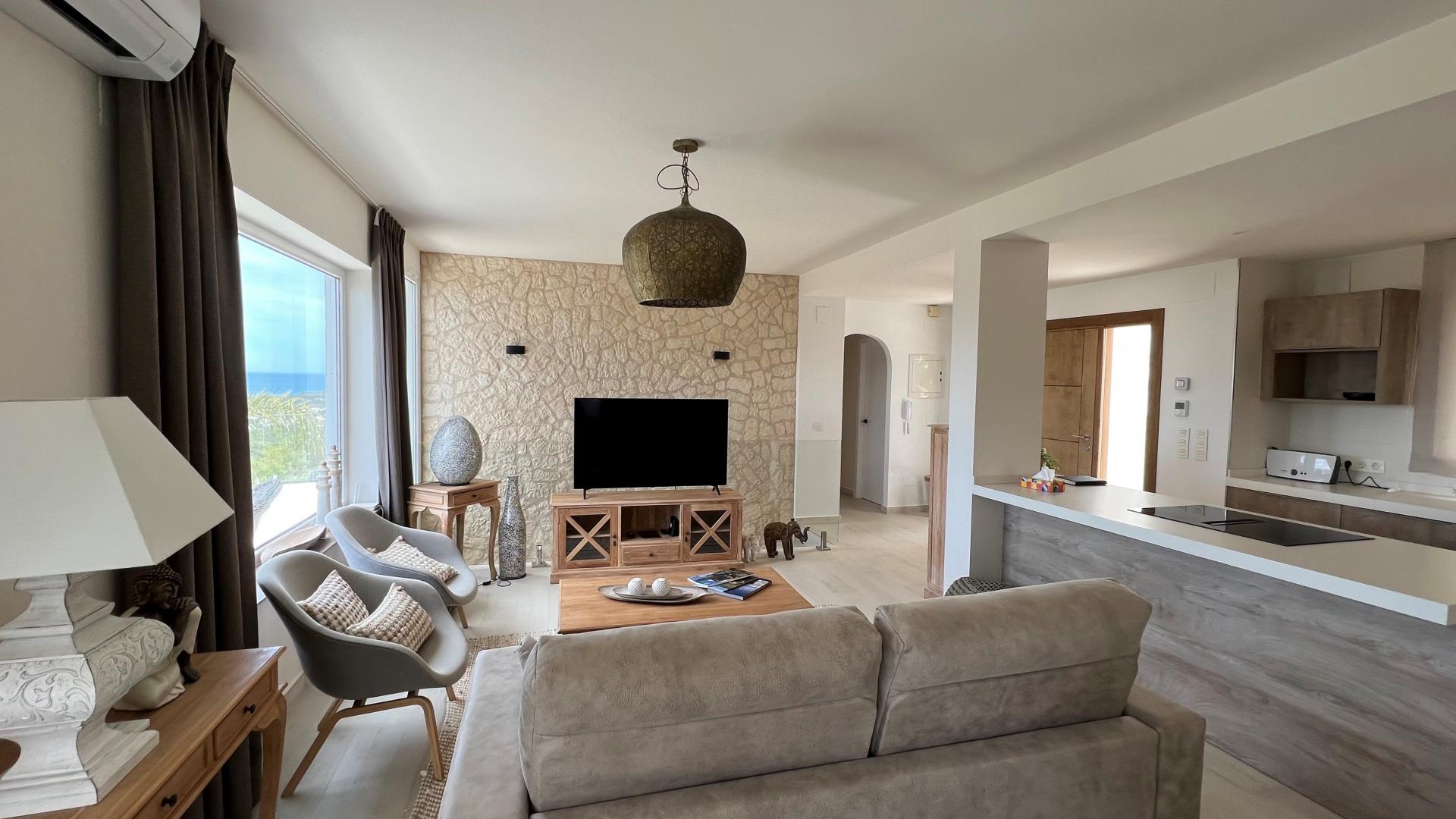 PROPERTY DETAILS The villa has been recently reformed to create a modern villa with open plan living that includes a lounge with picture view windows from which to relax and enjoy the sea views, fully fitted kitchen with integrated appliances and a counter island with hob and breakfasting bar area, separate dining area with a door that opens onto a terrace with a lounge area, front the front entrance a hallway that leads to two bedrooms including the master bedroom with dressing area and ensuite shower room with walk-in shower and double vanity, guest toilet and stairs from the open plan living area with a natural feature stone wall lead down to the guest apartment which consists of a lounge/dining room and bedroom, a separate bathroom and another bedroom both with doors to large terrace that leads along to the summer kitchen with bar and alfresco dining area, on this level there is also a laundry room.