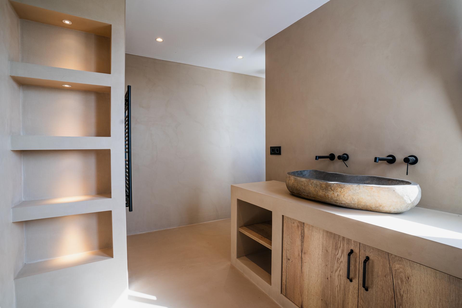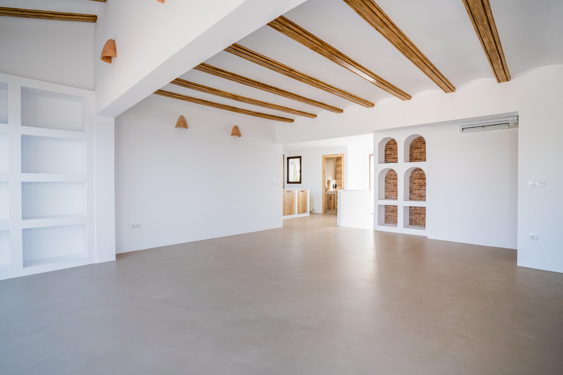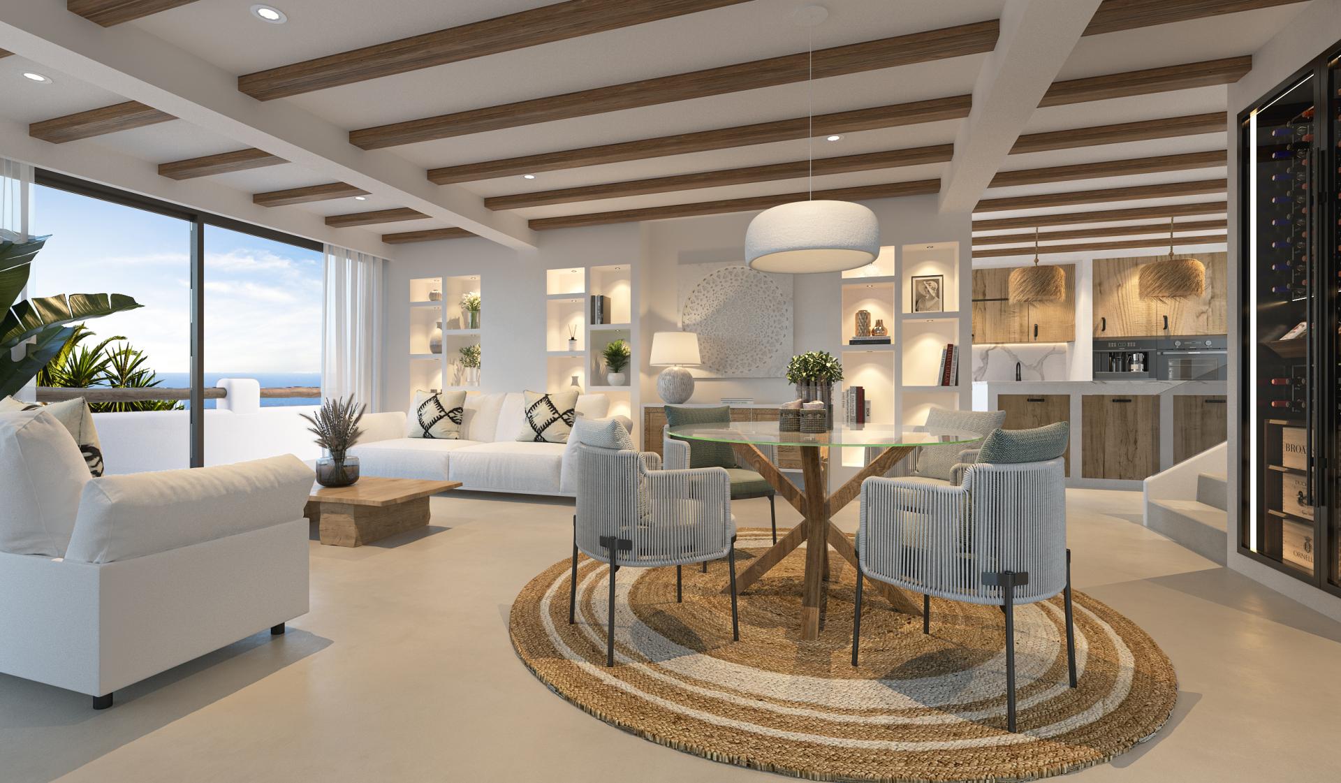 The design draws inspiration from Ibiza architecture, seamlessly blending modernity with Mediterranean influences. The warm and inviting ambiance is achieved through white walls with rounded and textured edges, wooden railings, beige micro-cement floors, and exposed wooden beams in the ceiling. The spacious rooms and expansive windows effortlessly integrate the sea into your daily living experience.