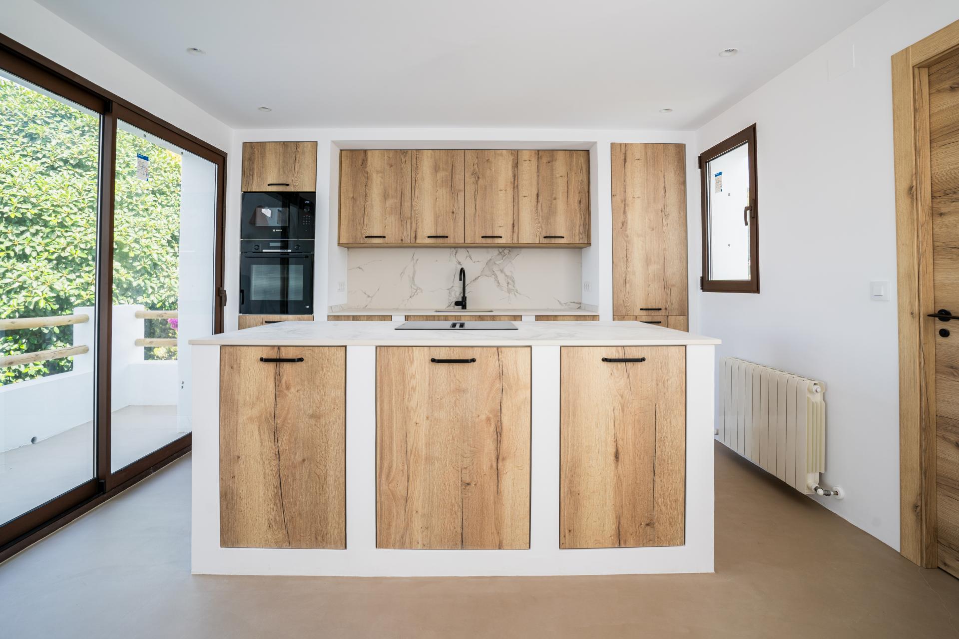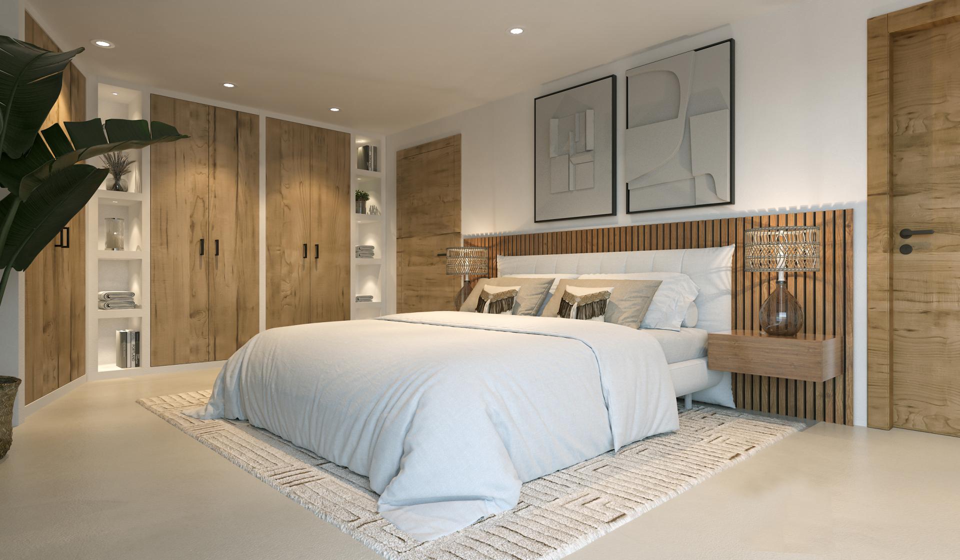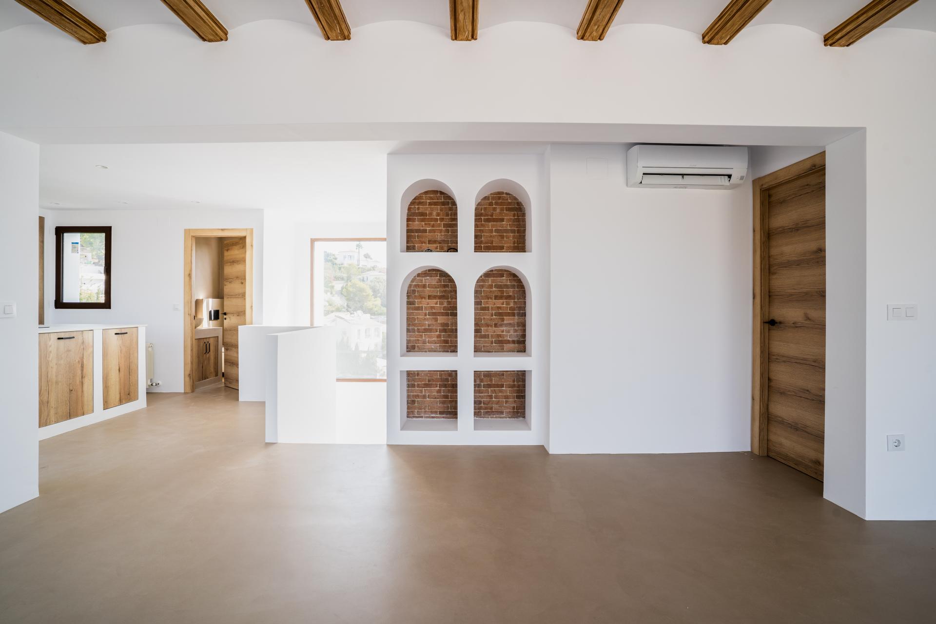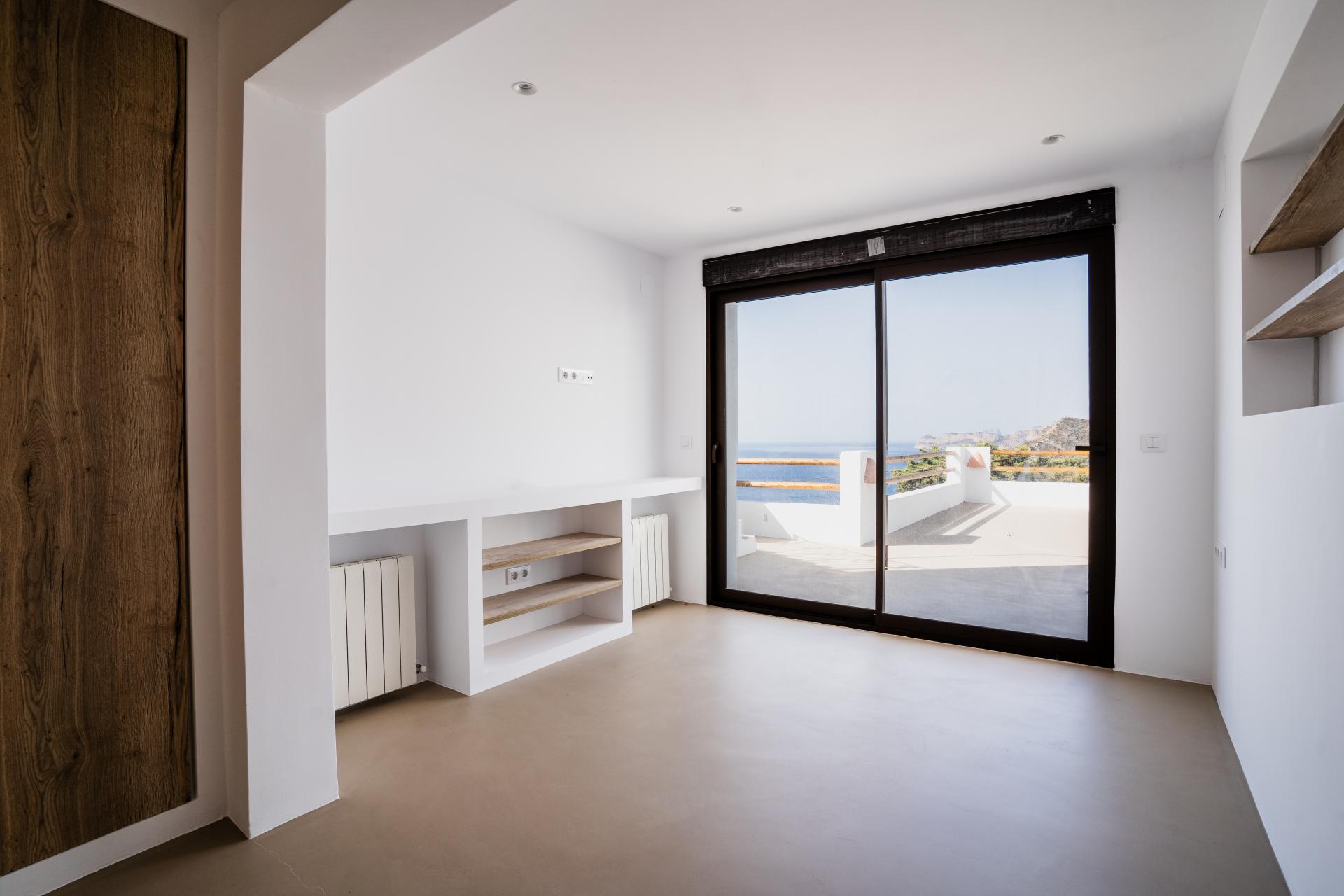 The design draws inspiration from Ibiza architecture, seamlessly blending modernity with Mediterranean influences. The warm and inviting ambiance is achieved through white walls with rounded and textured edges, wooden railings, beige micro-cement floors, and exposed wooden beams in the ceiling. The spacious rooms and expansive windows effortlessly integrate the sea into your daily living experience.