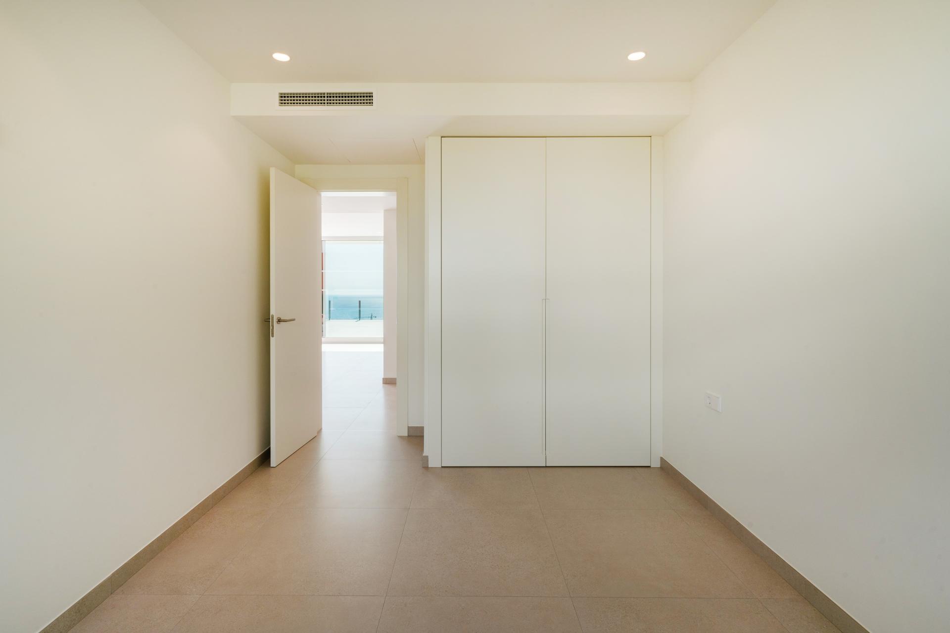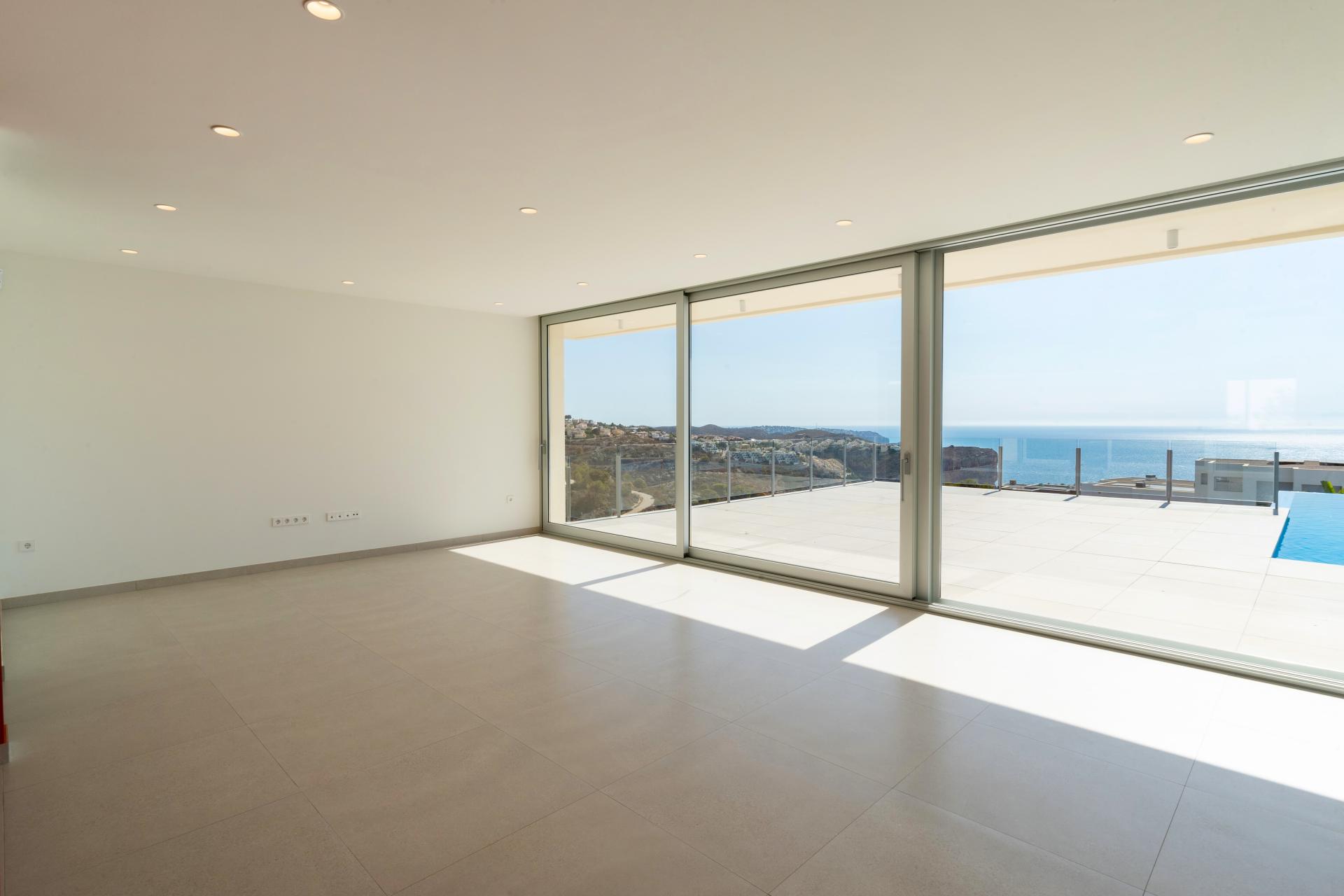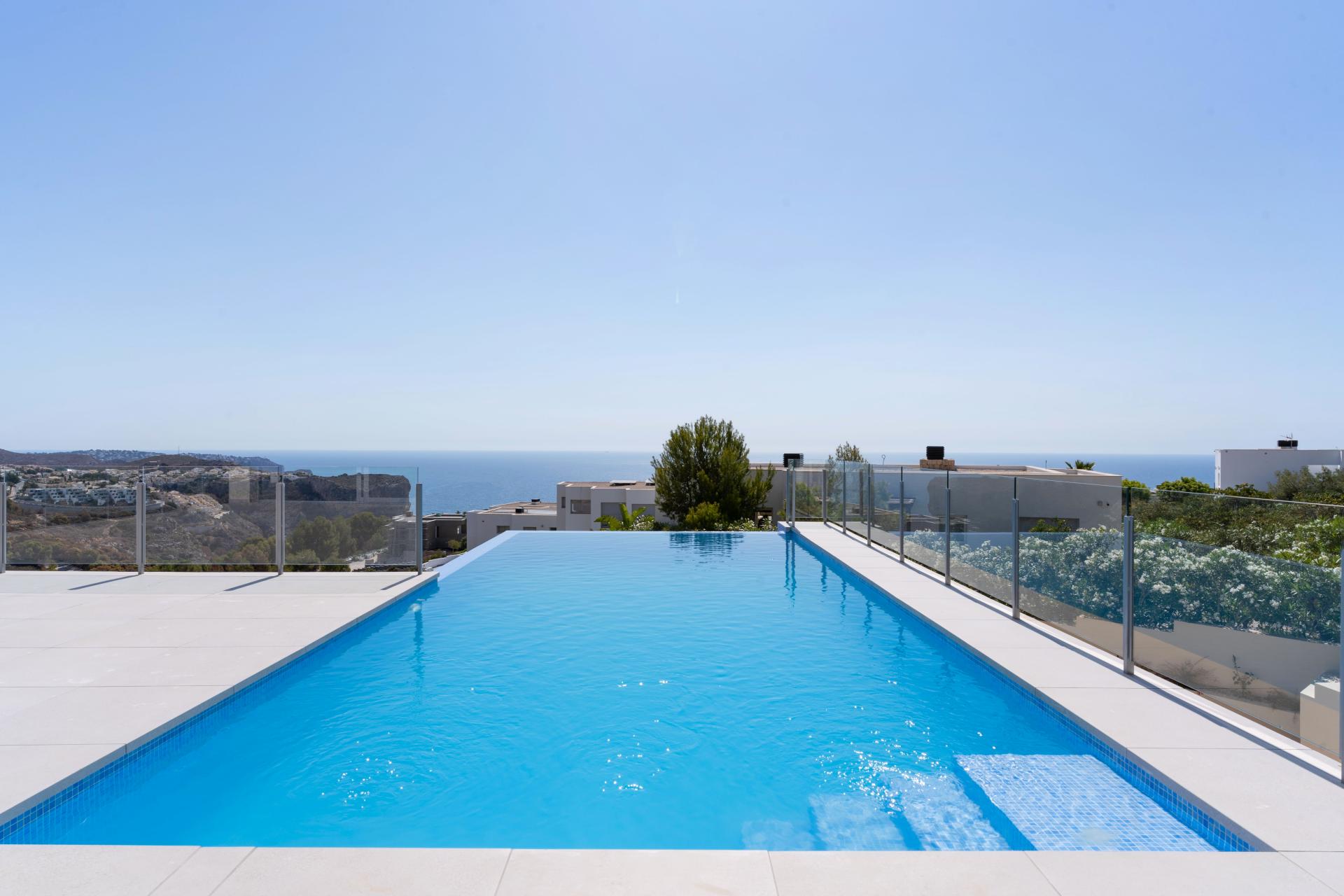 PROPERTY DETAILS Completed in January 2024 the villa has been carefully designed to retain privacy from neighbouring properties and to maximise the stunning sea views which captivate you as soon as you enter the property. Open plan living with floor to ceiling glass expanses frame the blue of the Mediterranean sea which you can enjoy from the living, dining and kitchen area a spacious area which opens onto a large terrace and to the infinity pool. The kitchen, equipped with a counter island, is ideal for both cooking and casual entertaining, while the lounge/dining area offers ample seating, formal dining options, and a feature wall with display shelving. The villa boasts a total of four bedrooms, including a master suite with an ensuite bathroom and two double bedrooms that share a family bathroom, all featuring built-in wardrobes. Additionally, an exterior staircase leads to an independent apartment with its own ensuite bathroom, providing the perfect space for guests or older, independent family members. Access to the property is through remote-controlled gates, leading to a long driveway with ample parking. The Mediterranean garden, designed for low maintenance, features auto irrigation and a variety of plants and shrubs, incorporating natural stone elements.