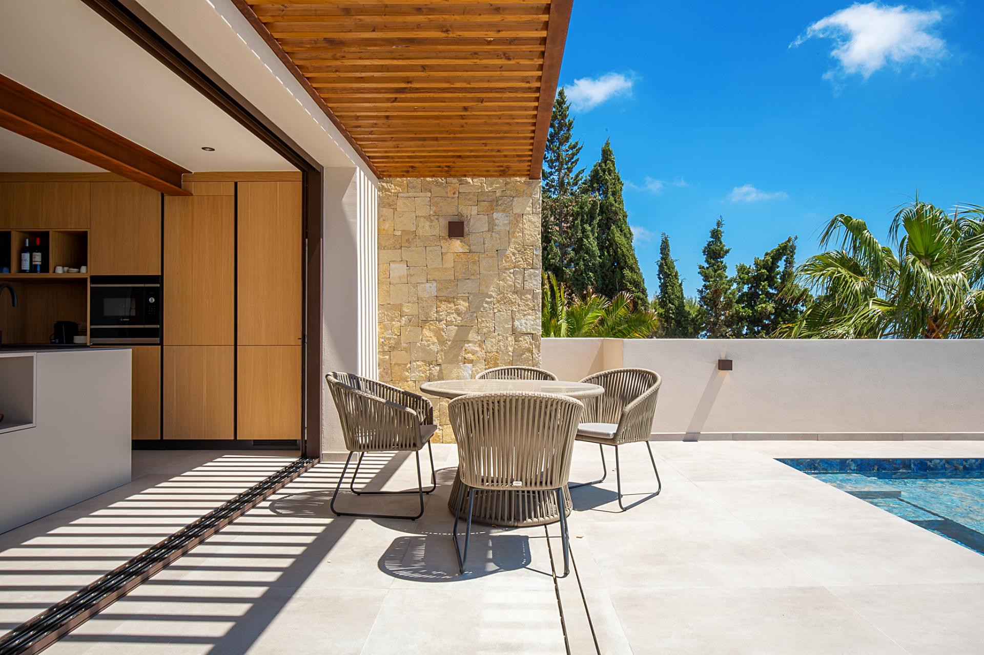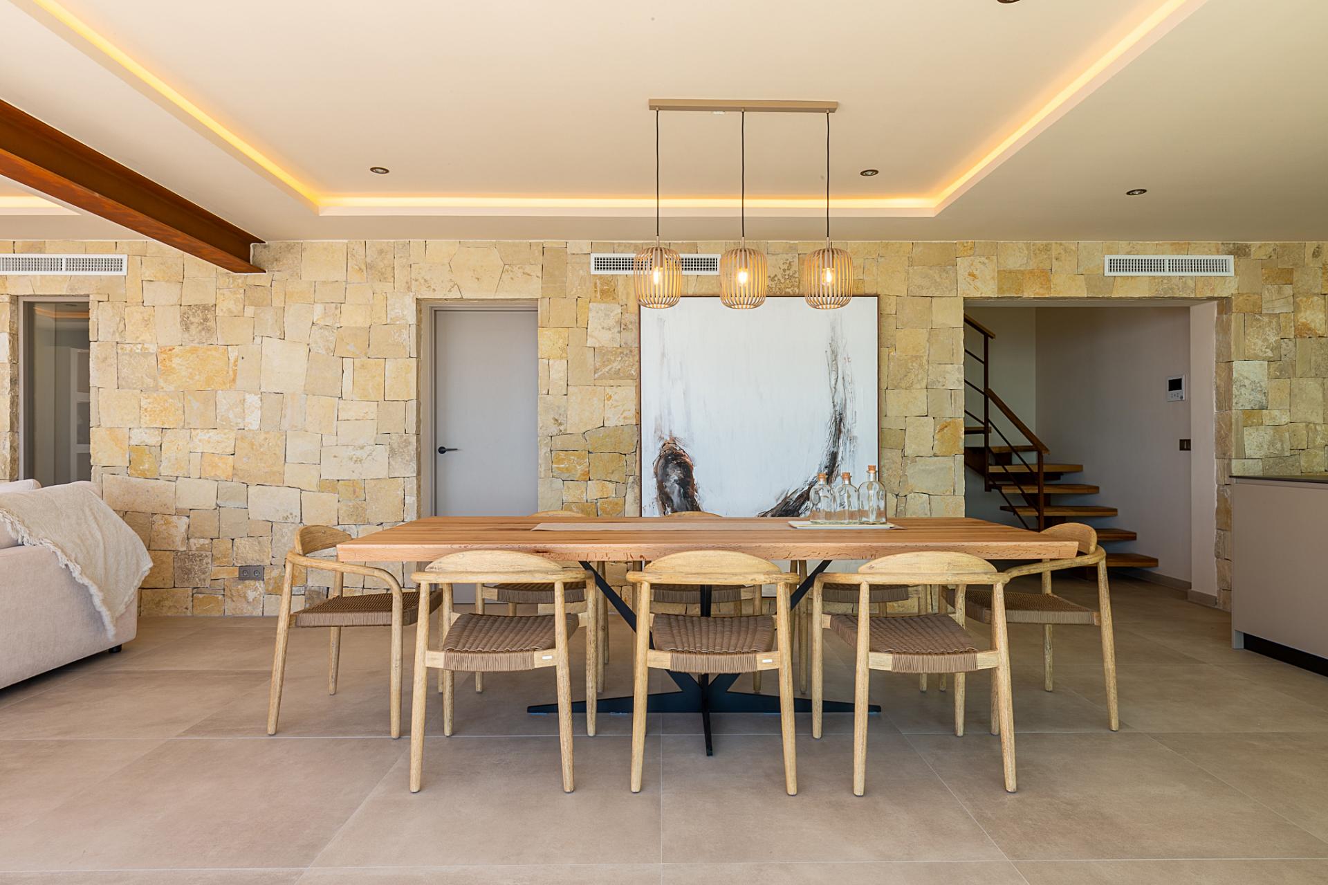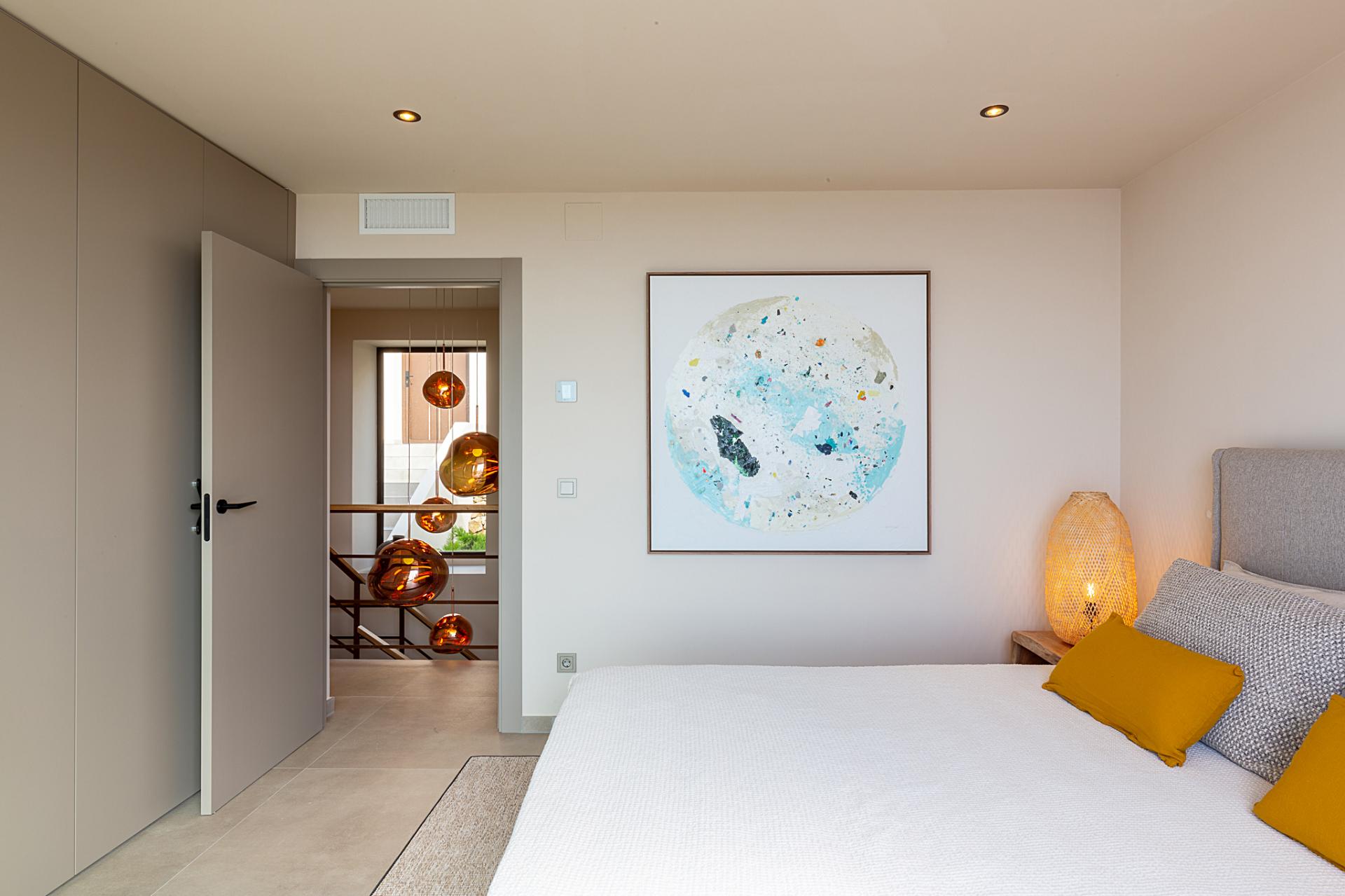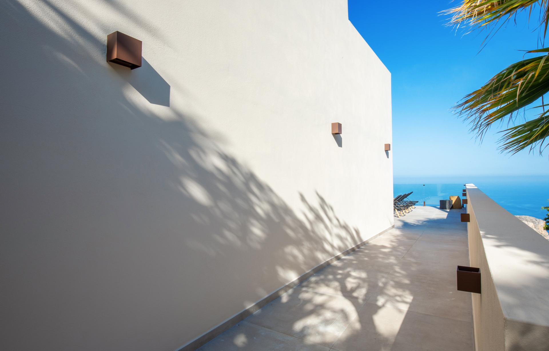 The outdoor terrace offers various areas for relaxation and dining, with partial shading provided by an overhead wooden slatted roof. The mesmerising infinity pool allows for a luxurious bathing experience with uninterrupted sea views, complemented by an outdoor shower. Just a few steps away, the fourth bedroom is designed as a guest suite, complete with an ensuite bathroom, dressing room, and a private terrace.