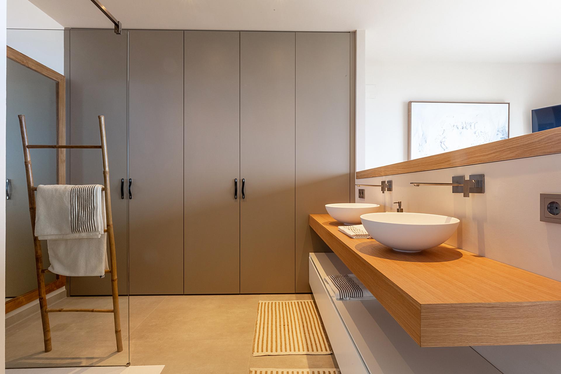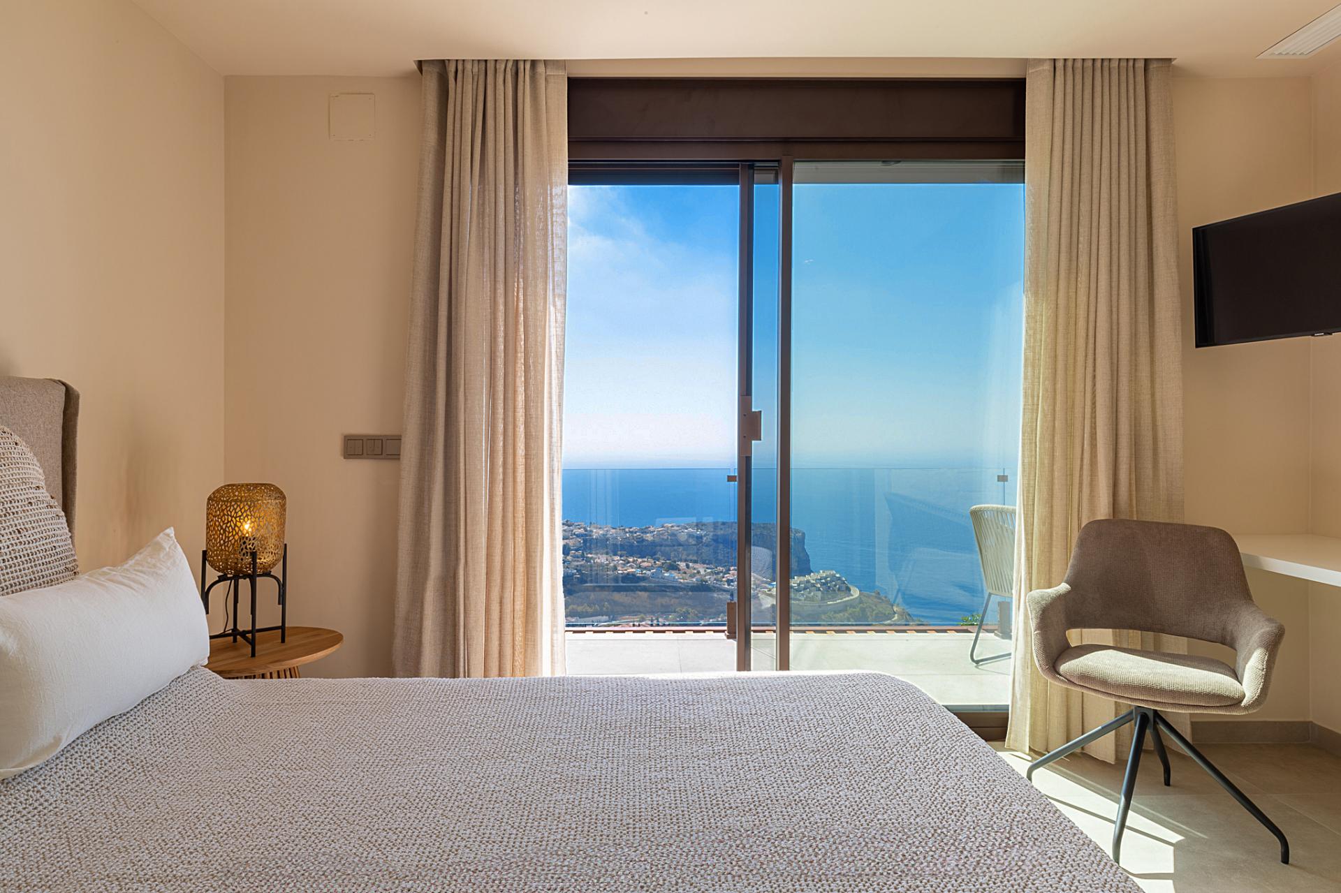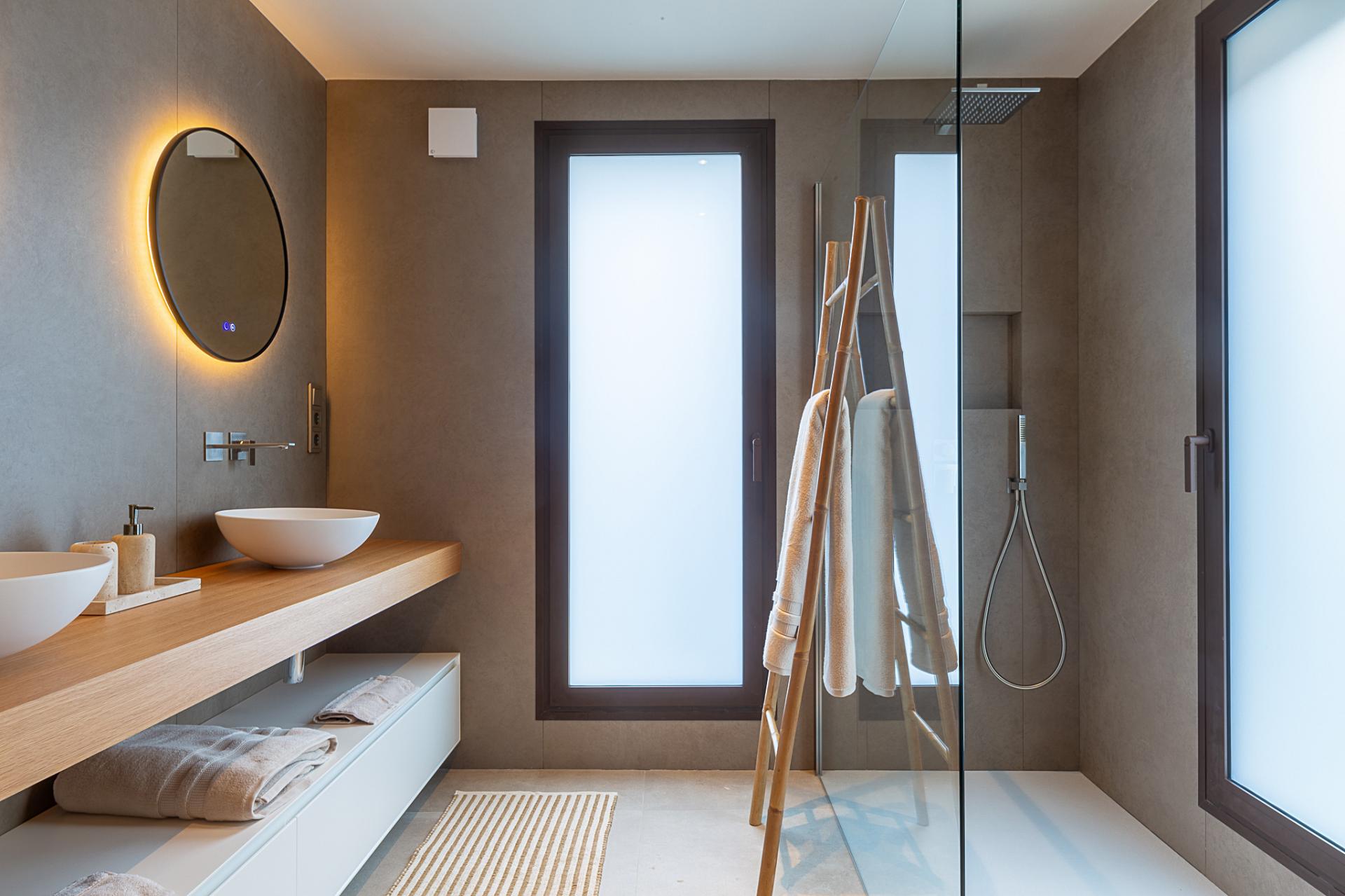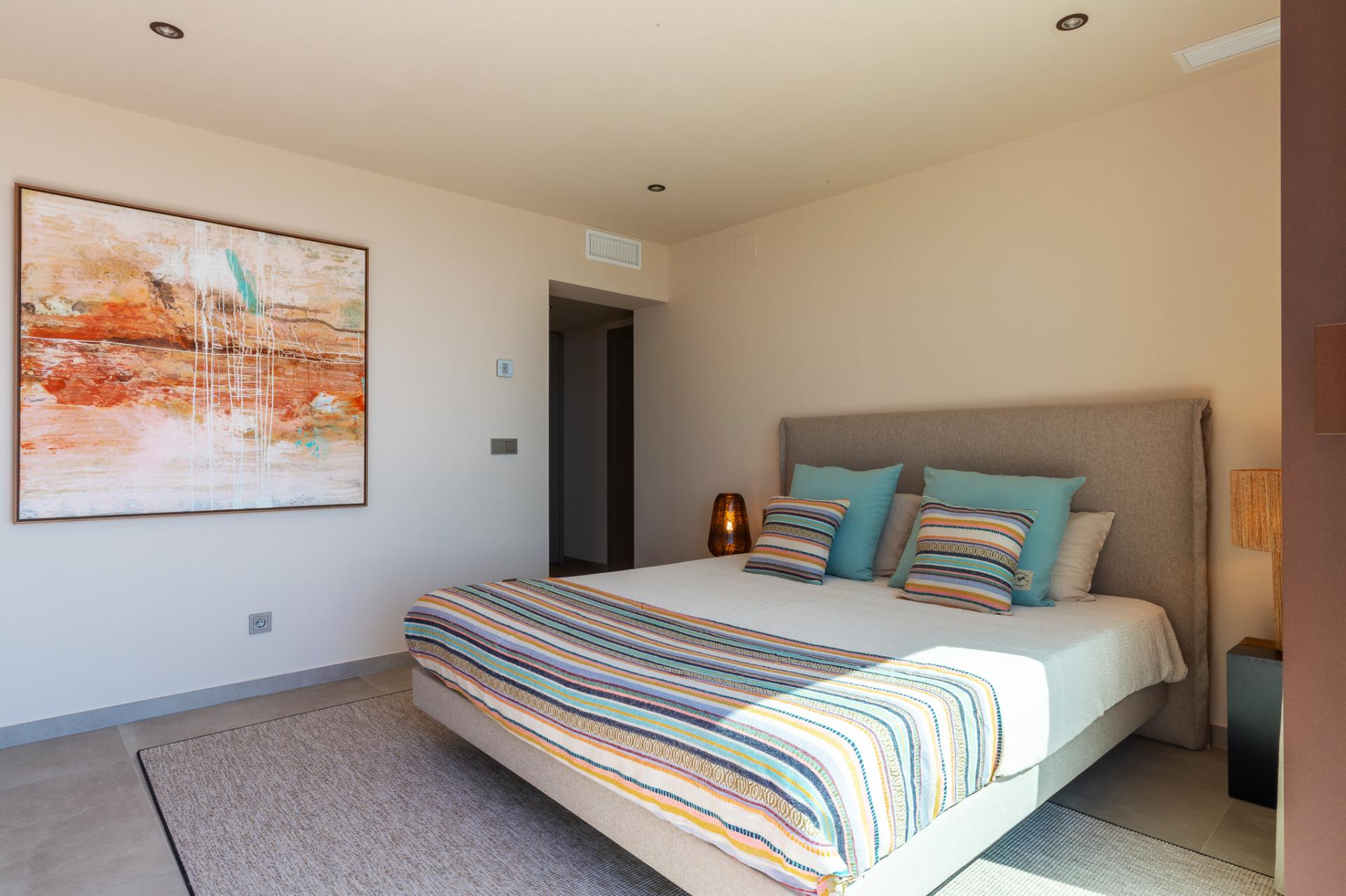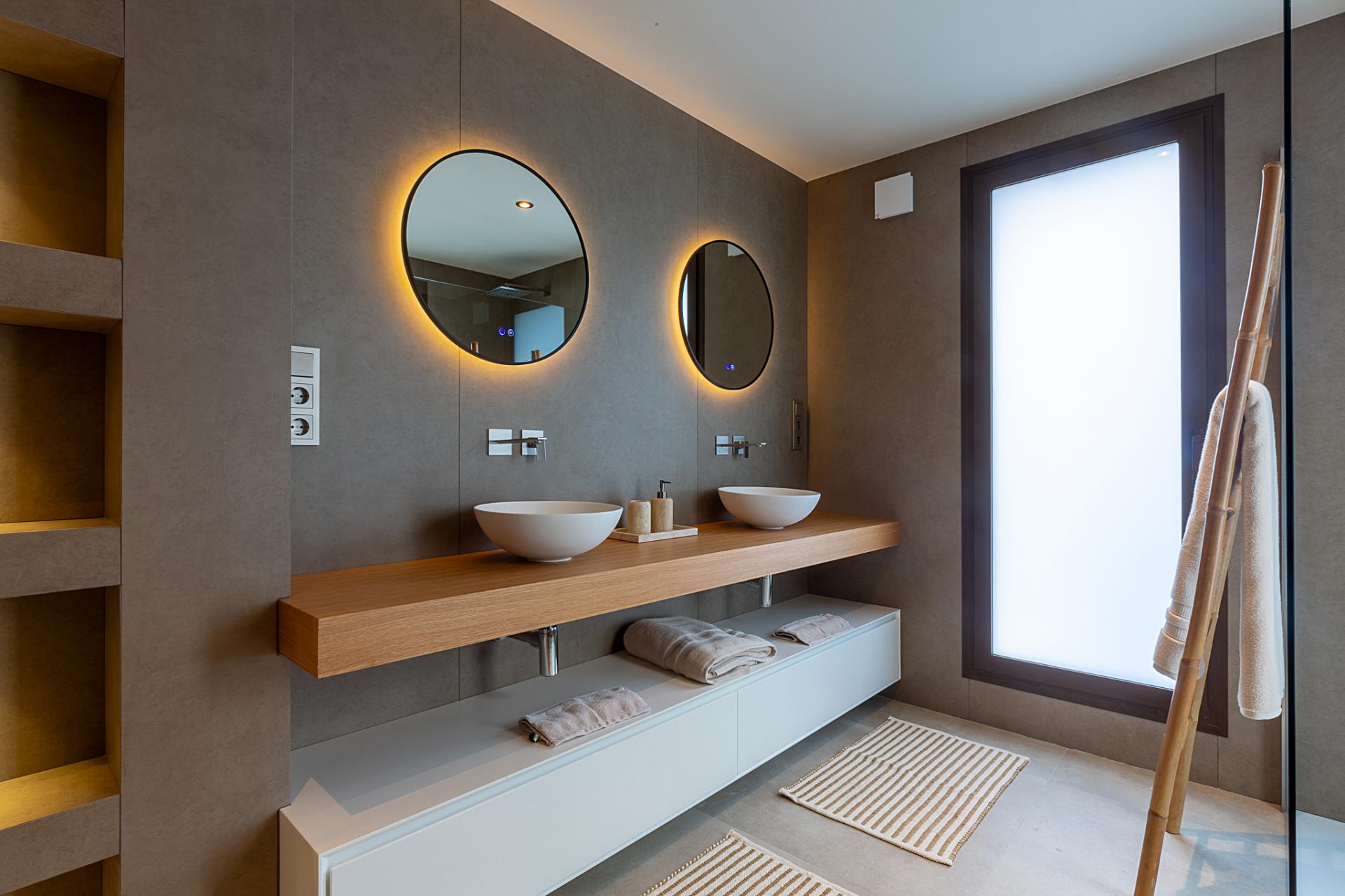 The outdoor terrace offers various areas for relaxation and dining, with partial shading provided by an overhead wooden slatted roof. The mesmerising infinity pool allows for a luxurious bathing experience with uninterrupted sea views, complemented by an outdoor shower. Just a few steps away, the fourth bedroom is designed as a guest suite, complete with an ensuite bathroom, dressing room, and a private terrace.