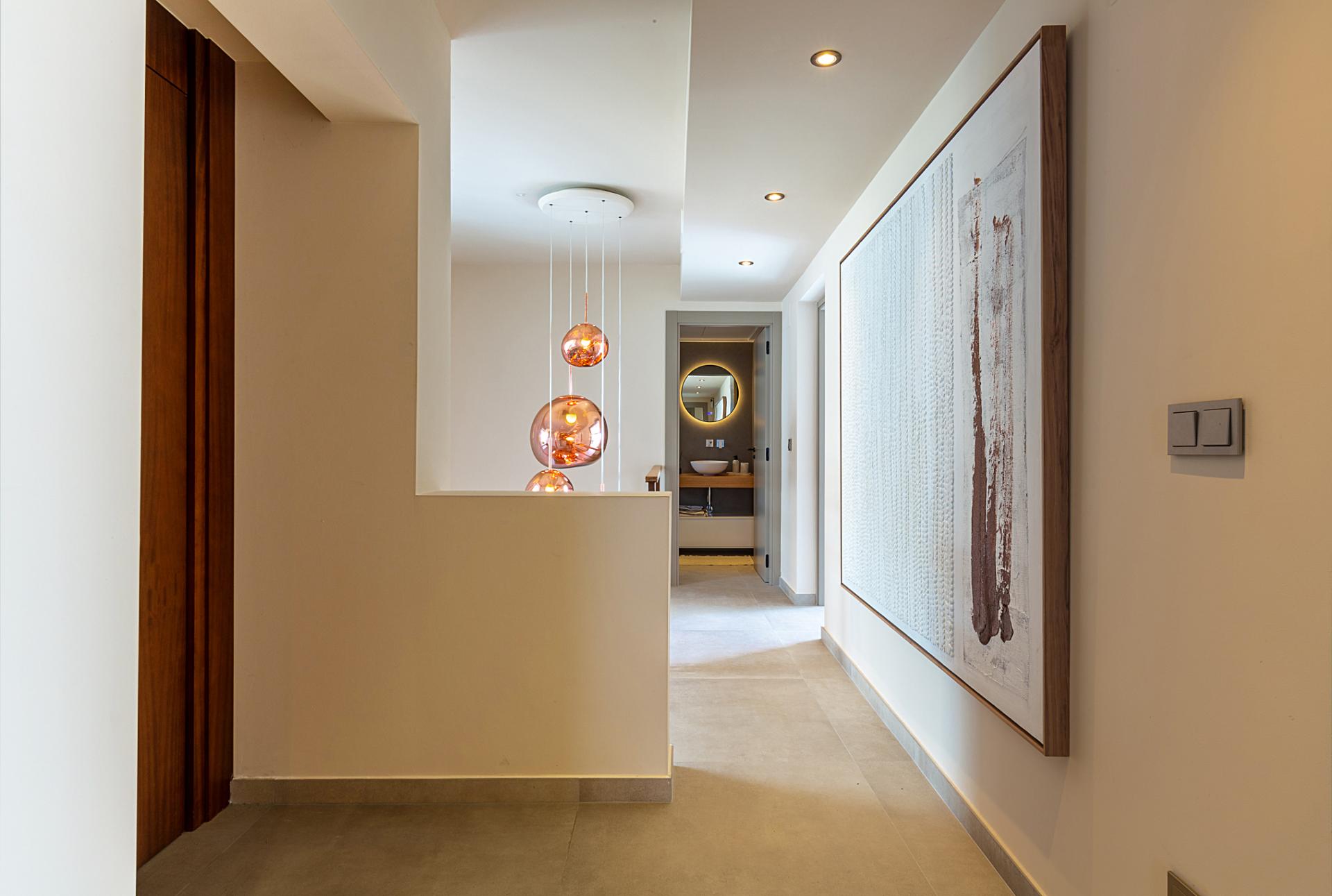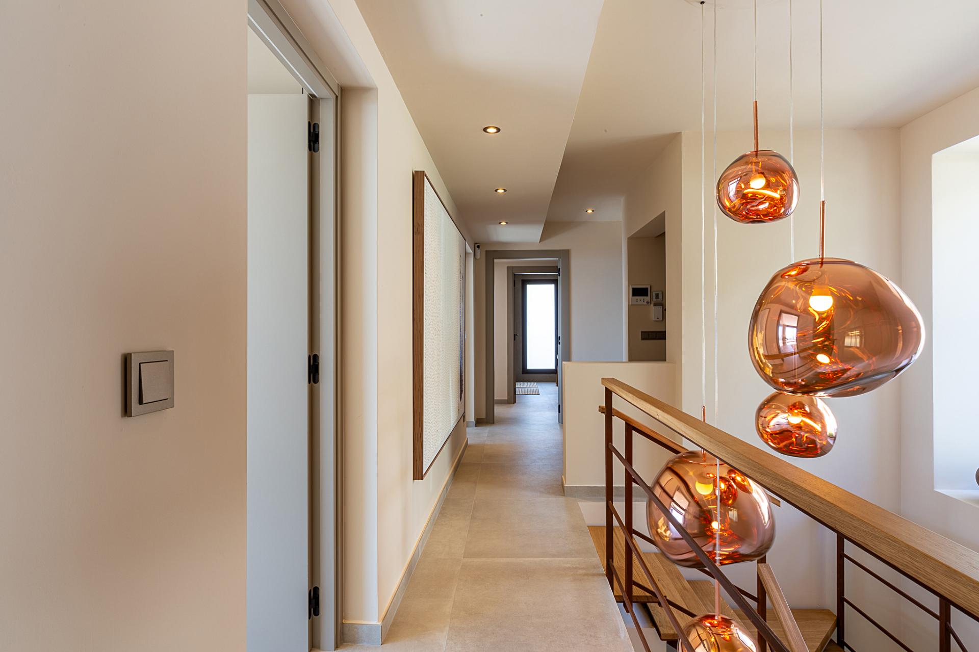 A stylish staircase adorned with a suspended light fitting, resembling a work of art, leads you down to the expansive living area. This open-plan space includes a living room with built-in shelving with lights, a formal dining area with an elegant light fixture, and a sleek designer kitchen. An impressive 11-meter Technal glass expanse fully opens to the pool and terrace, creating a seamless indoor-outdoor living experience and showcasing the stunning sea view. LED lighting in the ceiling adds a touch of magic, creating a wonderful ambiance when illuminated at night. This level also features a utility room and a guest toilet.