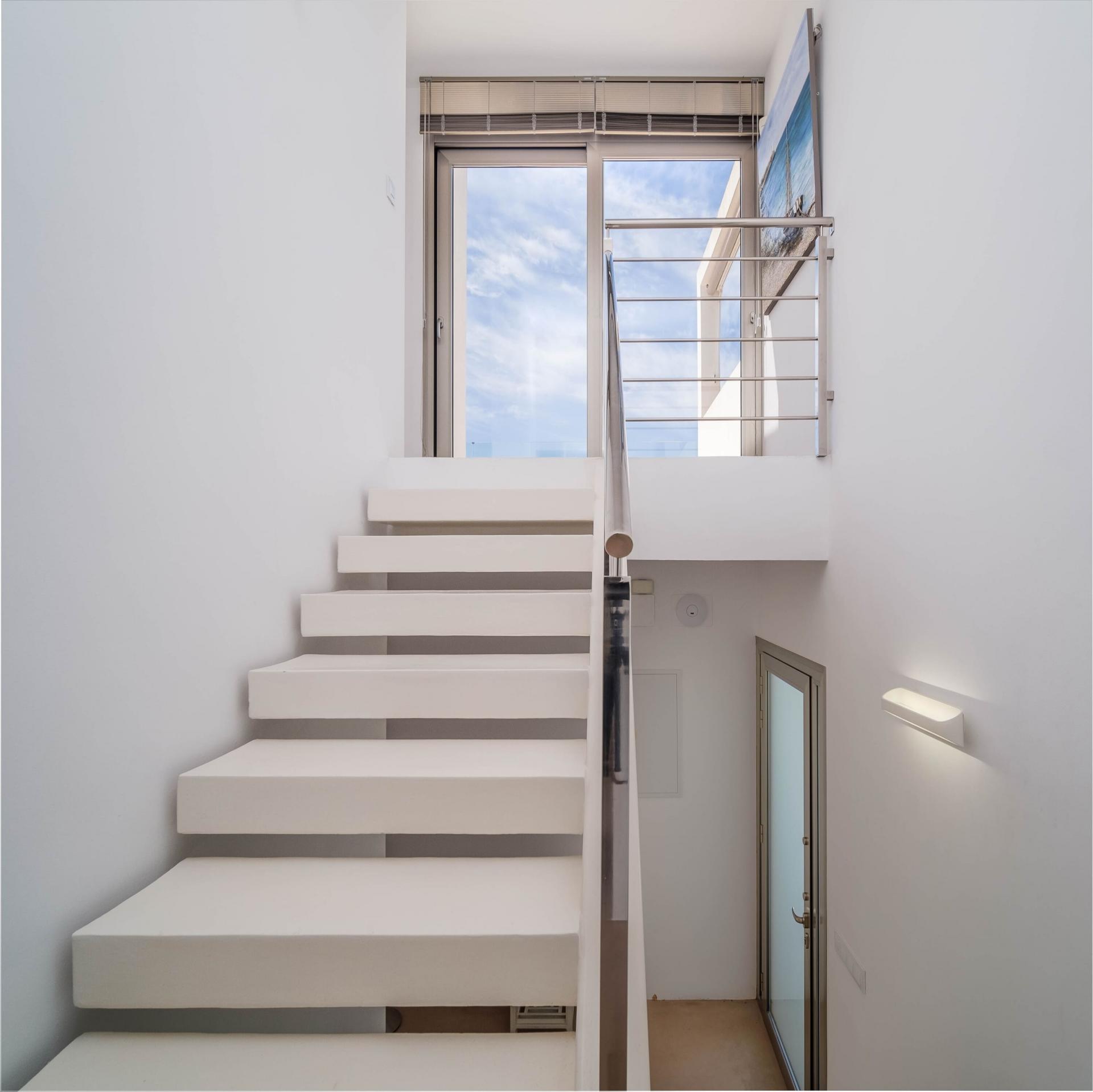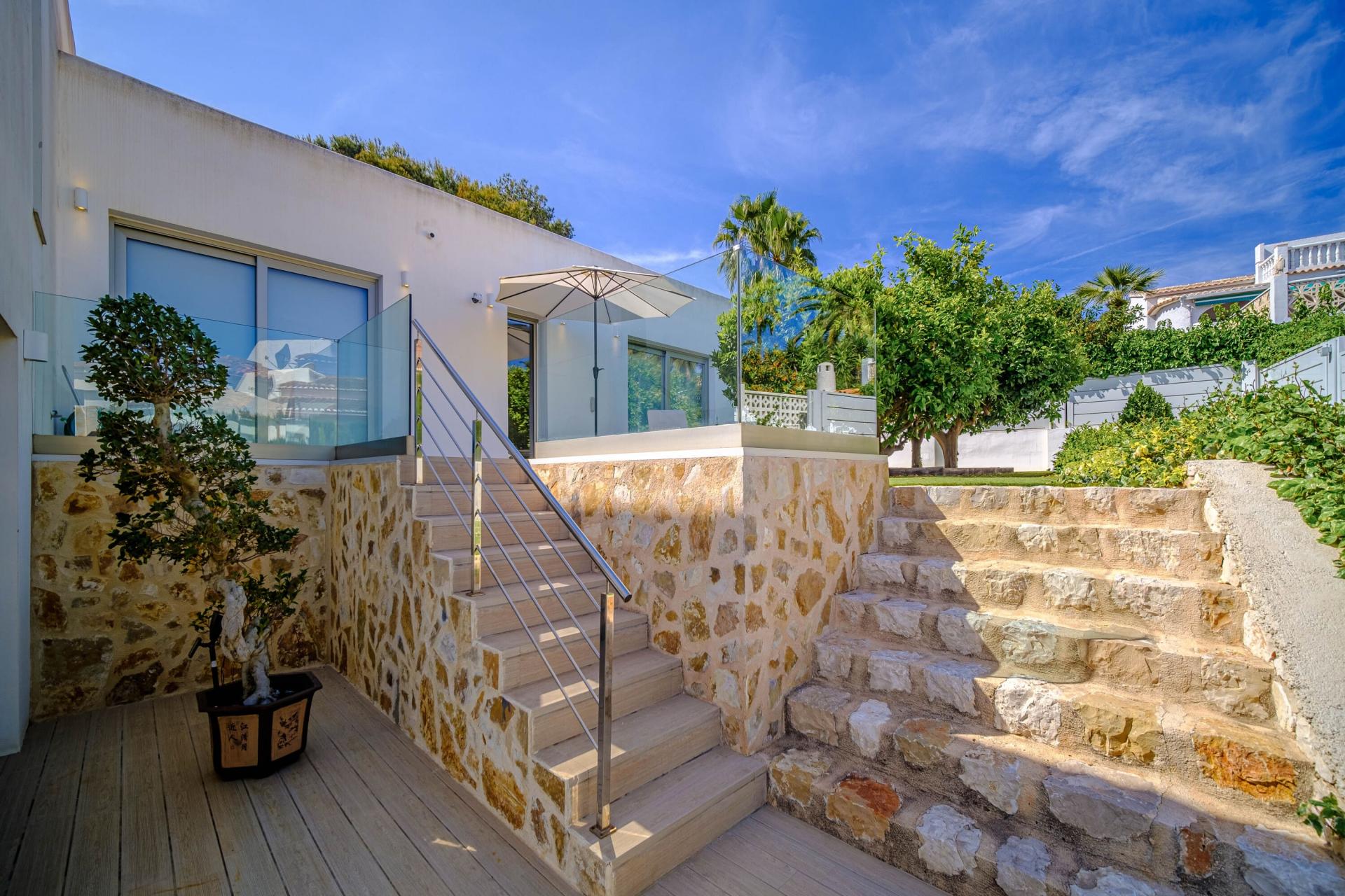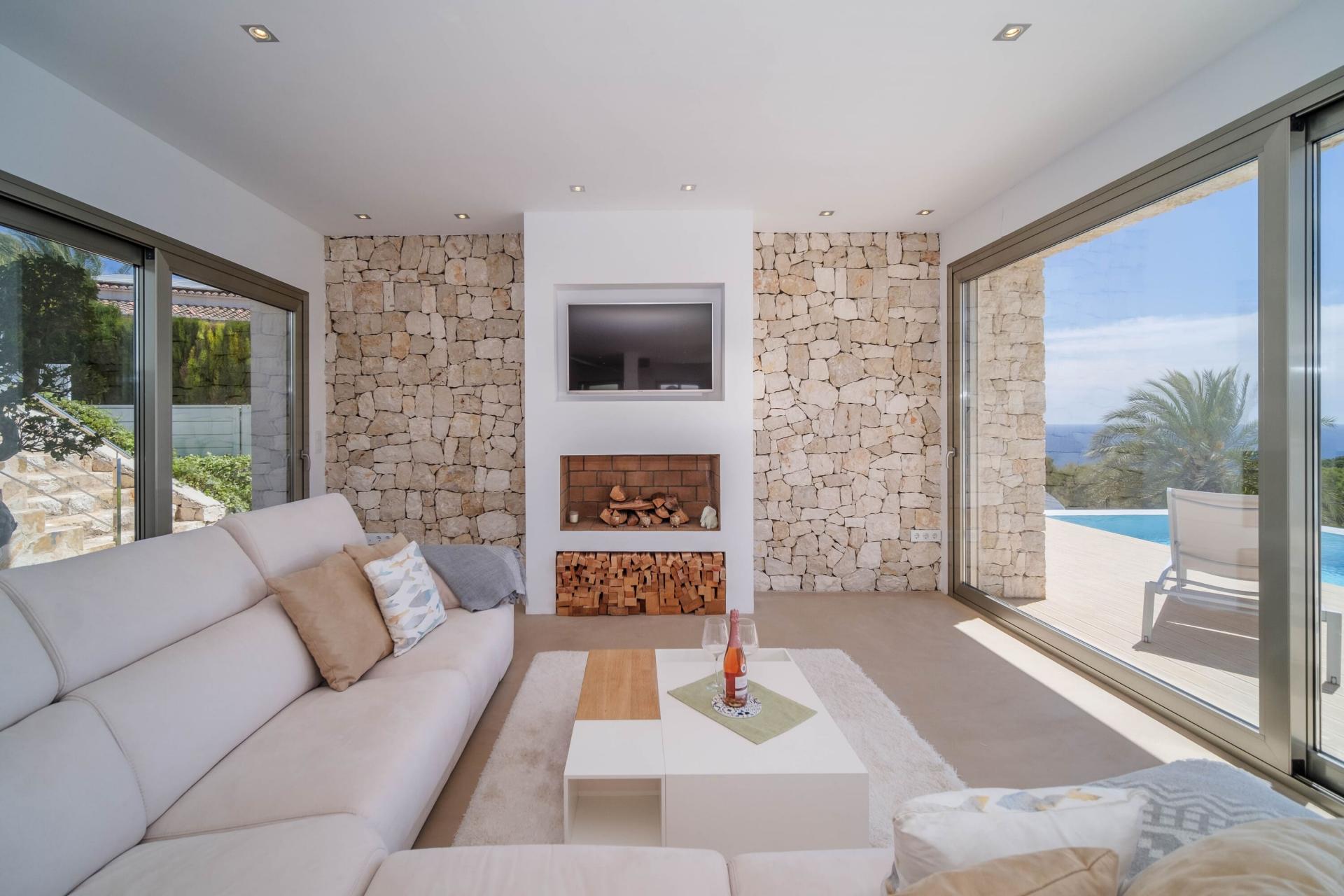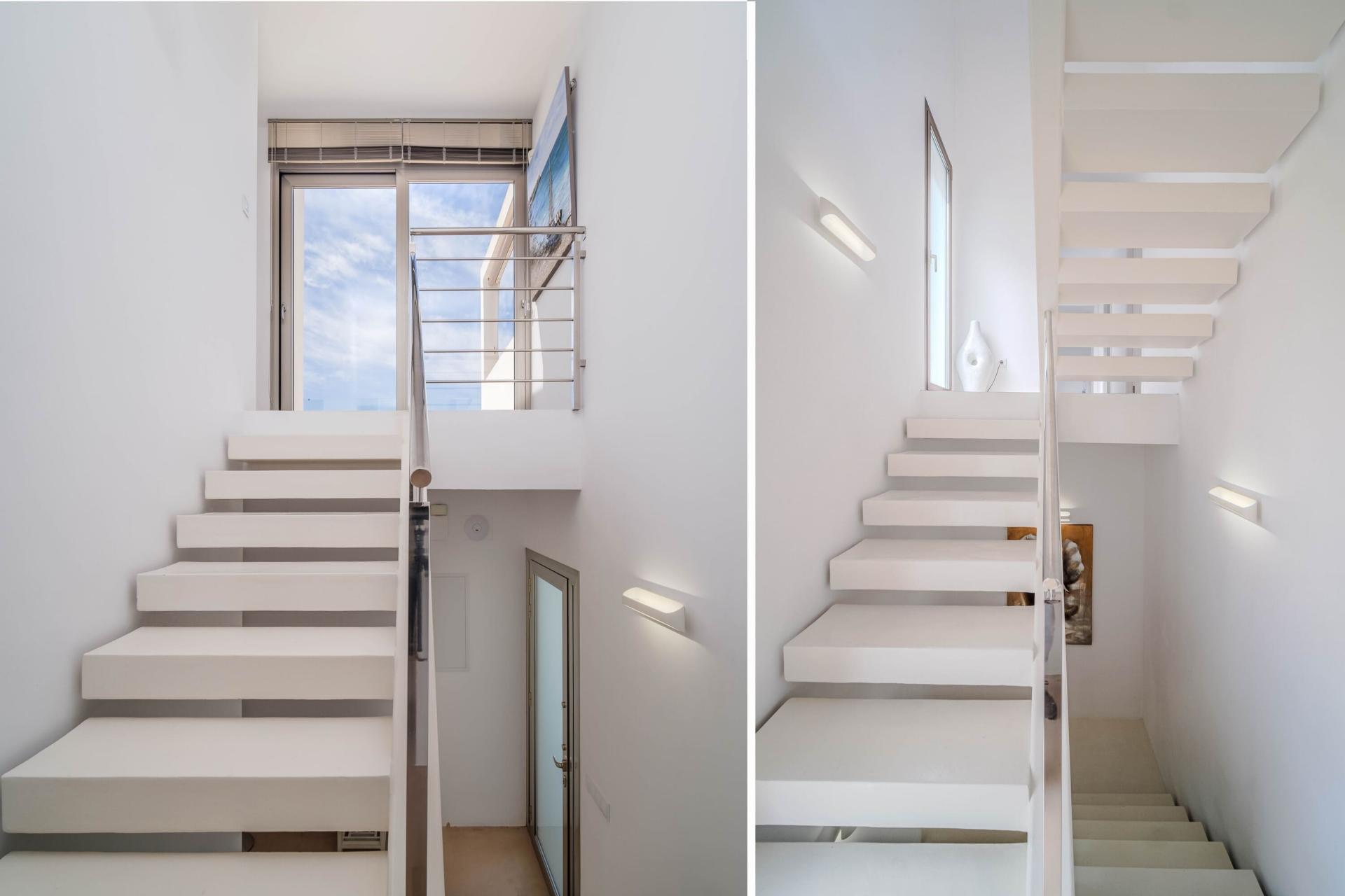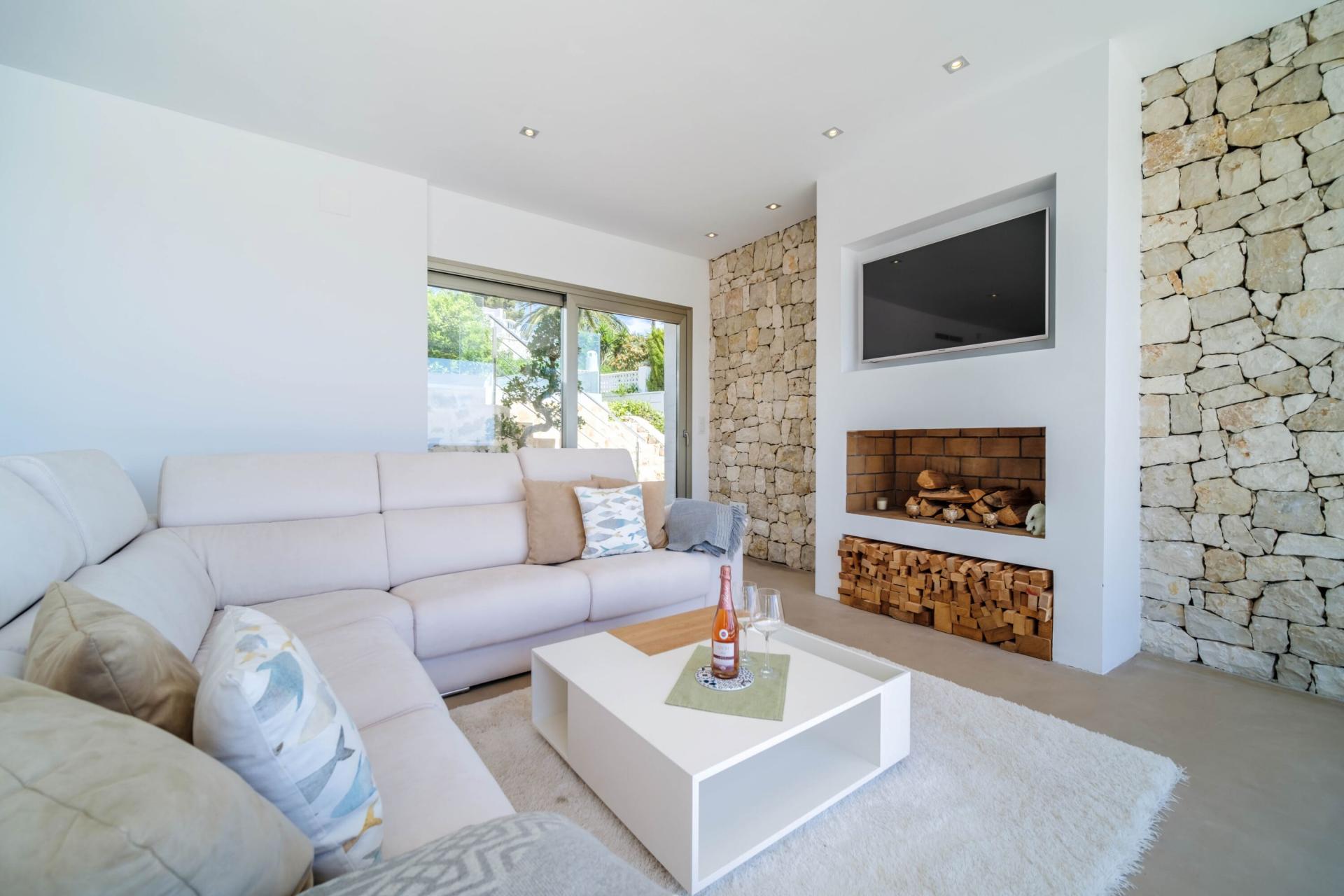 PROPERTY DETAILS Architecture & Design This exceptional villa is a celebration of modern Mediterranean architecture, blending sleek white render with rugged natural stone façades that echo Jávea’s coastal charm. The clean-lined design is softened by organic textures and expansive glass that floods the interiors with natural light while framing mesmerising sea views. Built across multiple split levels, the property offers both architectural interest and enhanced privacy, with each zone intuitively flowing into the next. The exterior, with its wide terraces and glass balustrades, invites the landscape to become part of everyday living.