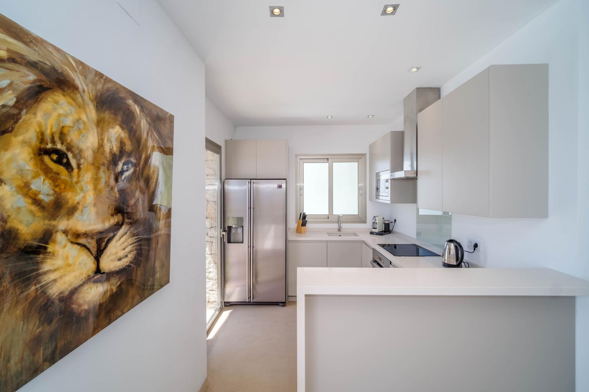 Interior Layout From the moment you enter, the open-plan living and dining area sets a relaxed yet refined tone. Neutral tones, polished concrete floors, and soft furnishings create an elegant atmosphere, while stone accent walls and a fireplace add warmth. Floor-to-ceiling sliding doors connect the living space to the terrace and pool, blurring the lines between inside and out. The American-style kitchen is modern and fully integrated, offering a sociable space for hosting or daily living. The villa comprises four double bedrooms—three with direct outdoor access. The master suite crowns the upper level, complete with an ensuite bathroom, freestanding soaking tub with sea views, and a private terrace for sunrise coffee or evening wine.