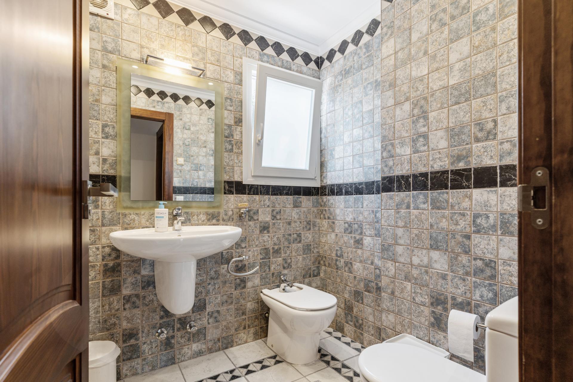 Interior Layout Distributed over two levels, the main floor welcomes with a light-filled glazed naya, flowing into a tranquil reading lounge. A striking reception room leads to a spacious living area where tosca stone arches and a wood-burning fireplace create a warm, elegant ambiance. The adjacent formal dining room and a secondary sitting area offer both intimacy and flow. The modern kitchen is fully renovated with sleek cabinetry and high-end Miele appliances. Two generous ensuite bedrooms, including the principal suite, are situated on this level, complemented by a guest WC. The lower level provides a highly versatile and self-contained space, ideal for extended family or visiting guests. It includes two additional double bedrooms, a Jack-and-Jill bathroom, and a bright living room with direct access to the pool and garden terraces. A dedicated office and a large library with a reading area offer serene, multifunctional zones that could easily be converted into a home cinema, games room or private gym, depending on lifestyle needs. A separate laundry room with exterior access, a technical room, and multiple storage areas further enhance this level’s practicality and independence.
