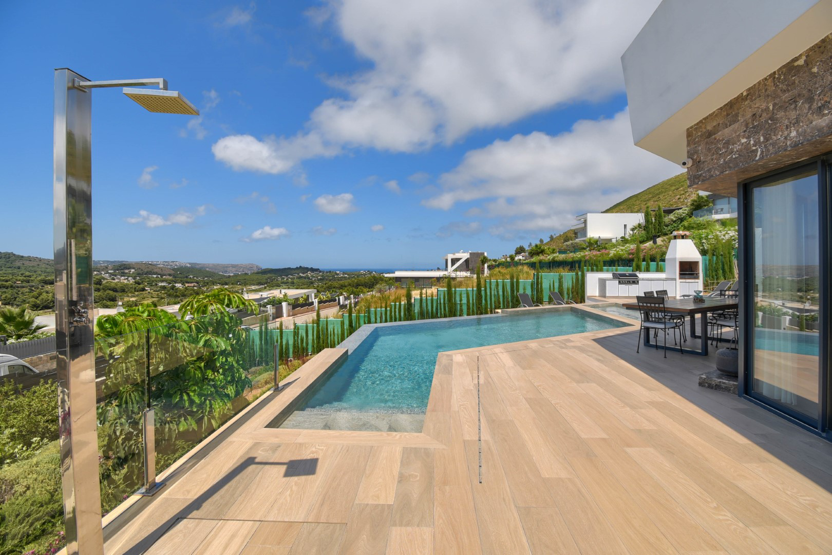 The main floor comprises 2 double bedrooms and one bathroom, a large open-plan kitchen, dining and living room that opens onto the large terraces for seamless indoor-outdoor living. The infinity pool and Jacuzzi are both heated and controlled separately, with views over Jávea and the surrounding villages. Also, for the barbeque chef there are 2 barbecues with a gas and carbon burner, perfect when entertaining family and friends.