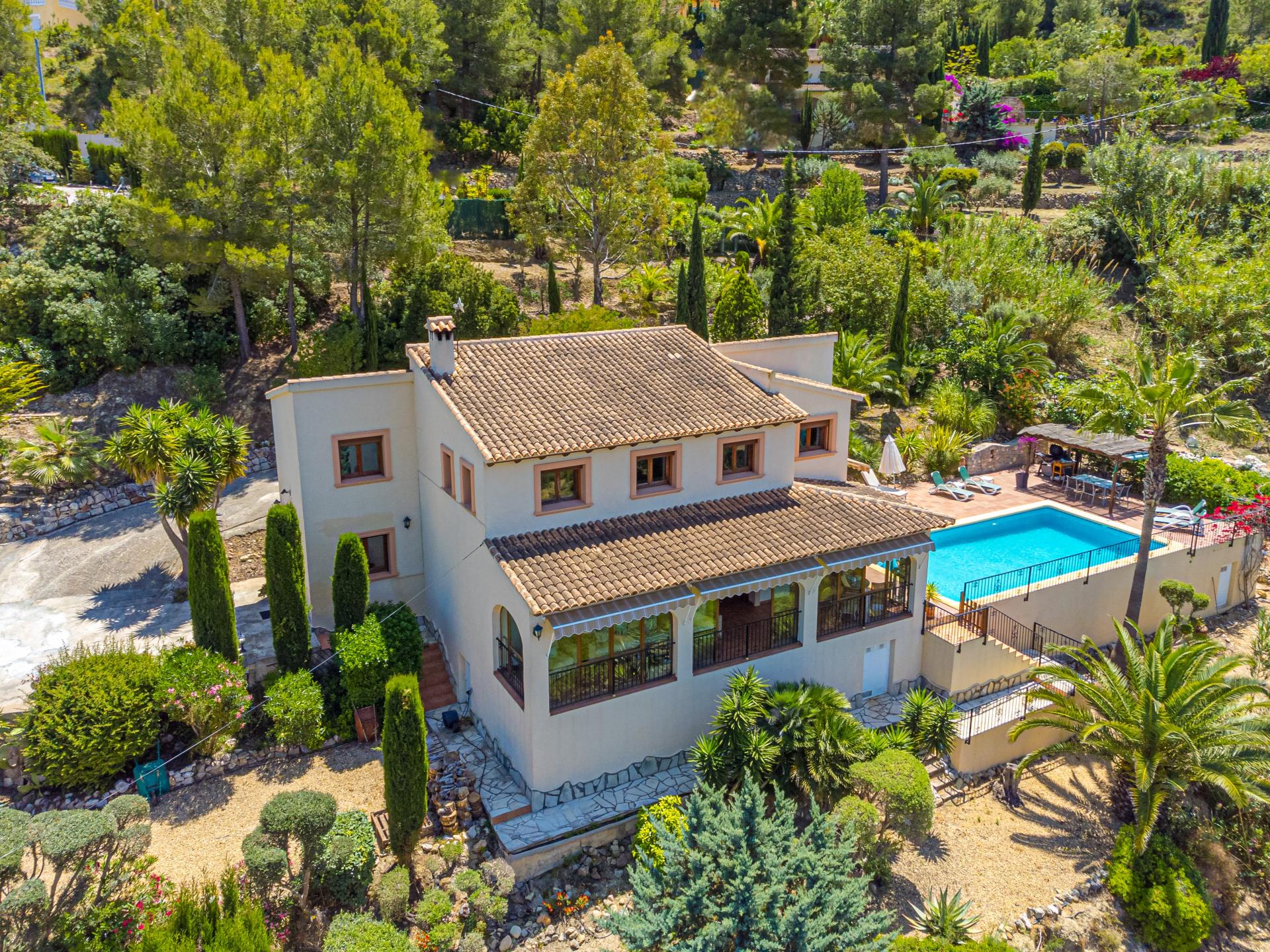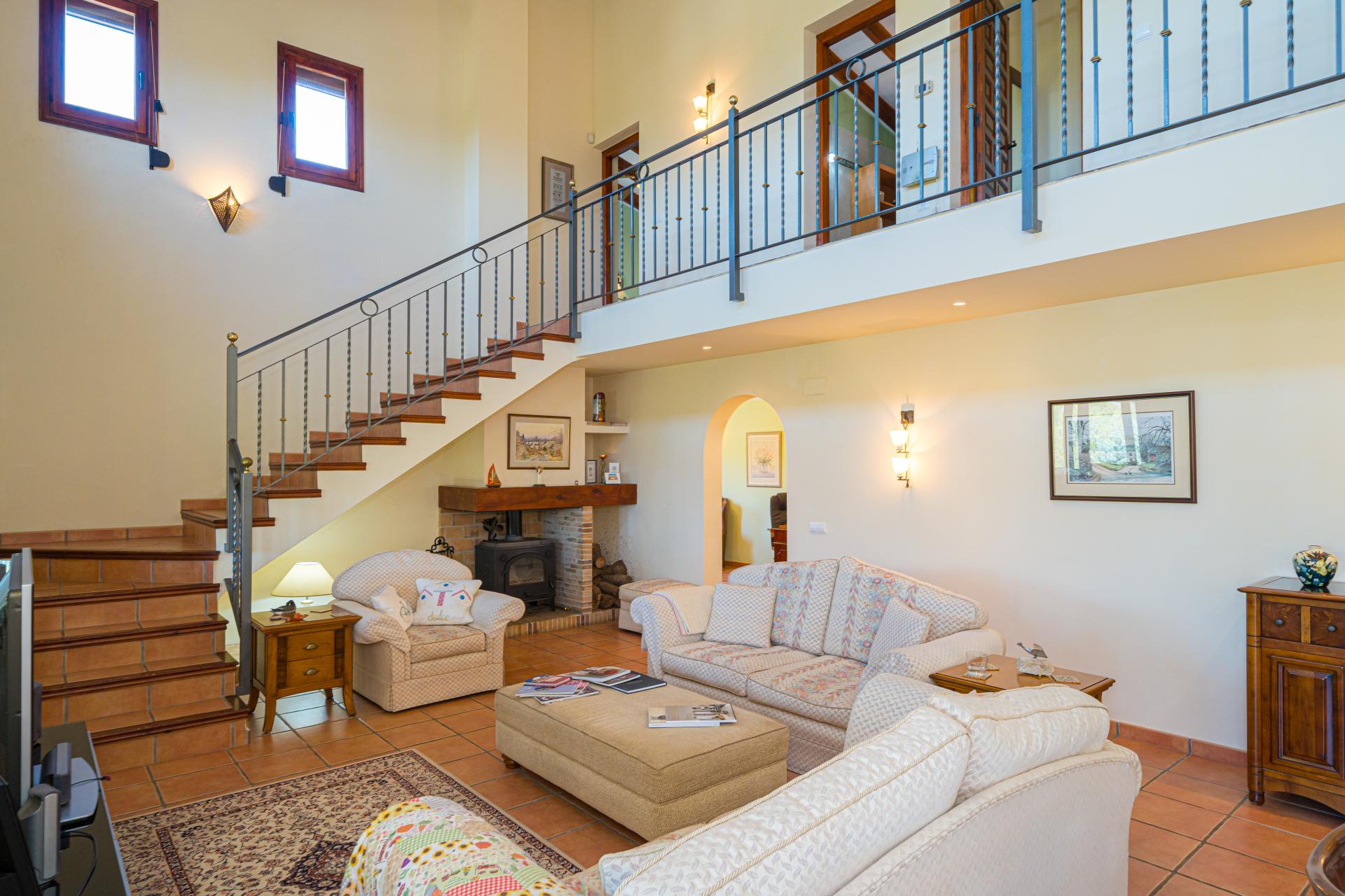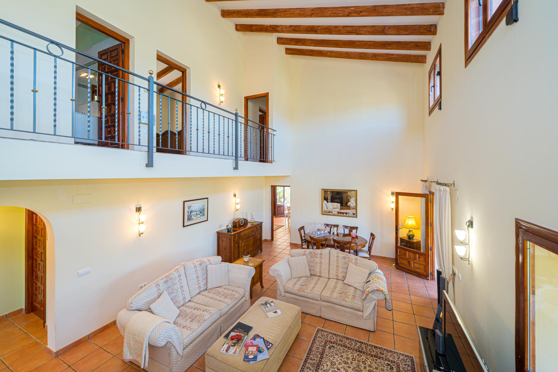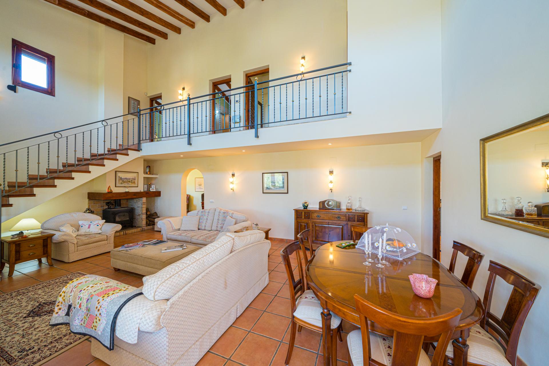 Very private the property is accessed via electric gates with a long drive and ample parking for several vehicles. An impressive main frontage with entrance door opens into the spacious hallway currently used an an office area, the main living area is a wonderful room that immediately catches the eye with it´s double height ceiling and glass expanses allowing the abundant natural light to flood the area creating a welcoming and uplifting ambience and draws the eyes to the statement staircase and upstairs balcony highlighting the overall flexibility of the room to accommodate furniture arrangements for lounging, dining and for hosting gatherings and entertaining as the area opens onto a glazed terrace with additional relax areas to enjoy the fabulous views and which leads to the pool and terracing for that seamless indoor outdoor living, the ample fully fitted kitchen includes an American style fridge freezer, an under sink drinking water filtration system and benefits from an additional casual dining area that opens with door access to the terrace area and pool, there is also a separate utility/laundry room, the wrought iron staircase takes you to the upstairs galleried sleeping area where you will find 3 bedrooms and two bathrooms including the master ensuite bedroom with a separate dressing room.
