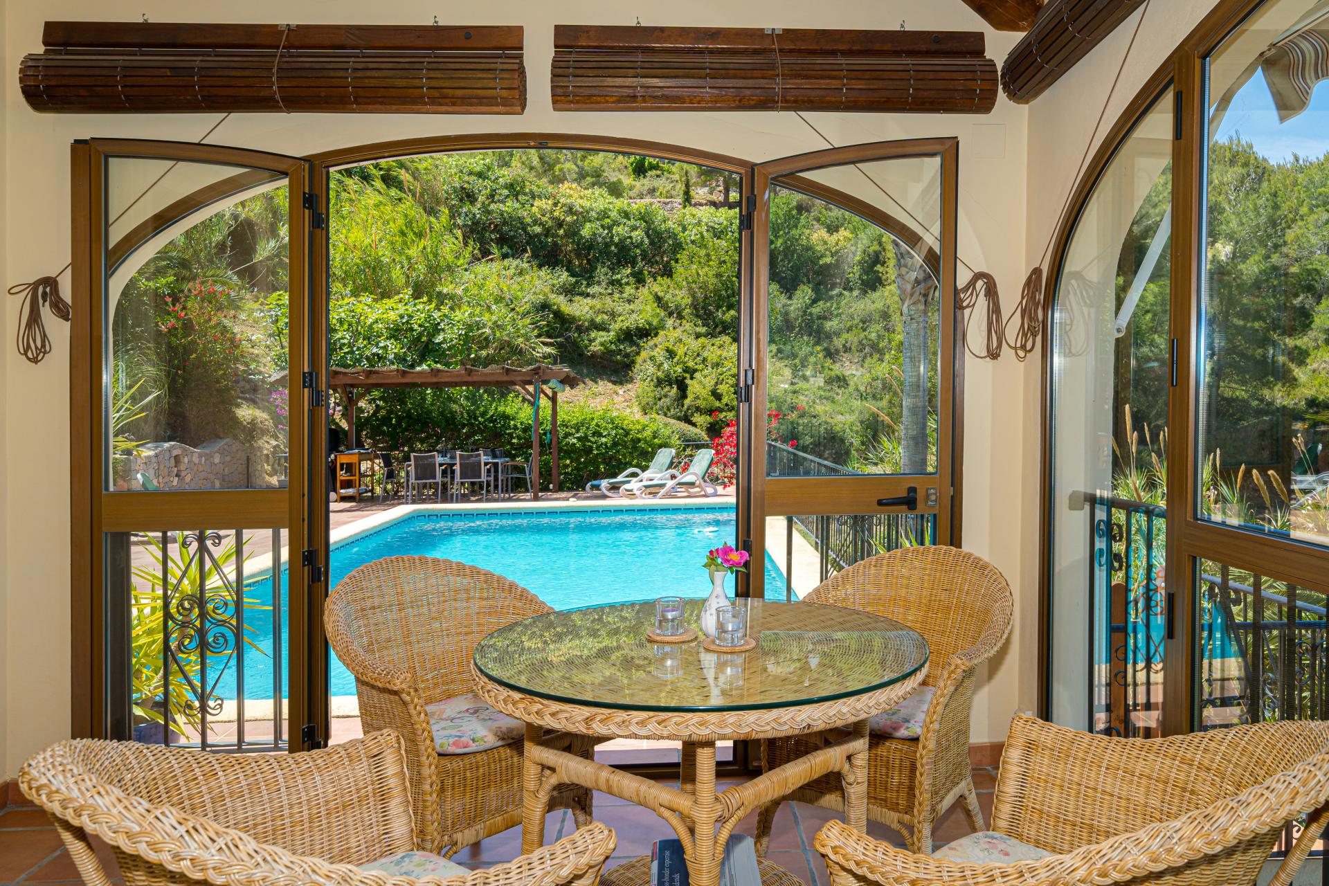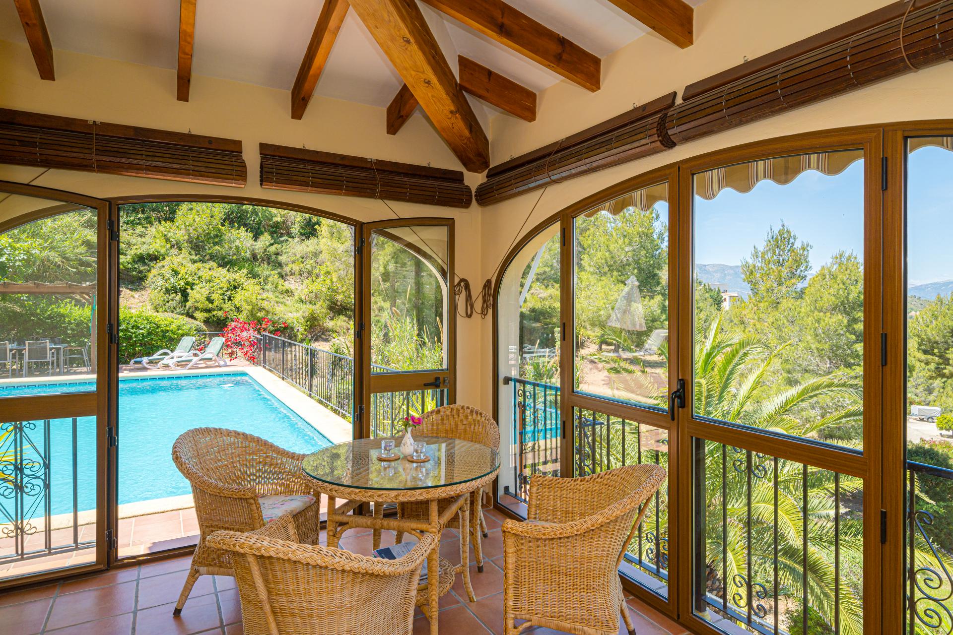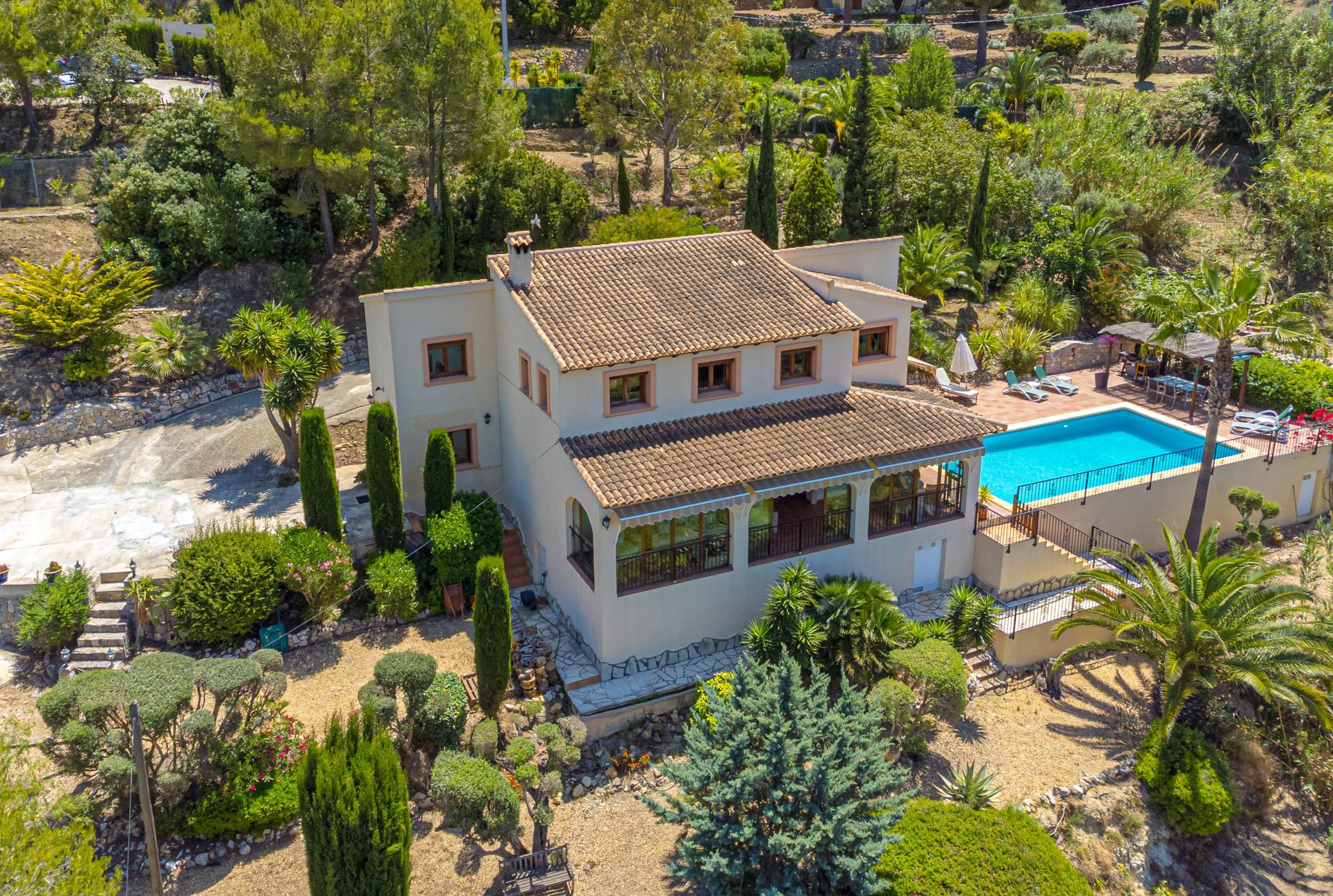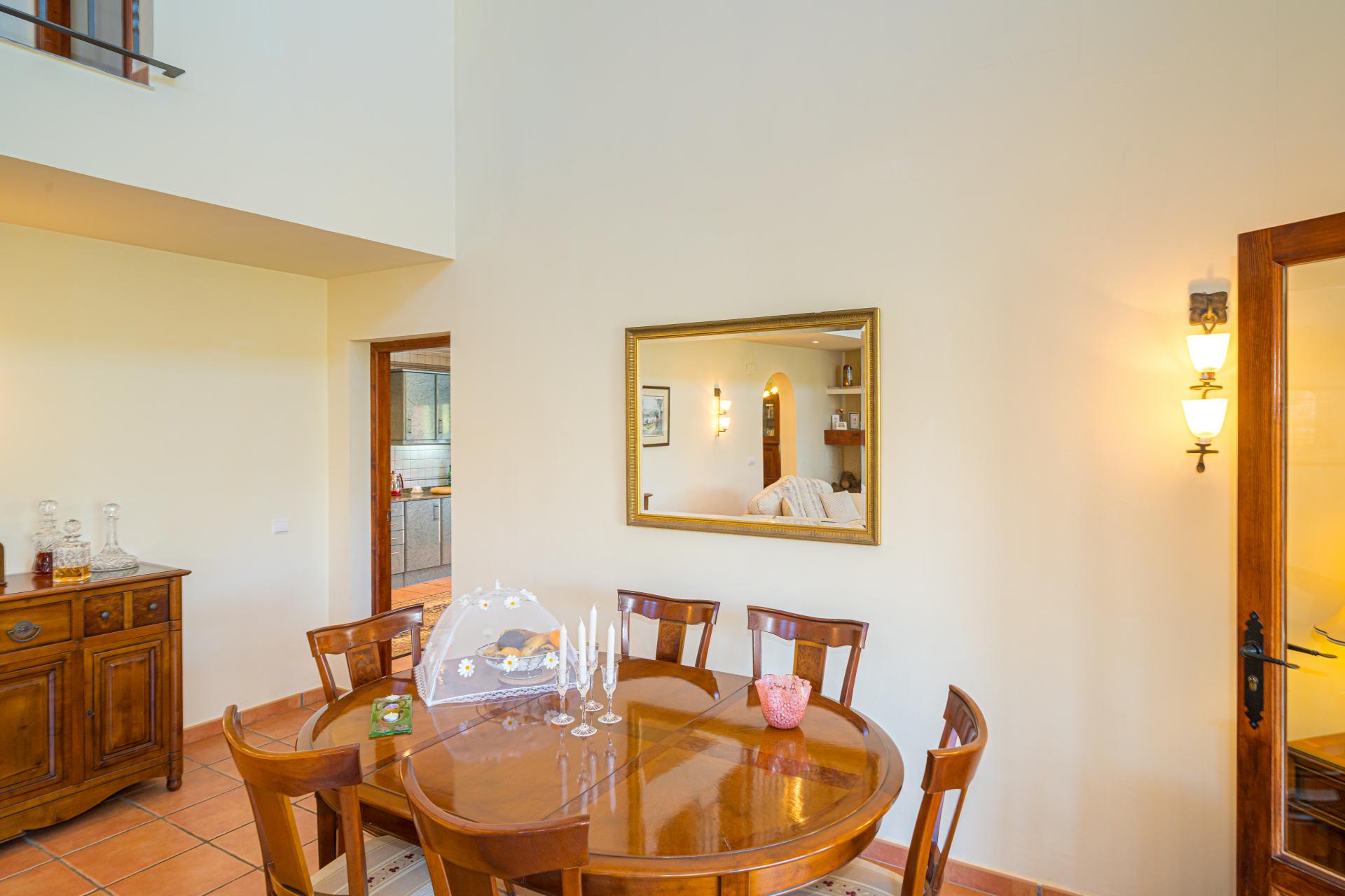 Very private the property is accessed via electric gates with a long drive and ample parking for several vehicles. An impressive main frontage with entrance door opens into the spacious hallway currently used an an office area, the main living area is a wonderful room that immediately catches the eye with it´s double height ceiling and glass expanses allowing the abundant natural light to flood the area creating a welcoming and uplifting ambience and draws the eyes to the statement staircase and upstairs balcony highlighting the overall flexibility of the room to accommodate furniture arrangements for lounging, dining and for hosting gatherings and entertaining as the area opens onto a glazed terrace with additional relax areas to enjoy the fabulous views and which leads to the pool and terracing for that seamless indoor outdoor living, the ample fully fitted kitchen includes an American style fridge freezer, an under sink drinking water filtration system and benefits from an additional casual dining area that opens with door access to the terrace area and pool, there is also a separate utility/laundry room, the wrought iron staircase takes you to the upstairs galleried sleeping area where you will find 3 bedrooms and two bathrooms including the master ensuite bedroom with a separate dressing room.