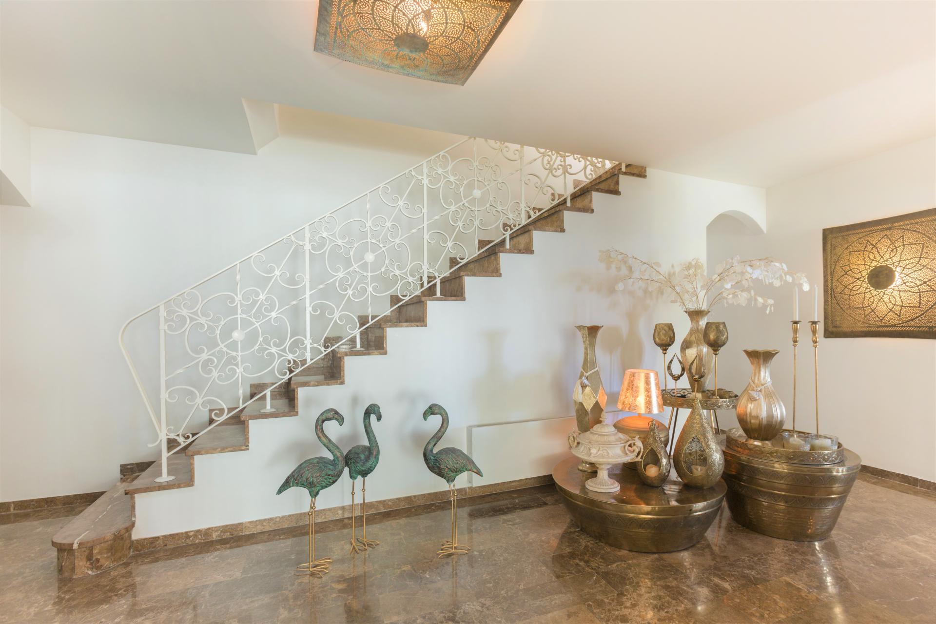Not only does this villa have the most amazing outside facilities but the impeccable and artistically designed décor includes a bespoke Cocktail bar in the reception lounge with an open fire that leads to the formal dining area with dazzling sea views, a sumptuous master bedroom suite with sitting area, a beautifully designed bespoke his and her walk-in dressing room and a magnificent ensuite bathroom with a separate water closet, luxurious interior spaces that also include a home office, mirrored gymnasium, steam room, Finnish sauna and a treatment/massage/beauty room.
