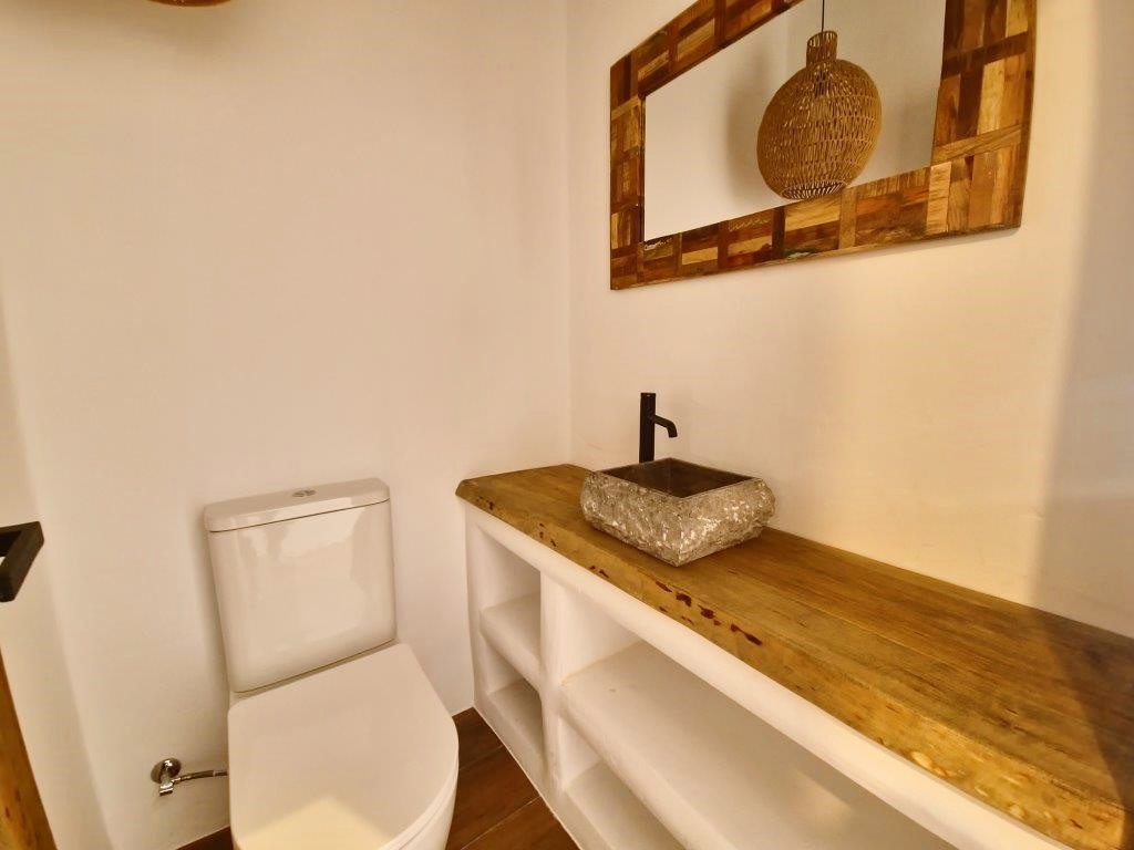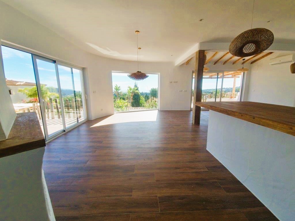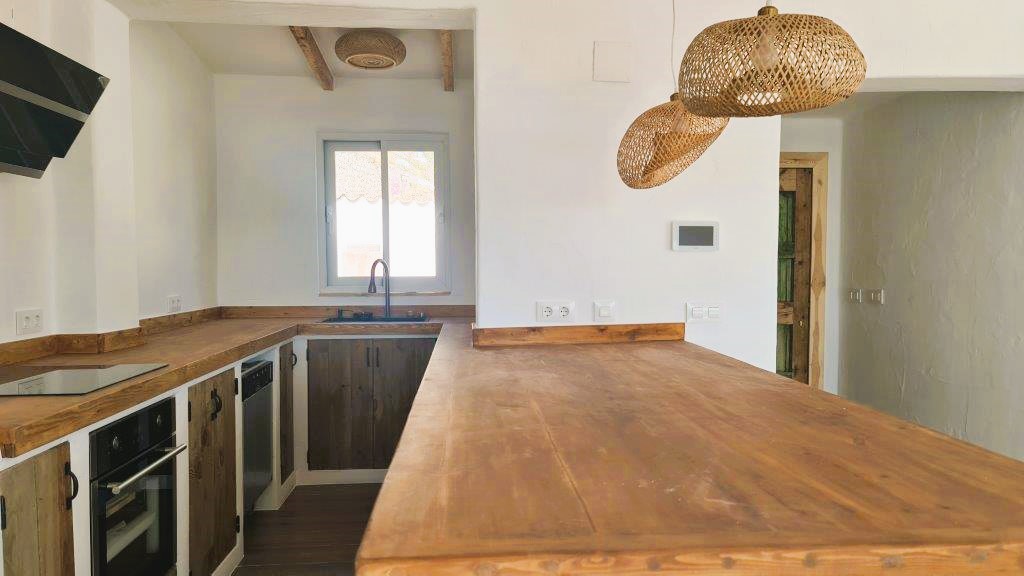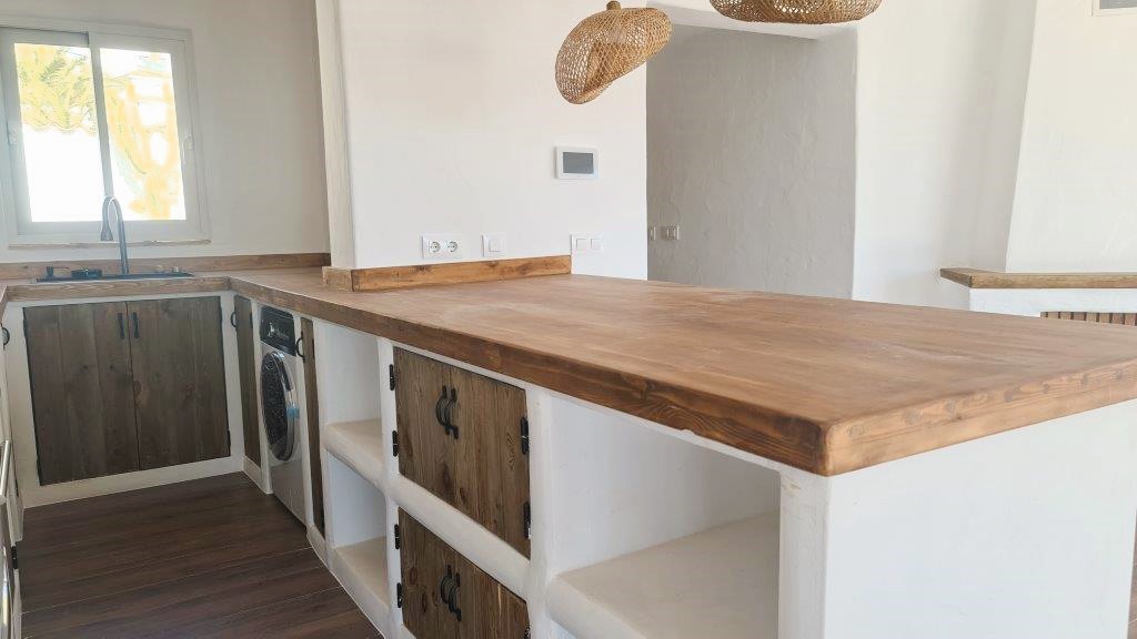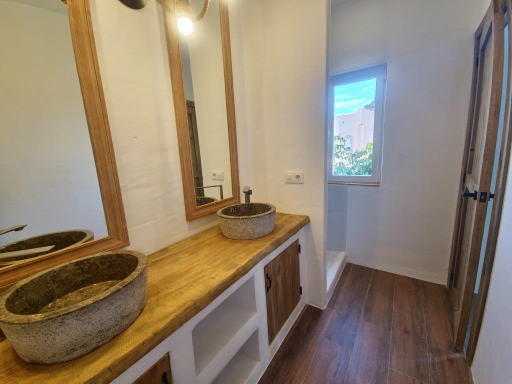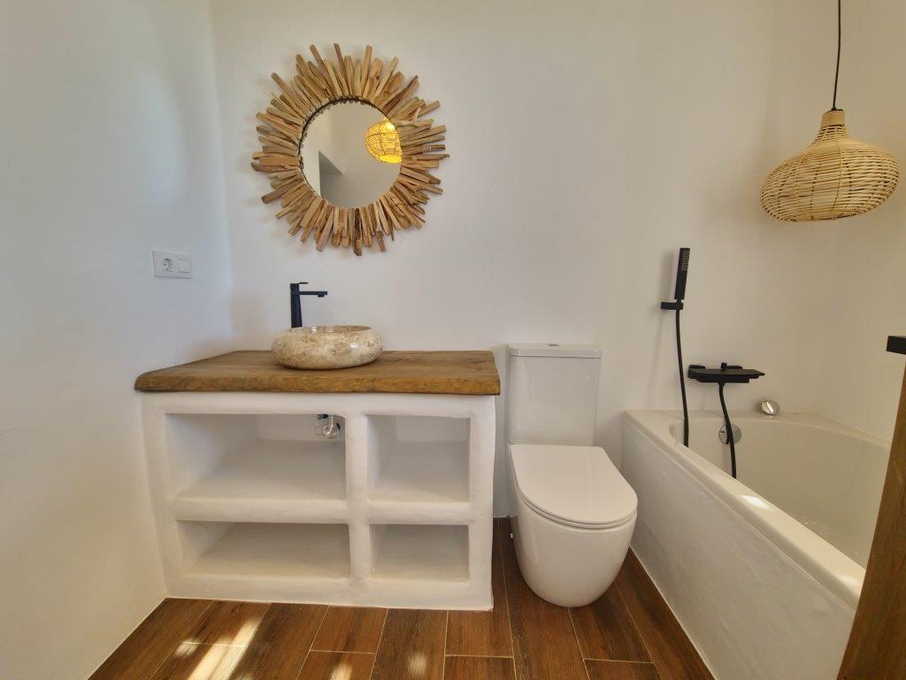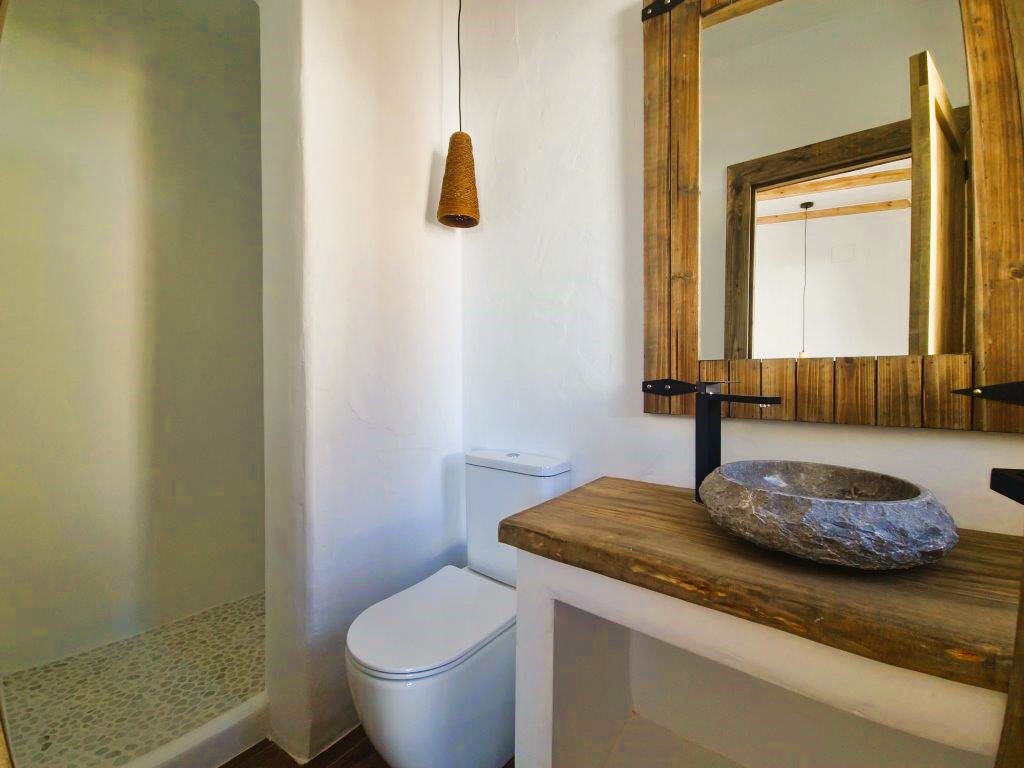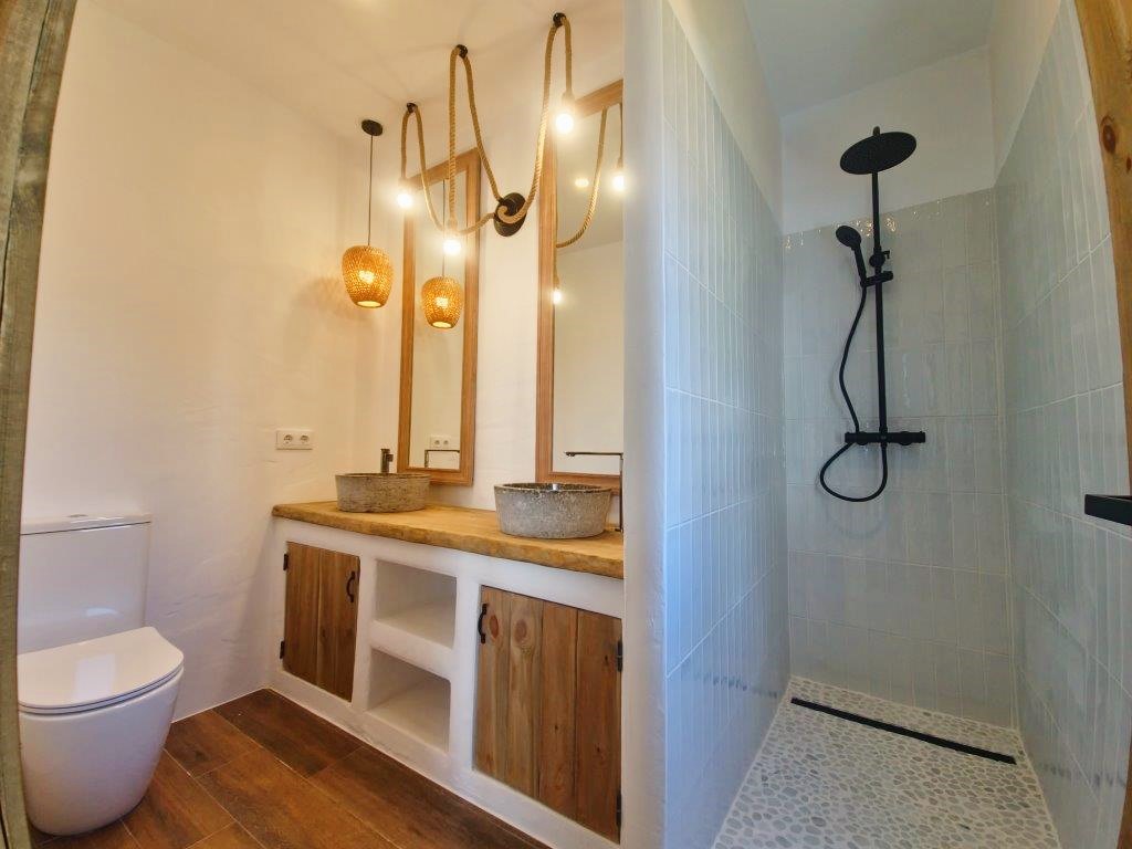 The kitchen seamlessly integrates modern appliances with rustic Ibiza charm, boasting wooden countertops and bespoke shelving. The sleeping quarters provide three ensuite bedrooms with the master suite featuring a walk-in wardrobe. Continuing in the Ibiza style the bathrooms are adorned with natural stone and wood accents and provide either a walk-in shower or bath, catering to every family's needs, there is also the convenience of a guest cloakroom.