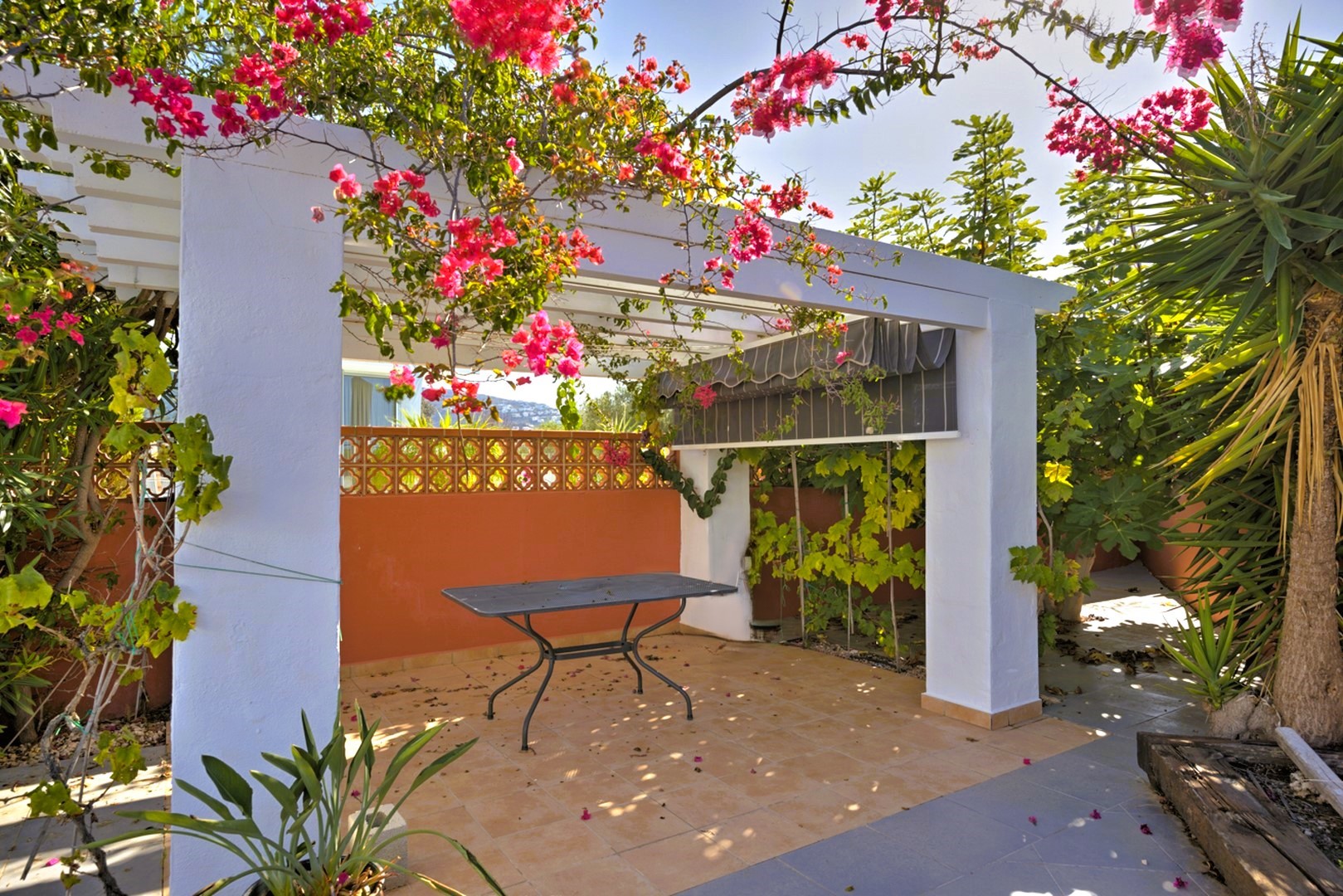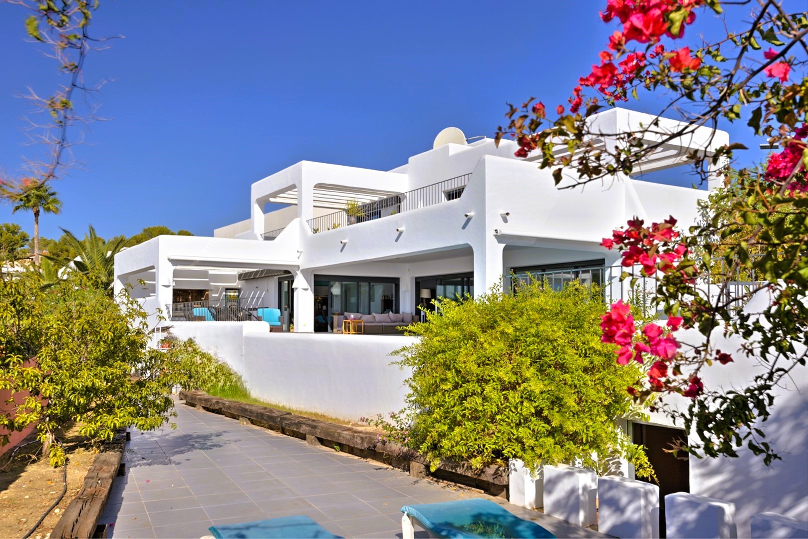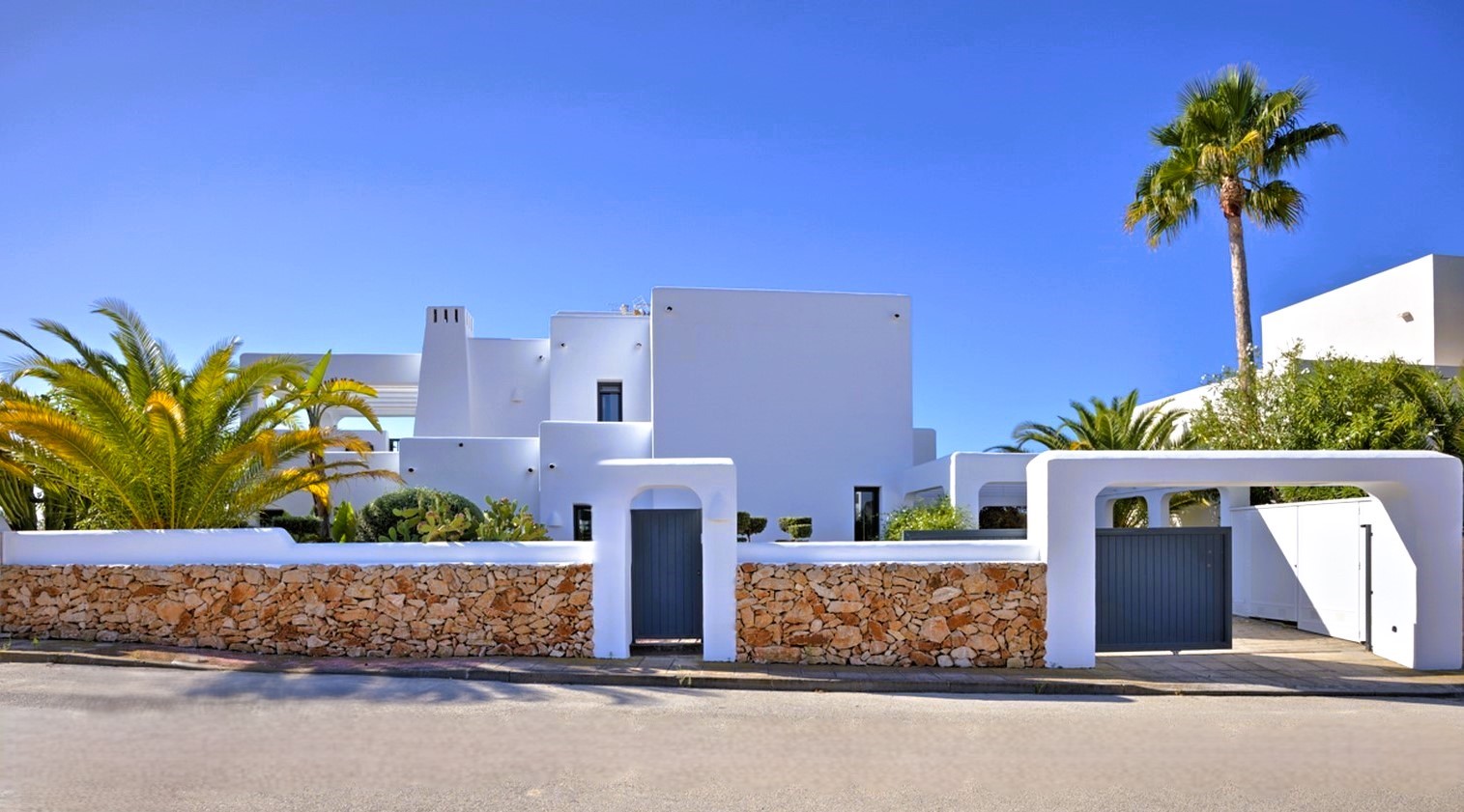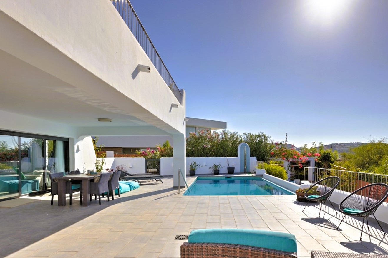 This Ibiza-inspired villa is equipped with modern conveniences including double-glazed windows with electric shutters, mosquito nets, security glass, and an alarm system with security cameras. An electric vehicle gate provides access to a two-car carport, while a pedestrian gate with a videophone adds another layer of security.