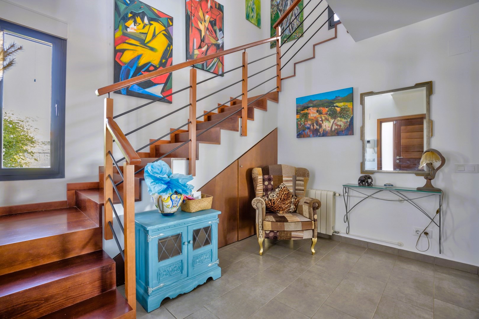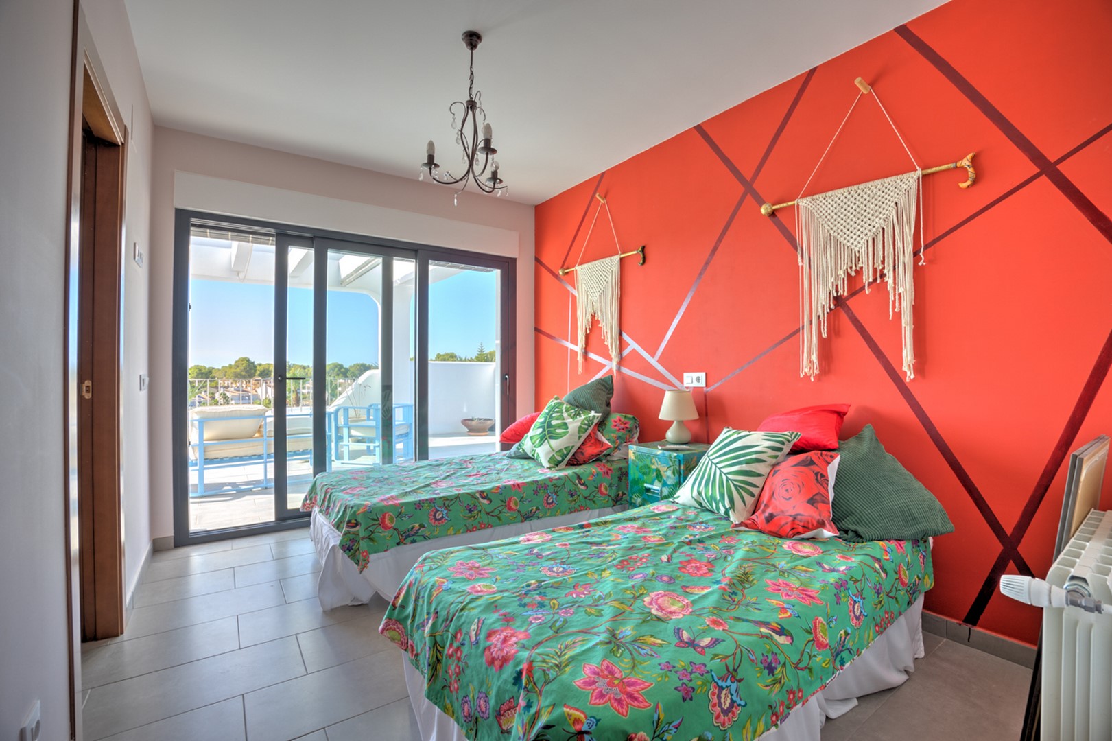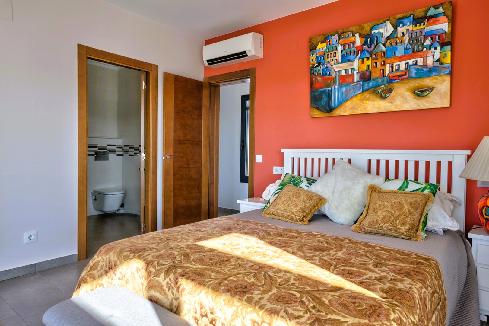 This Ibiza-inspired villa is equipped with modern conveniences including double-glazed windows with electric shutters, mosquito nets, security glass, and an alarm system with security cameras. An electric vehicle gate provides access to a two-car carport, while a pedestrian gate with a videophone adds another layer of security.