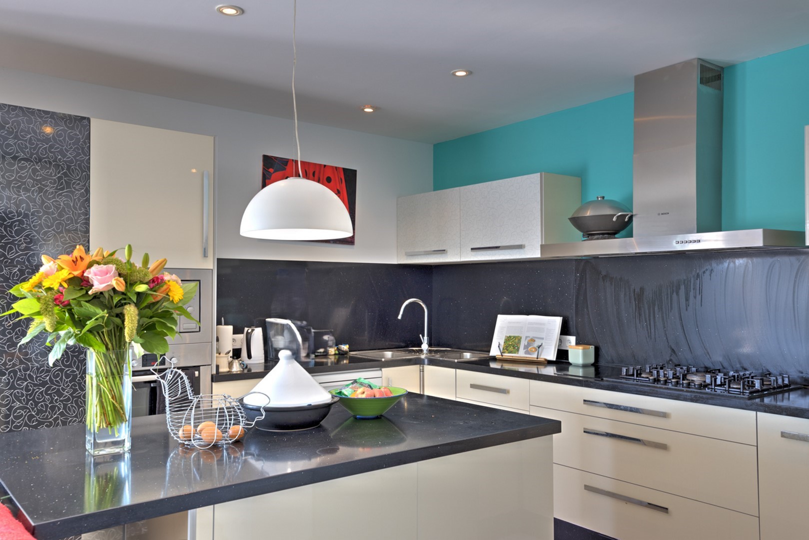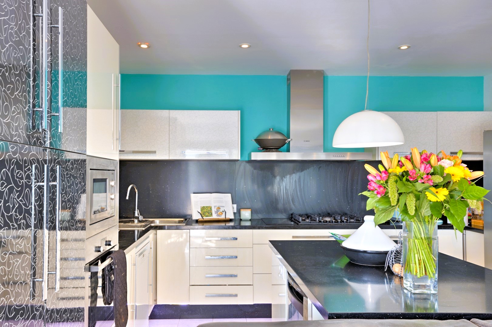 The ground floor comprises a spacious open-plan living and dining area, complete with a stylish feature fireplace and integrated wood burner. The kitchen, fitted with top-tier stainless steel appliances, includes both gas and induction hobs, a wine fridge, and a breakfast bar island. Adjacent to the kitchen is a utility room equipped with additional storage, a second fridge/freezer, washing machine, tumble dryer, and a convenient shower room.