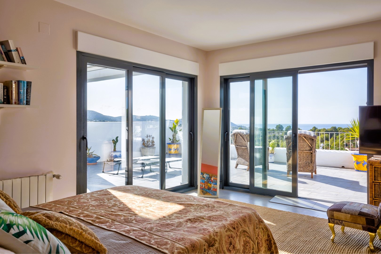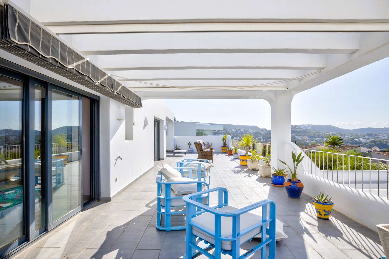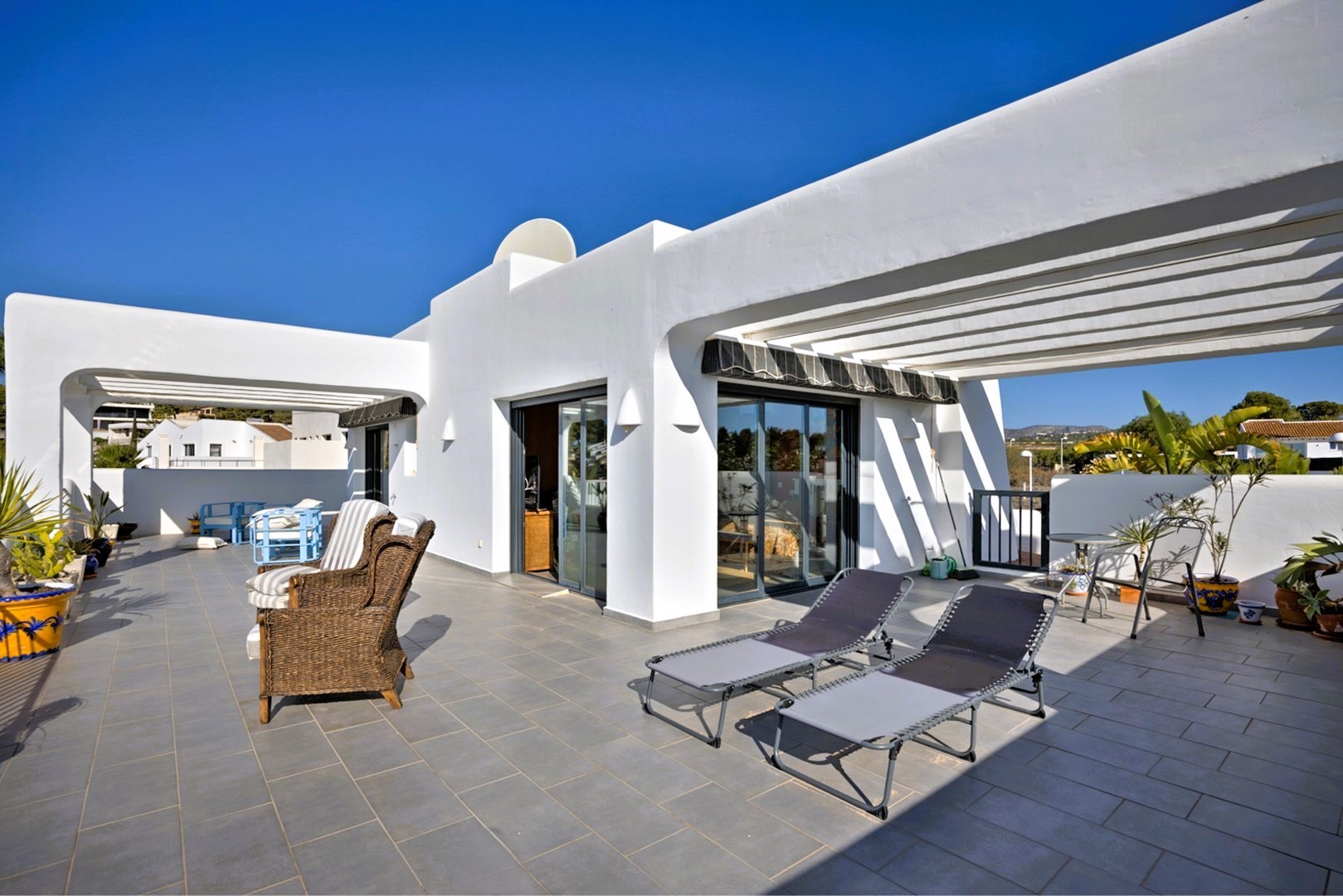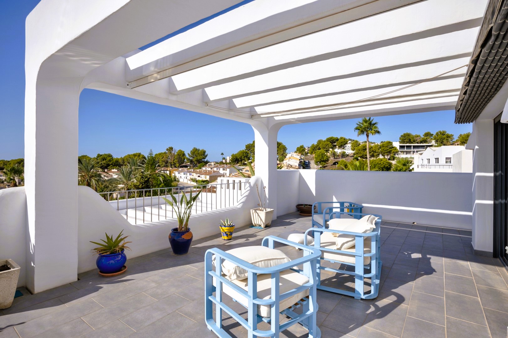 On the first floor, the second master suite includes a modern ensuite bathroom and a private terrace with breath-taking sea views. The third bedroom, located next to the lift, also enjoys access to a terrace and its own ensuite bathroom. Both upstairs bedrooms are shaded by pergolas and awnings, making them ideal for enjoying the summer months. From the first floor, a staircase leads to the roof terrace, where 360º views of the sea and surrounding area can be enjoyed.
