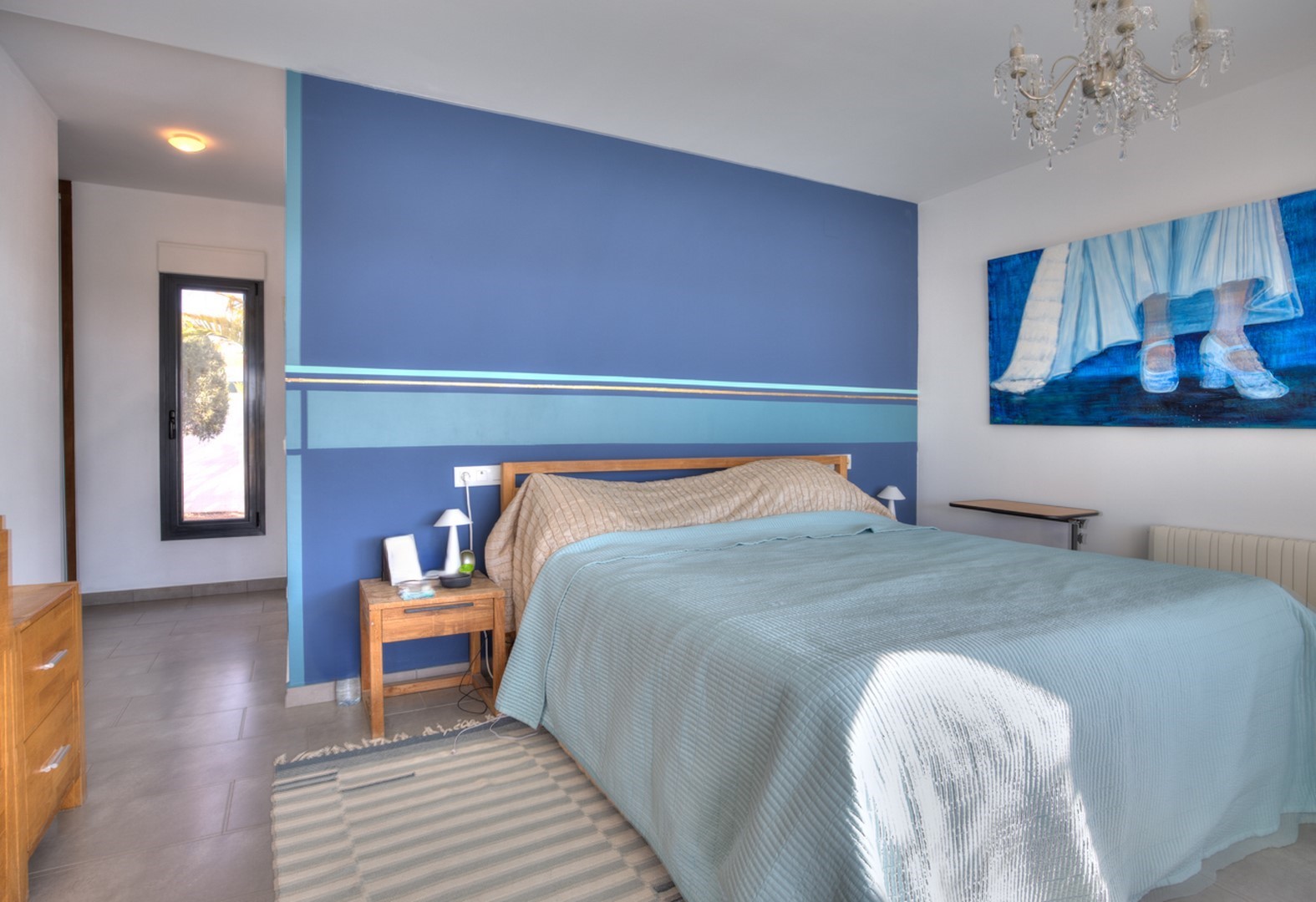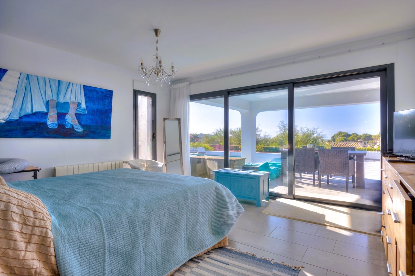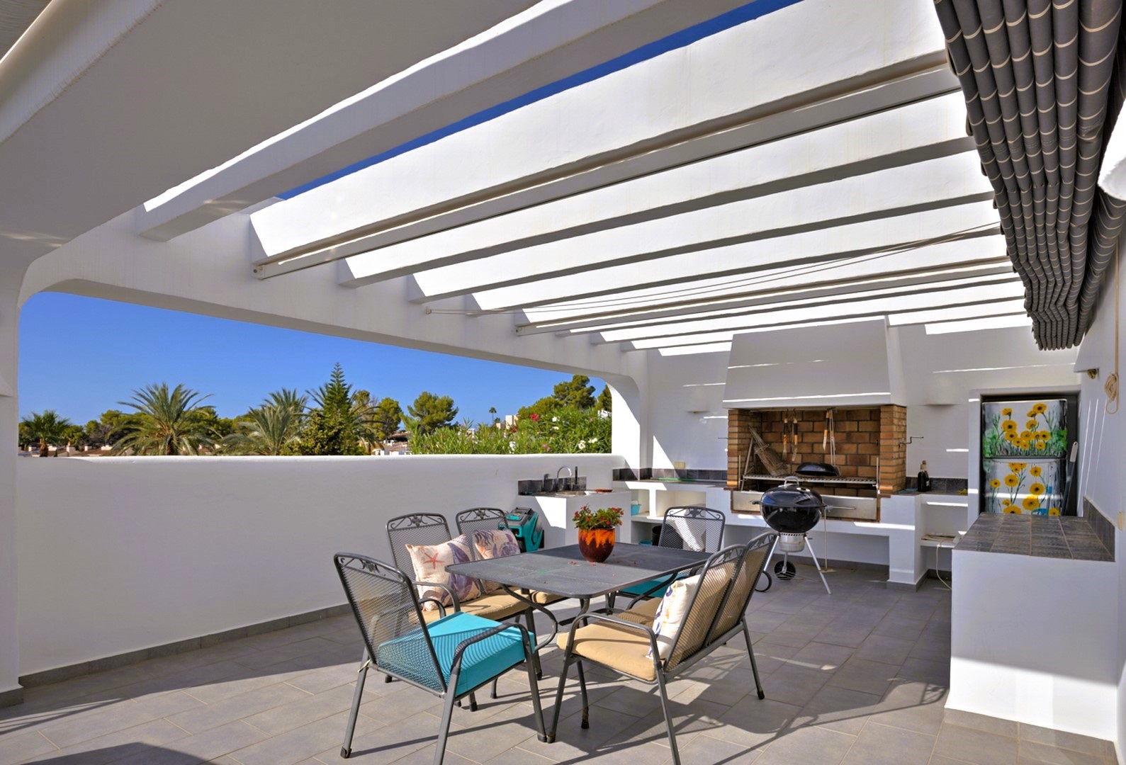 The villa’s outdoor space is designed for both relaxation and entertainment. The 9 x 4m pool is surrounded by a spacious terrace, offering plenty of room for sun loungers and an outdoor shower. The summer kitchen, located next to the main kitchen, is perfect for alfresco dining, featuring a pergola and electric awning for adjustable shading. Additional dining spaces can be found throughout the garden, including a separate pergola surrounded by fruit trees. The low-maintenance garden is landscaped with palms, Mediterranean plants, and olive trees, contrasting against the villa’s bright whitewashed walls. Additional outdoor features include a wooden garden shed, a pool technical room, and a ramp leading to a versatile underbuild, currently used as an art studio and storage area.