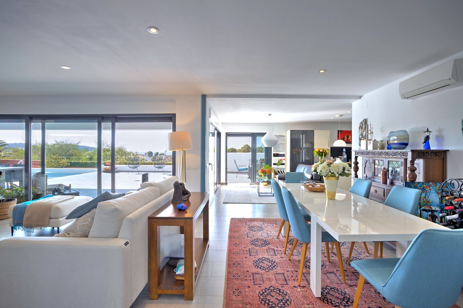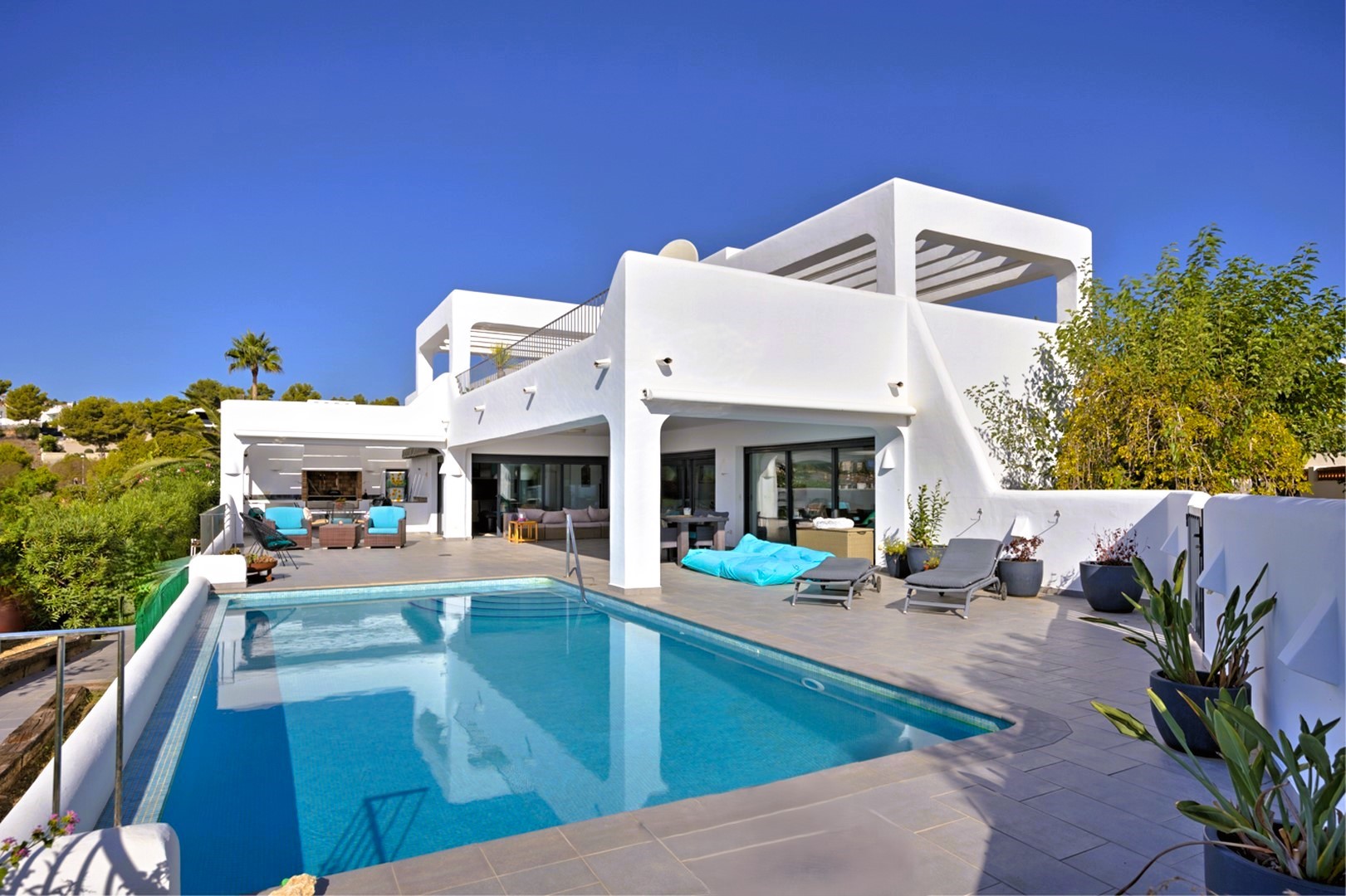 PROPERTY DETAILS This Ibiza inspired villa captures the essence of Mediterranean living, located in one of Moraira’s most prestigious areas. Situated on a flat plot just a short distance from the beach and town centre, the villa boasts spectacular sea views, elegant architecture, and high-end finishes throughout. Designed for both relaxation and entertainment, it offers expansive outdoor living spaces, landscaped gardens, and a private pool, making it a true coastal oasis.