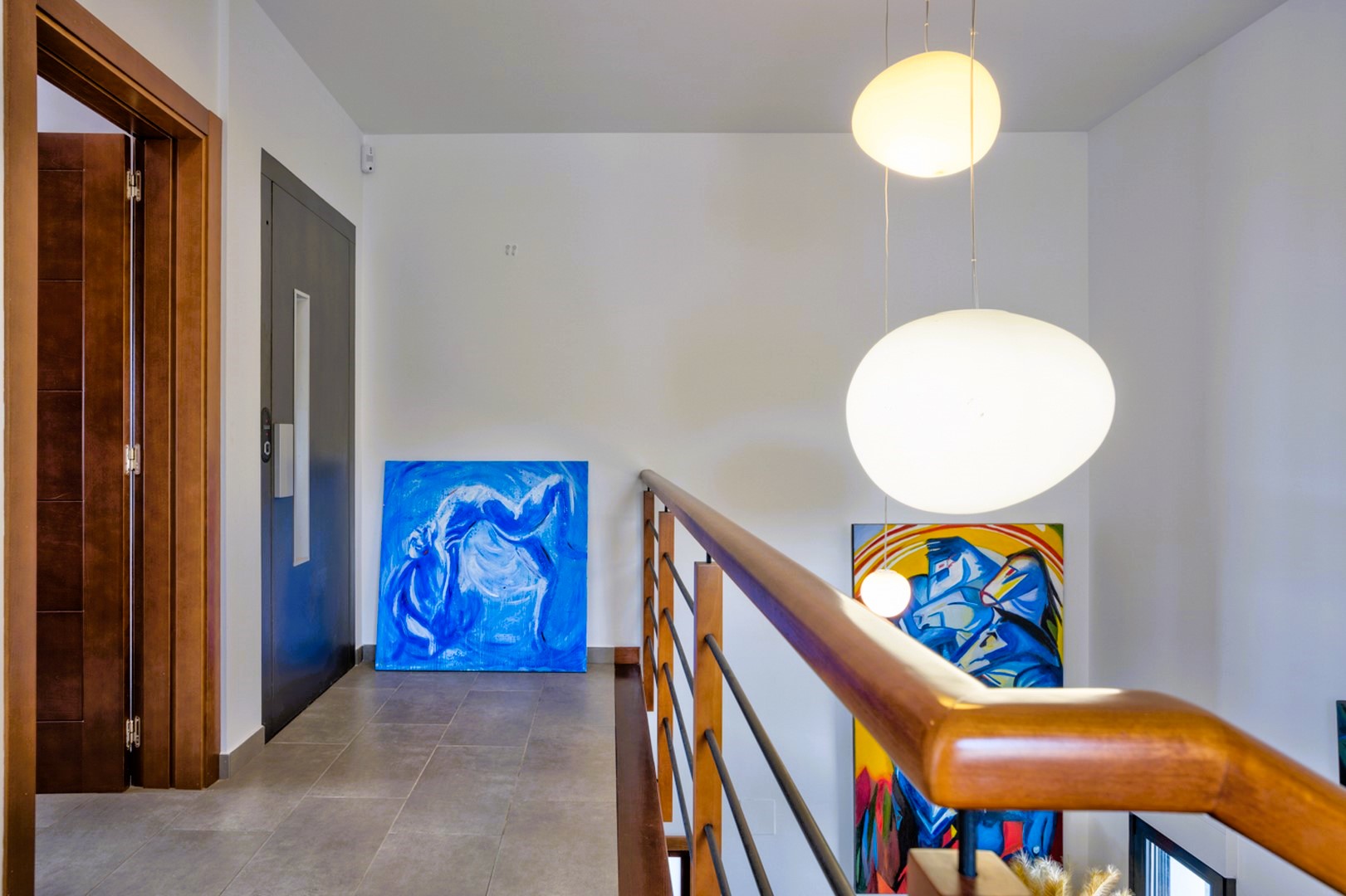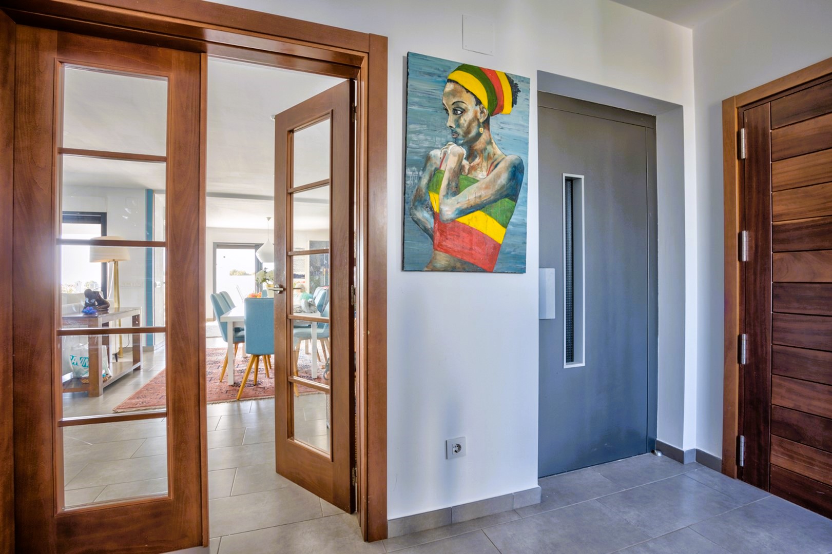 Upon entering, you are welcomed by an impressive double-height entrance hall, featuring an elegant wooden staircase and lift access to both floors. The villa’s layout seamlessly blends indoor and outdoor living, with large glass doors opening onto the pool terrace from the main living spaces.