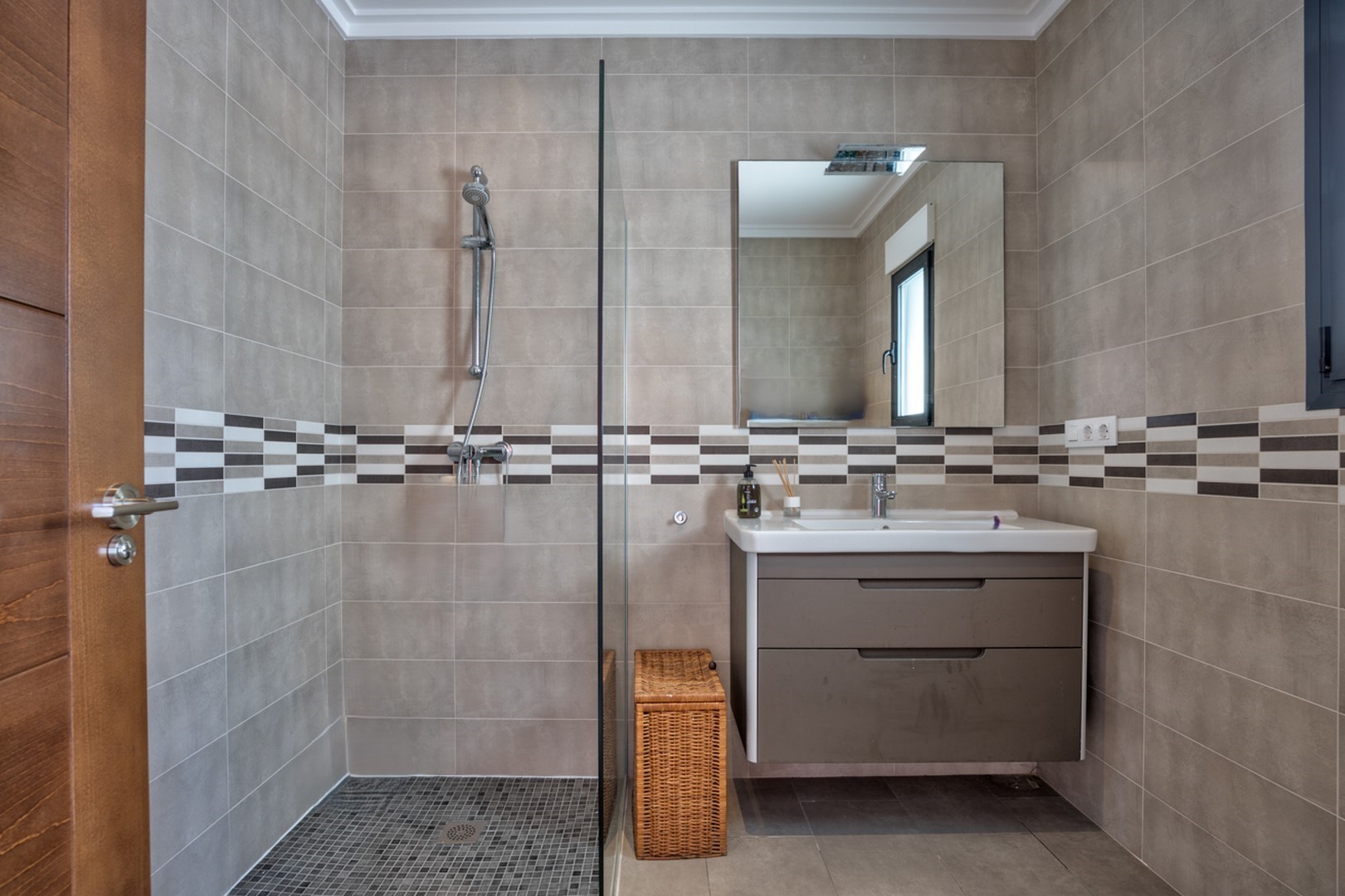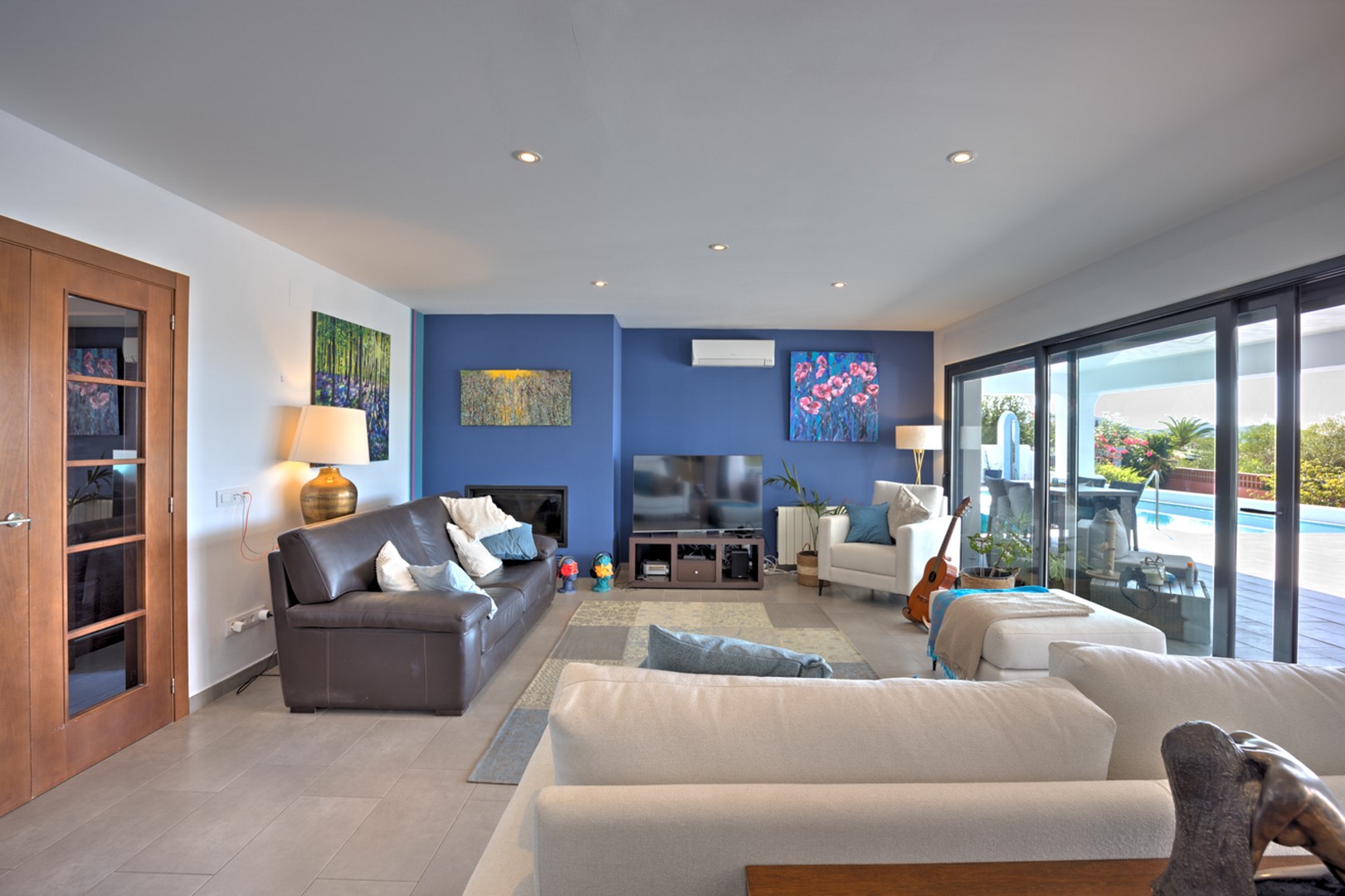 The villa boasts two master bedrooms. The ground-floor master suite features a large dressing area, an ensuite bathroom with a walk-in shower, and sliding glass doors leading to the pool terrace, allowing for seamless indoor-outdoor flow. An additional glazed doorway leads to a home office, which can easily be converted into a fourth bedroom.