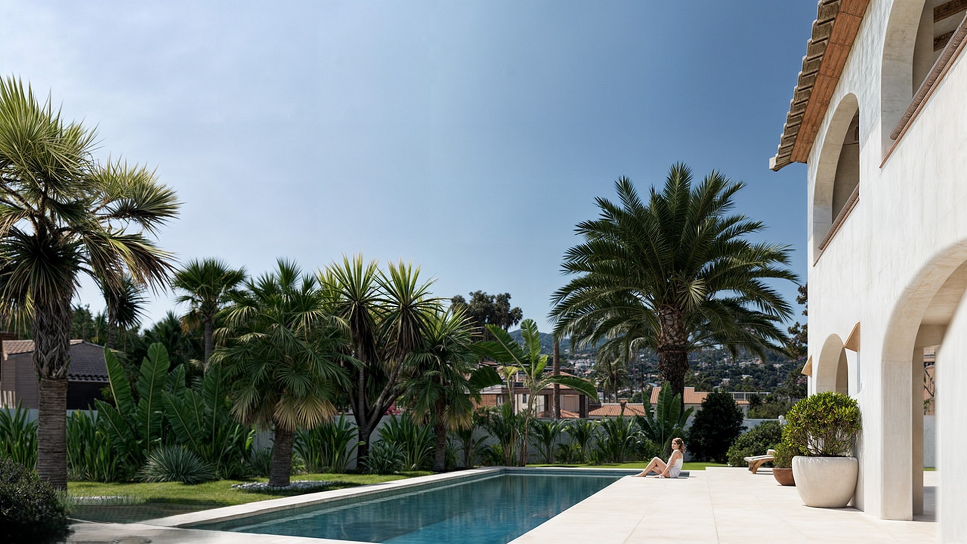 Outdoor Living Set on a fully enclosed and level plot of 1,036m², the villa is surrounded by lush Mediterranean planting and features an automatic irrigation system for effortless maintenance. The southwest-facing garden centres around a striking 10m×5m private pool, bordered by a large sun terrace ideal for soaking up the sun. Two generous covered terraces (40m² and 43.56m²) offer shaded retreats for dining, relaxing, or hosting guests. A staircase from the upper porch leads to a spectacular roof solarium with with 360° views.