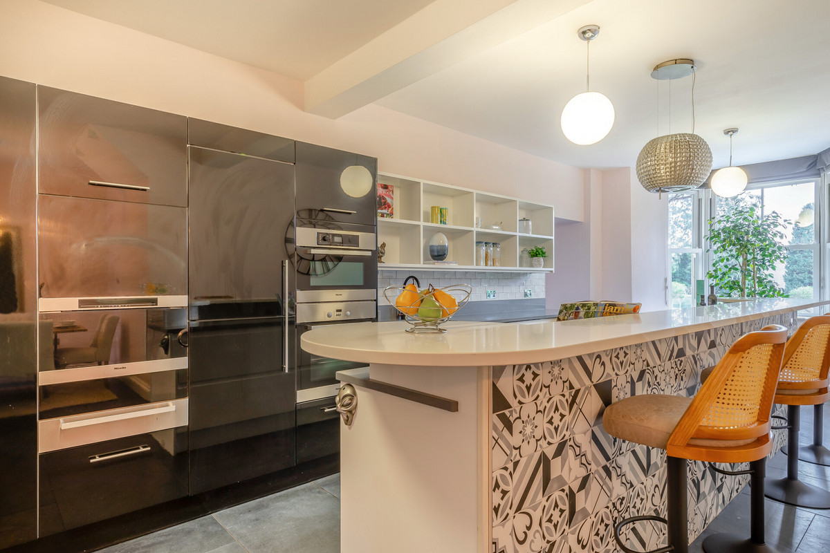 The heart of the home is the sleek kitchen/dining room, fitted with high-quality Miele appliances, a breakfast bar, and a charming bay window. This versatile space is perfect for family meals or entertaining guests. A utility room, boot room, and cloakroom connect to a rear courtyard with pedestrian access to Walton Street.