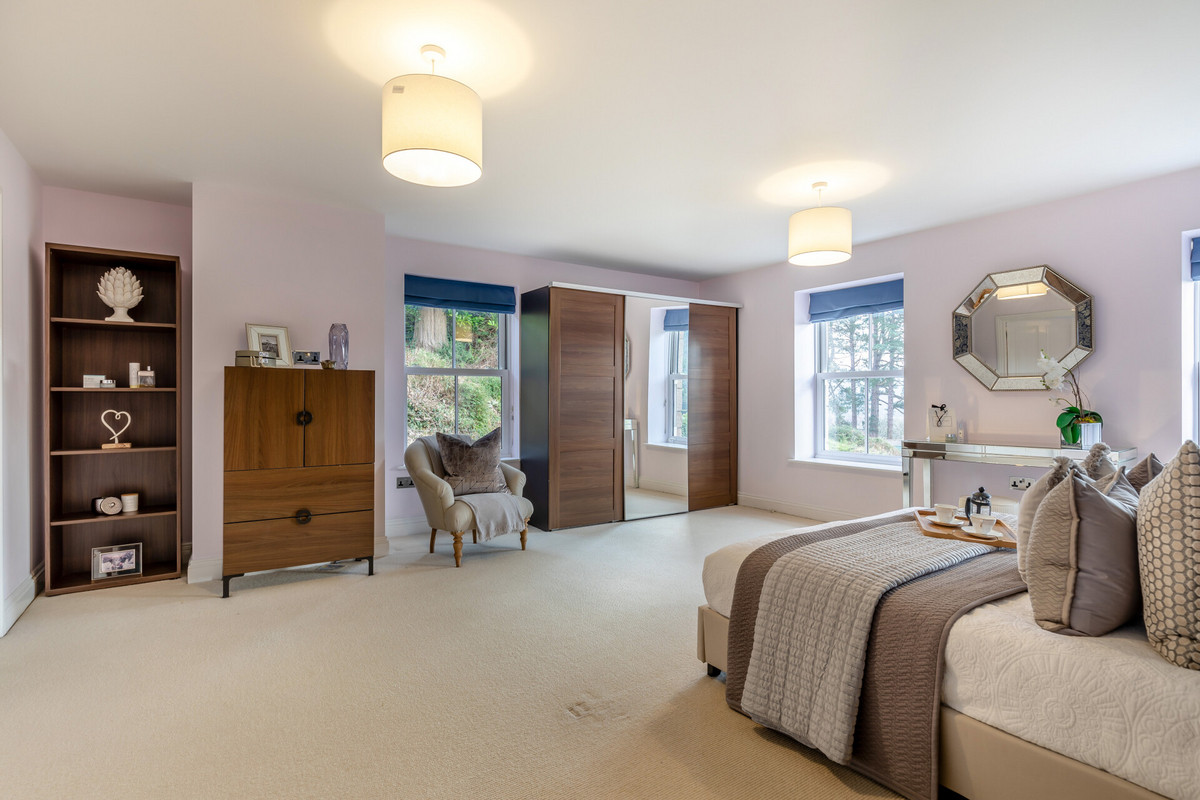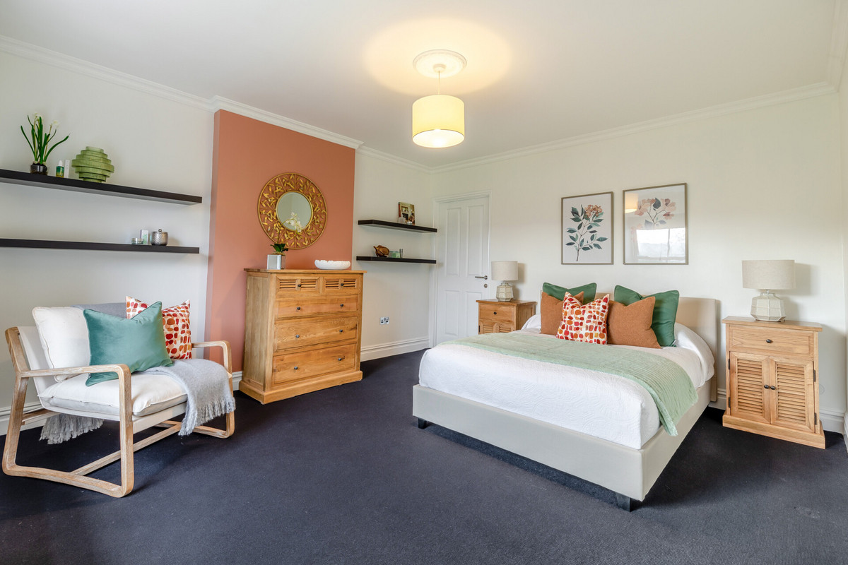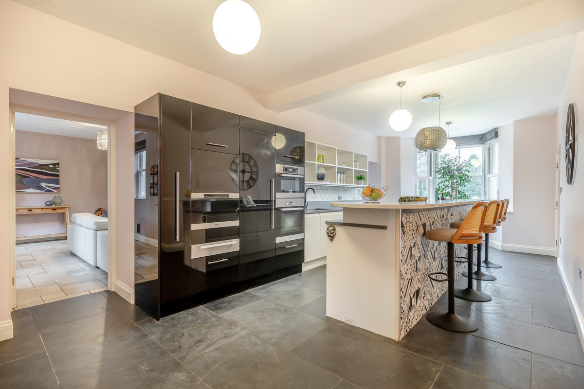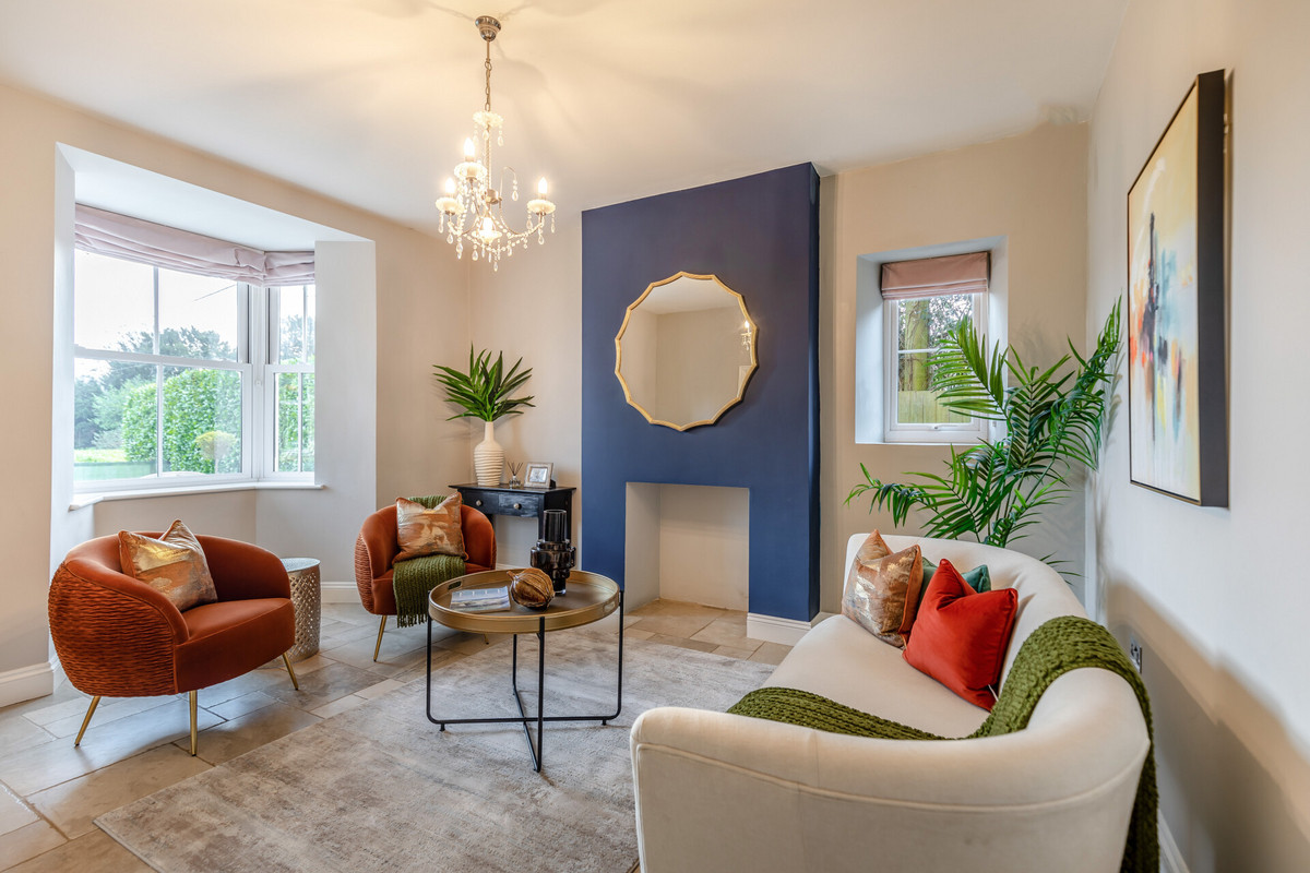 The reception room, designed for both comfort and entertaining, features a stunning open ‘floating’ fireplace, French doors, and another bay window, creating a refined yet inviting atmosphere.